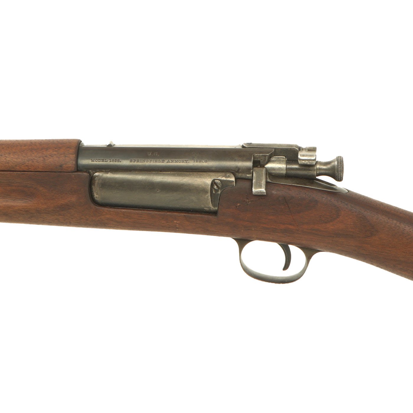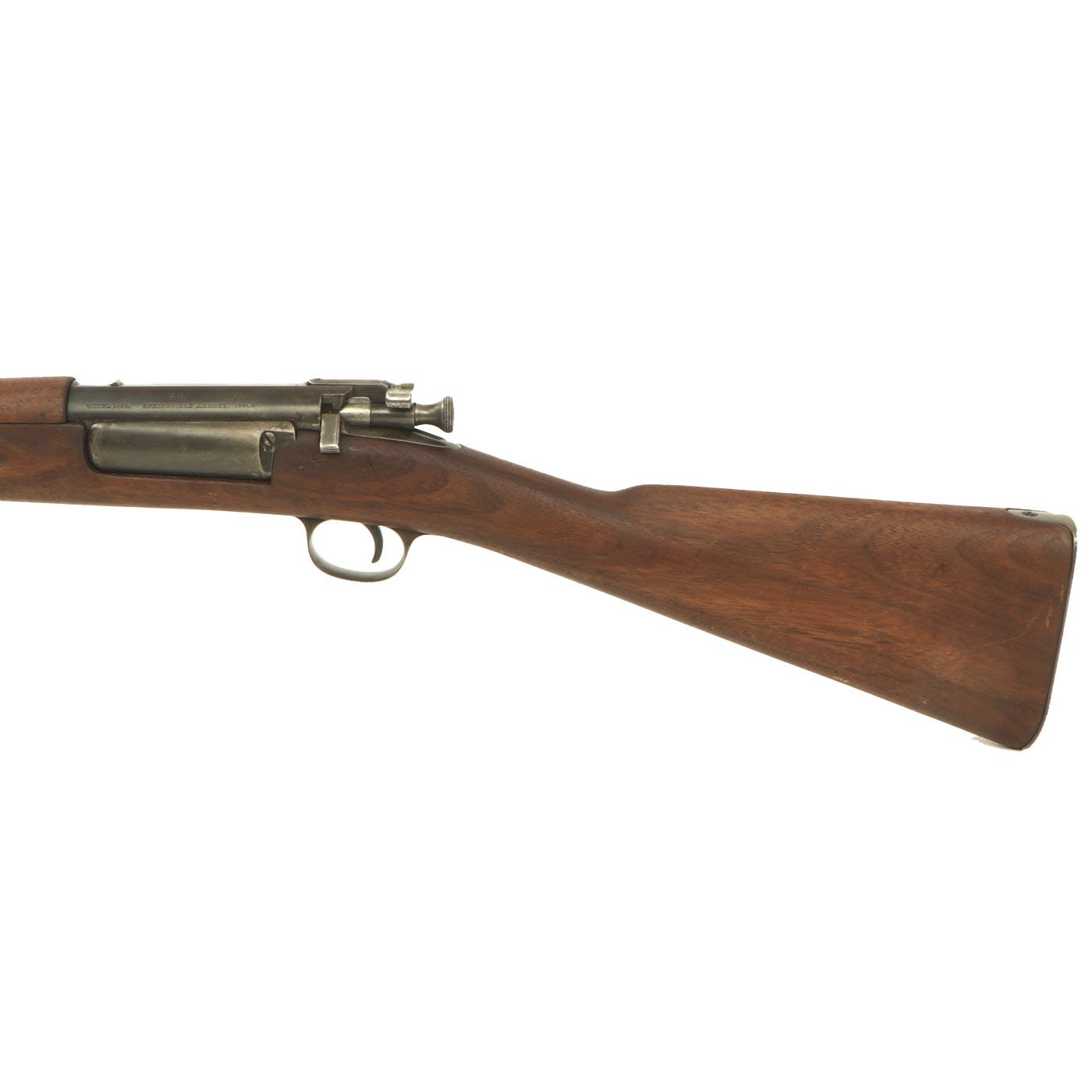 It measures approximately 41 inches (1,042 mm) in overall length with a 22-inch (560 mm) barrel. The The Springfield Model 1892–99 Krag–Jørgensen rifle is a Norwegian-designed bolt-action rifle that was adopted in 1892 as the standard United States Army military longarm, chambered in U.S. caliber .30-40 Krag. All versions and variants were manufactured under license by the Springfield Armory between 1892 and 1903 and famously served as the longarm during the Spanish–American War. Although Krags were popular, unique and efficient, the side loading gate mechanism was slow and cumbersome to reload in combat compared to the clip loaded Spanish Mausers the Krag was up against.