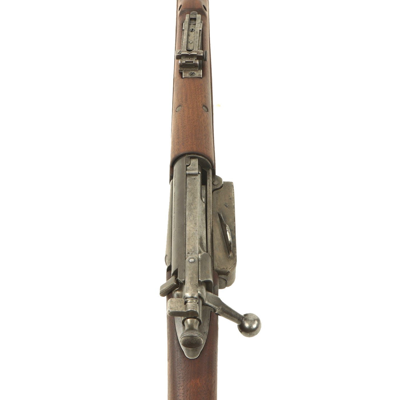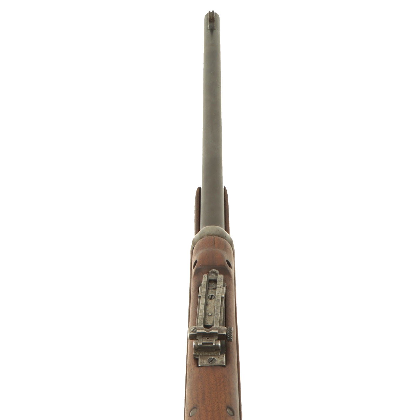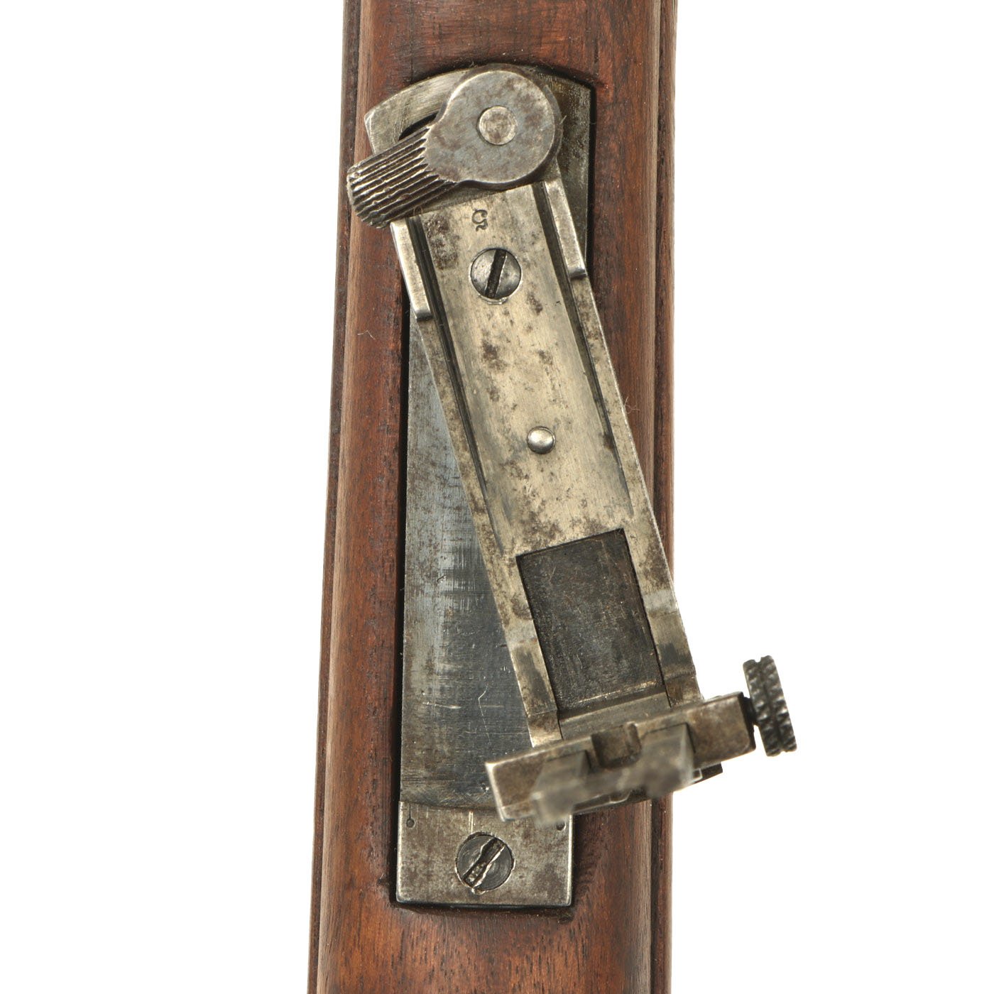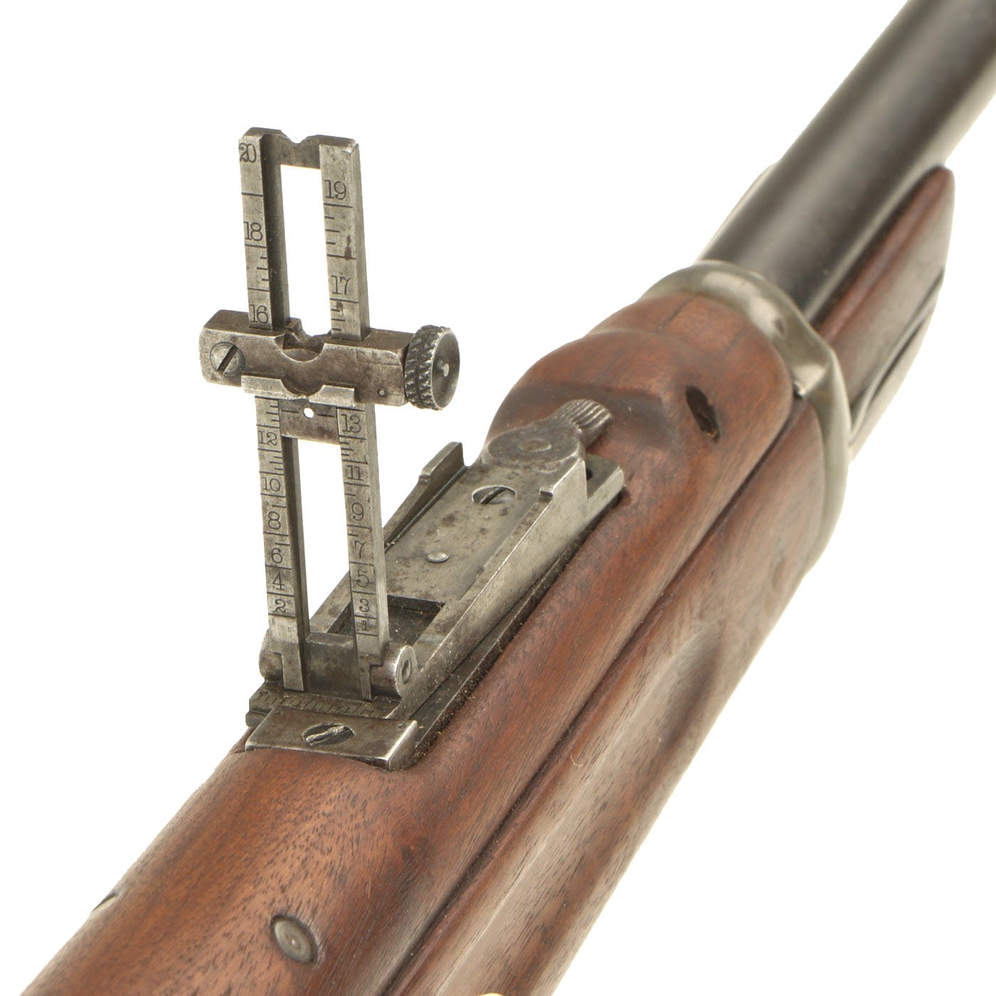 Metal condition is good, with most of the original finish present, and just a bit of wear and oxidation on the contact points. The stocks on this example are in great shape, even the handguard, which is the correct M1901 pattern for the rear sight. It looks like the entire stock was replaced when this rifle had the sight upgraded, so there are no cartouches visible. This also explains the great condition that the wood is in.