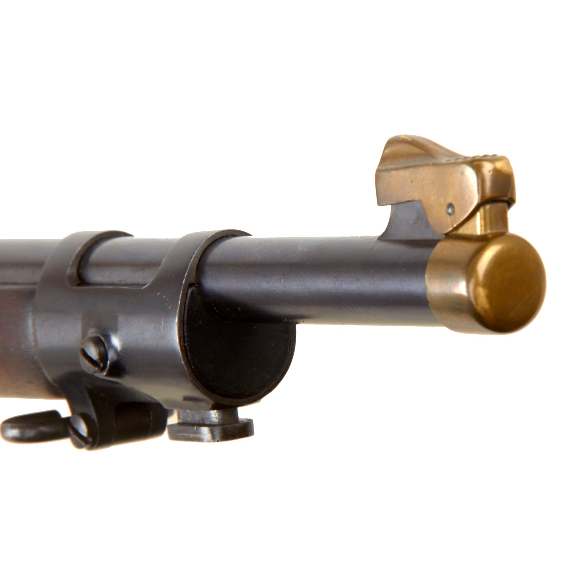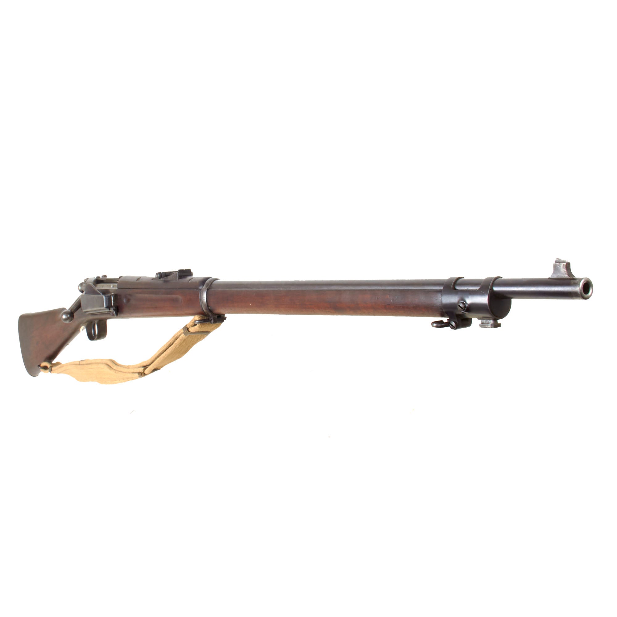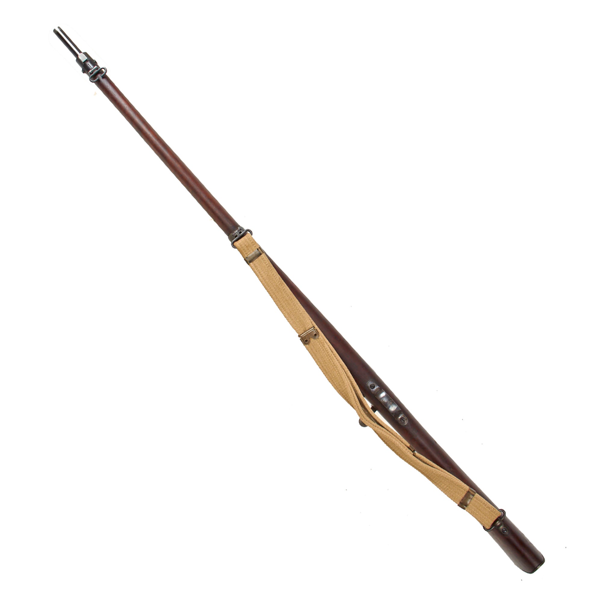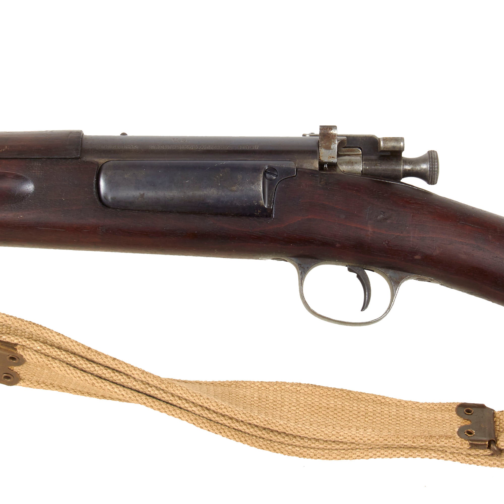 To make this offering even better, it is fitted with a rare Mills tropical web sling for the Krag, which has the correct PAT. MILLS & ORNDORFF marking on the end clips, which are very similar to those on a British web sling. It still retains both brass sliders, and is in great shape! There is even a brass muzzle cover on the barrel! This is really a full set up, perfect for any Spanish American War Era display!