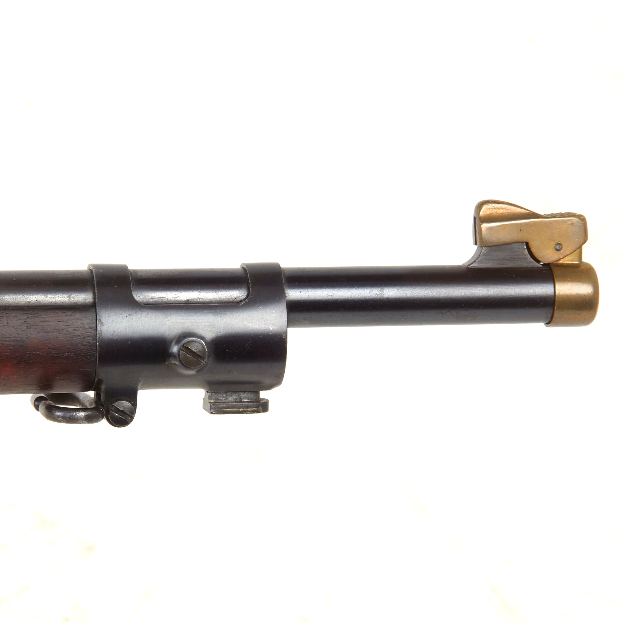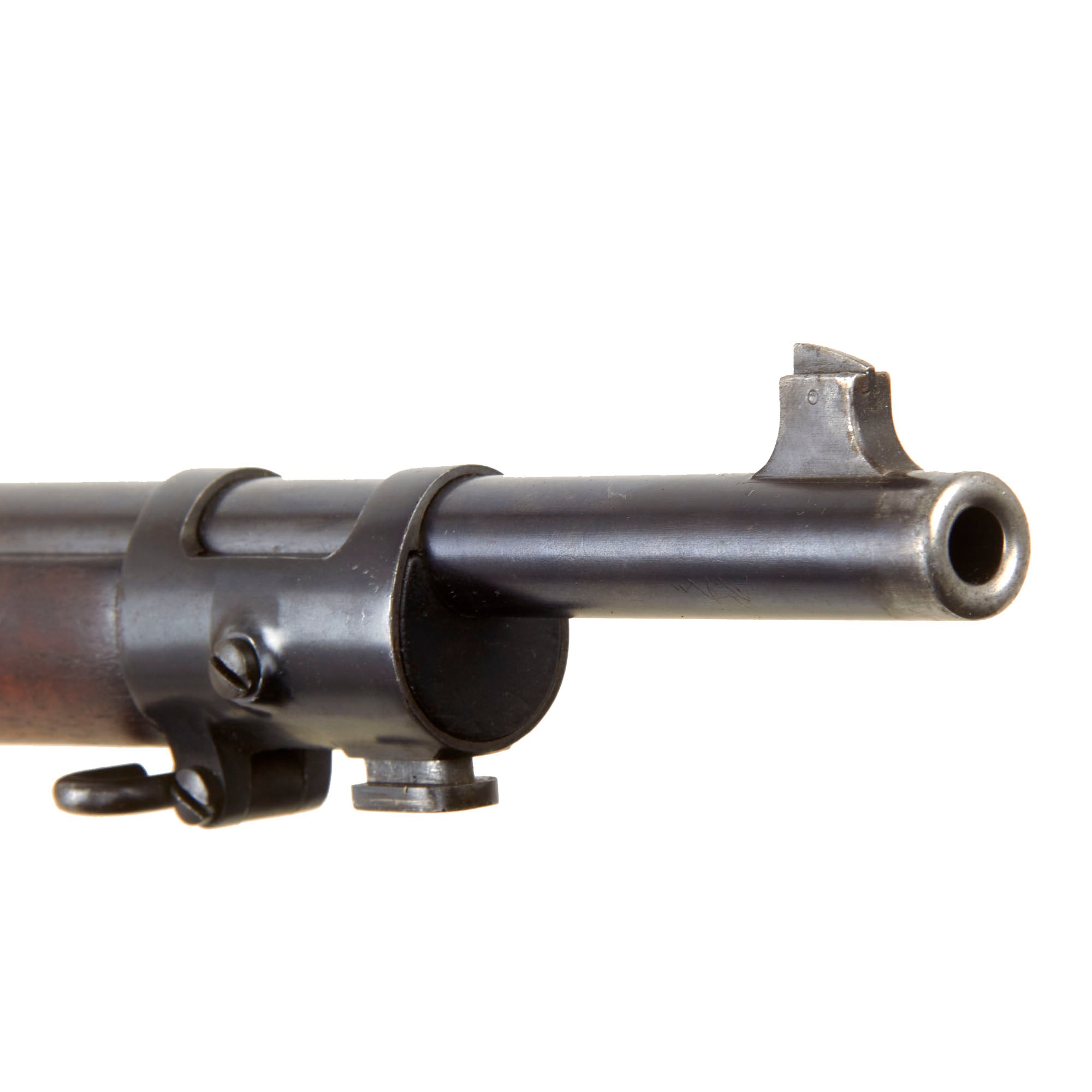 Condition is very good with a lightly worn mottled gray patina to the receiver area, while the barrel still retains much of the original blued finish. The bolt has the same mottled look as the receiver, as does the ejector on top, and the butt plate is in a similar condition, with just a bit of peppering. The stock is in very good condition, with a lovely red-brown walnut color, and small dings and scratches from service, but no major damage or repairs that we can see. We can even see a good amount of flame figuring in areas, making it highly attractive. Both sling swivels and the stacking swivel are present and in good shape. Action works smoothly and all components have a nice finish, with slight oxidation on the bright areas. The bore is in very good condition, showing a bright finish with clear lands and grooves. However there definitely is some wear, as well as removed past oxidation, so this is definitely a rifle that saw a good amount of service.