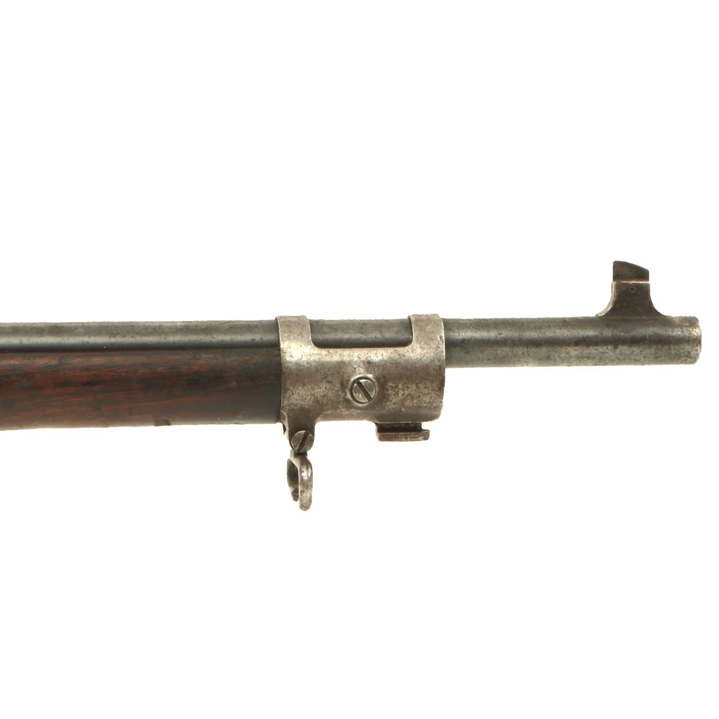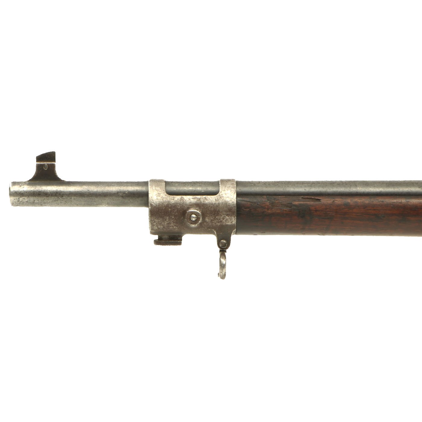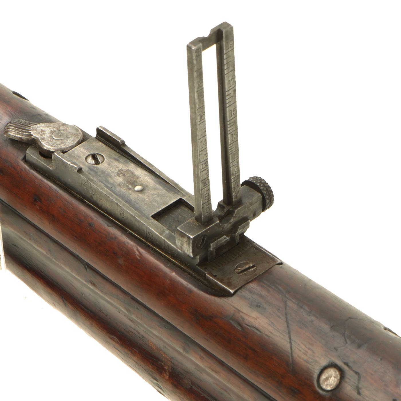 Research reveals that serial number 114516 dates the time of manufacture to about June of 1898, which is the last month of U.S. fiscal year 1898. Government records indicate that the last serial number made in June 1898 was 116146. This rifle was definitely made in 1898, and considered Antique. The stock is fitted with a M1896 solid smooth buttplate with a curved toe and butt-trap. The handguard meets the front edge of the receiver fitted with an updated M1901 pattern rear sight. This indicates that most likely the rifle was returned to arsenal at some point for a refit. These are very desirable as a U.S. military service rifle as most of these rifles saw heavy use in the Spanish-American War and early 1900s until the development of the M1903 rifle.