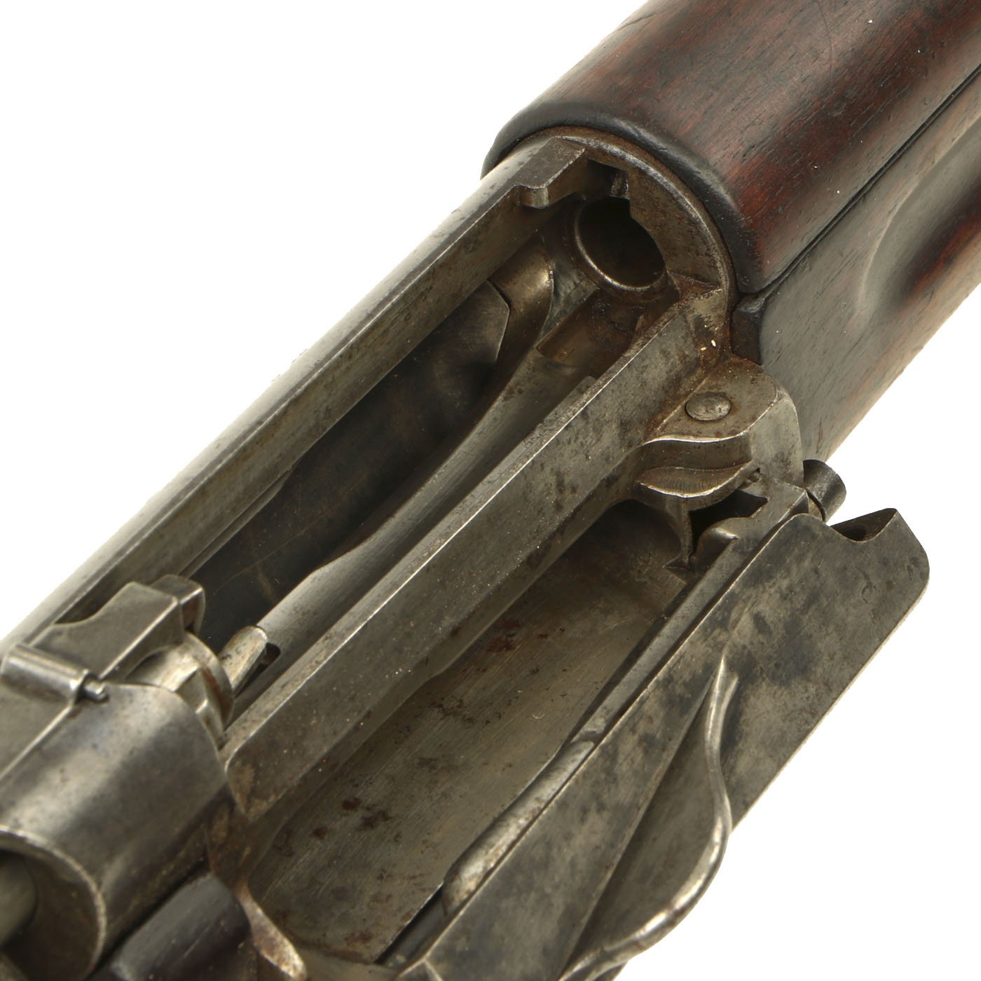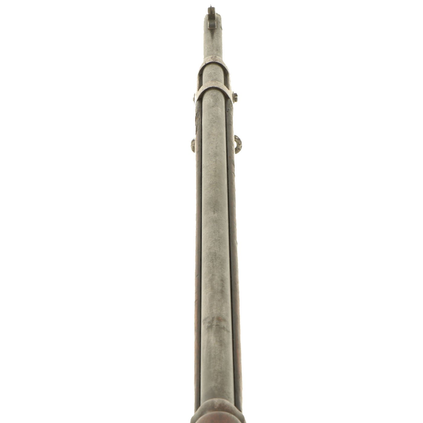 Both sling swivels and the stacking swivel are present and in good shape. Action works smoothly and all components have a nice finish, with slight oxidation on the bright areas. Bore shows clear lands and grooves, with a partly bright finish, and some wear. The grooves are somewhat dull, and show fouling.