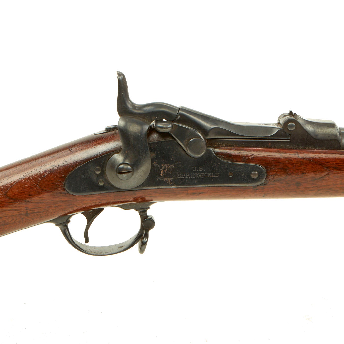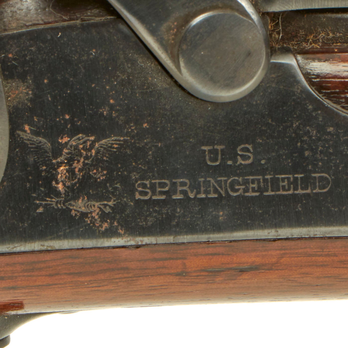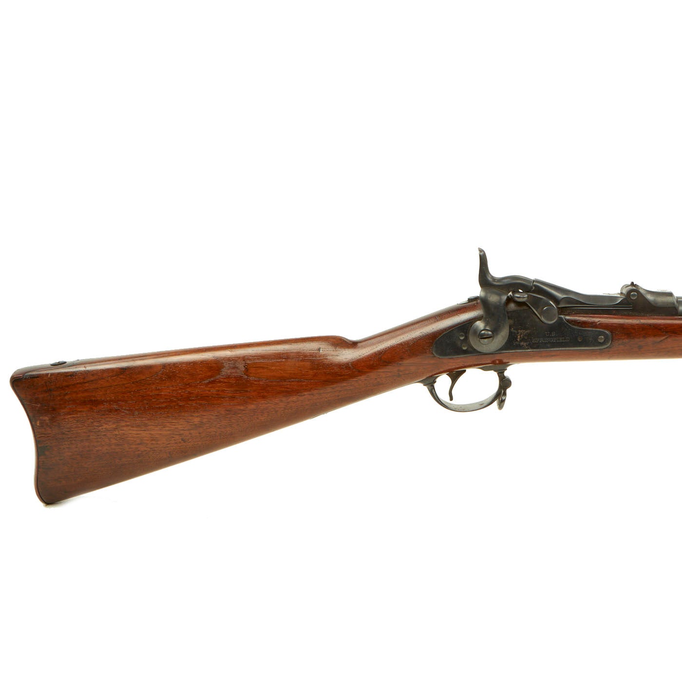 The two barrel bands are correctly U marked, though the U.S. on the butt plate tang was removed during restoration. Center fire breechloader, .45 cal., two bands, two sling swivels with stacking swivel, Buffington sight, and standard ramrod. Lock is marked with an eagle and U.S. / SPRINGFIELD, manufactured by Springfield Armory, Springfield Massachusetts.