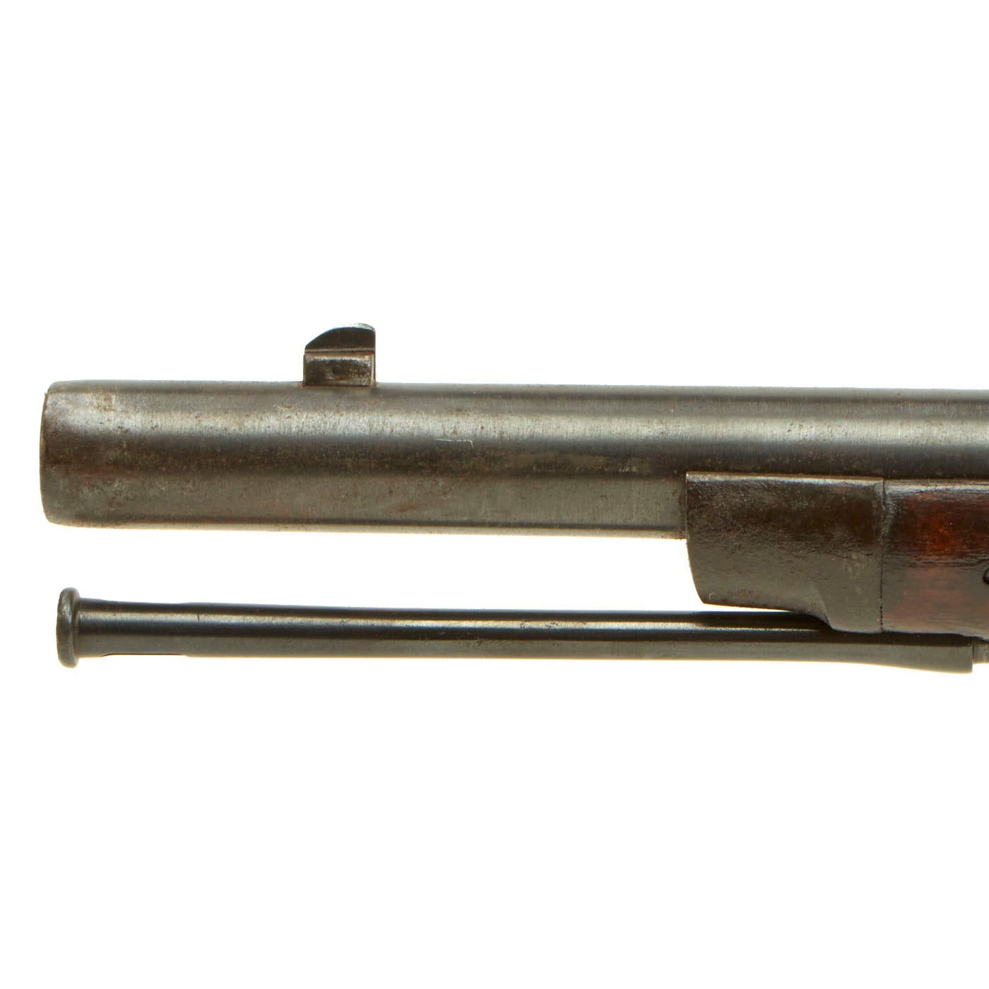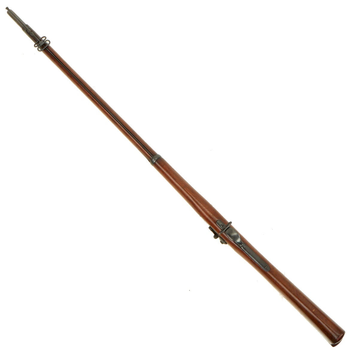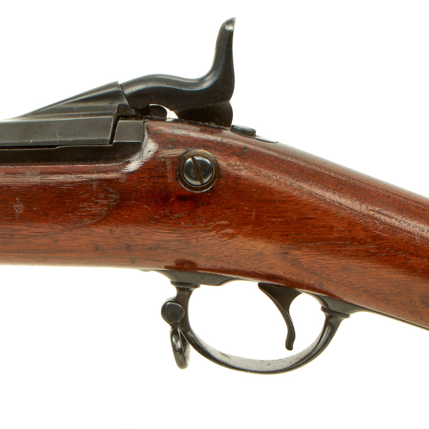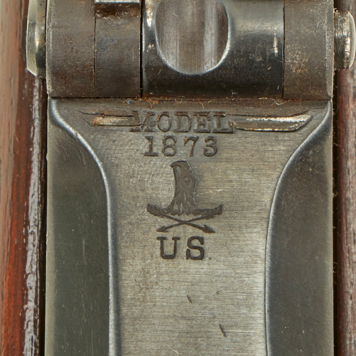 The two barrel bands are correctly U marked, though the U.S. on the butt plate tang was removed during restoration. Center fire breechloader, .45 cal., two bands, two sling swivels with stacking swivel, Buffington sight, and standard ramrod. Lock is marked with an eagle and U.S. / SPRINGFIELD, manufactured by Springfield Armory, Springfield Massachusetts.