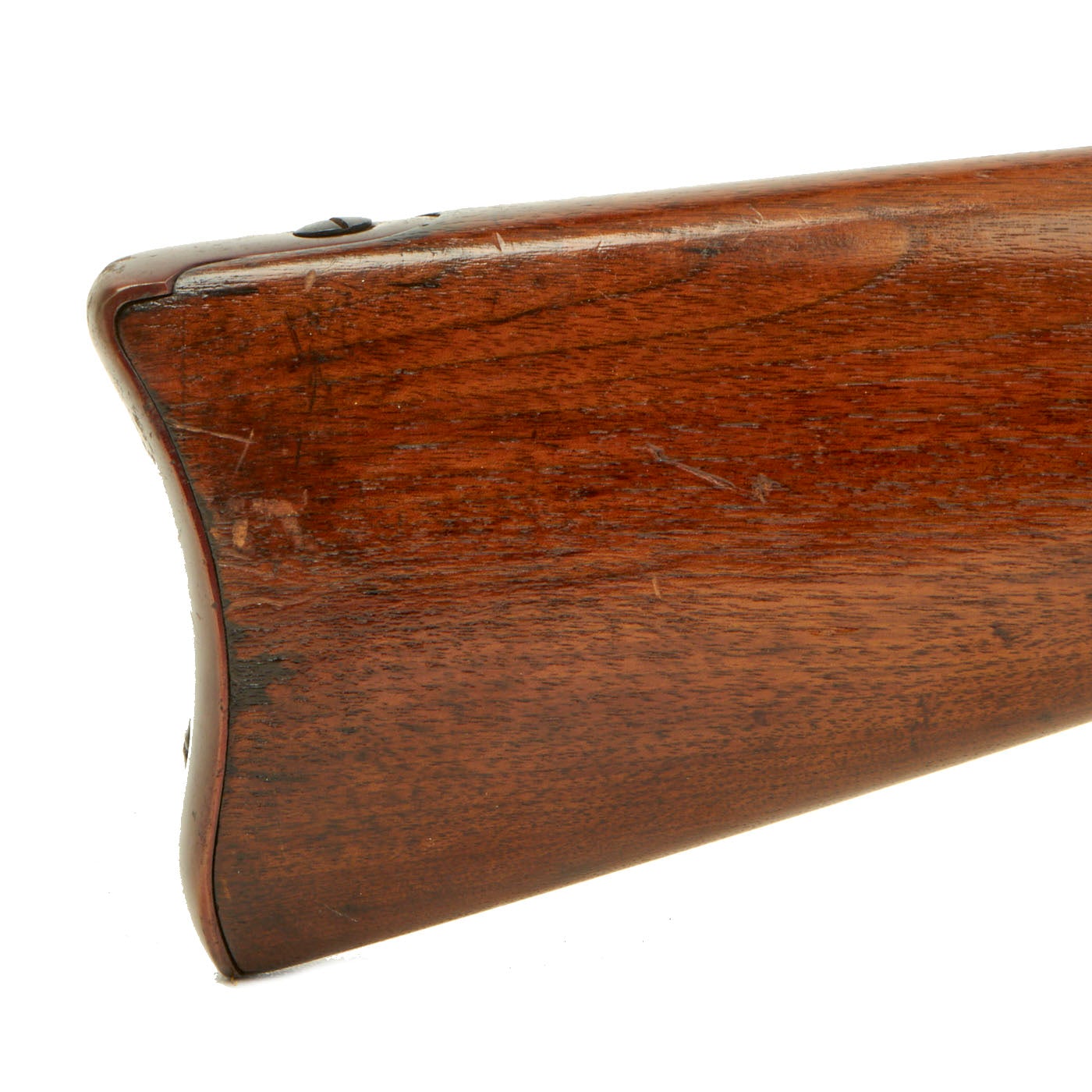In the years following, the stamping on the breech block was simplified, and the block itself lost the "high arch" underneath. Offered in excellent restored condition is this trapdoor rifle in .45-70 government caliber, Serial # 80326, indicating production in 1878, quite early in production. At some point, it was returned to Springfield Armory, and updated to 1884 standards, a common practice in the late 19th century Government arms supply chain. This involved swapping out the rear ladder sight for the new adjustable "Buffington" rear sight, along with the correct inlet lower barrel band. At this time the model 1873 smooth trigger was also replaced with an 1884 pattern serrated type, though the two part trigger guard was left as is.