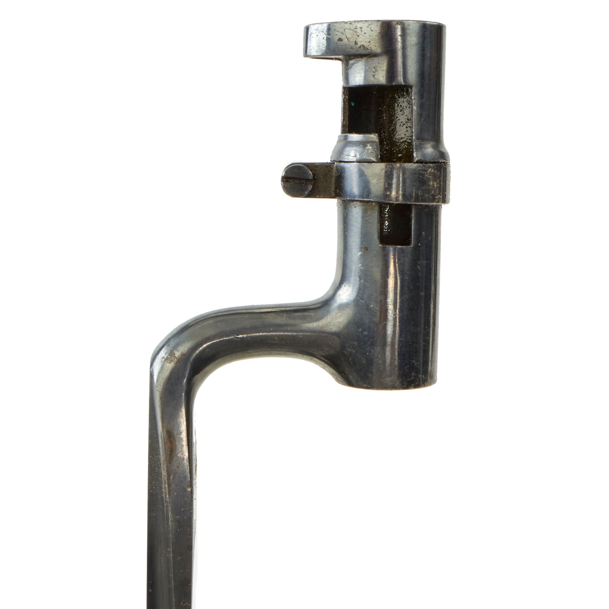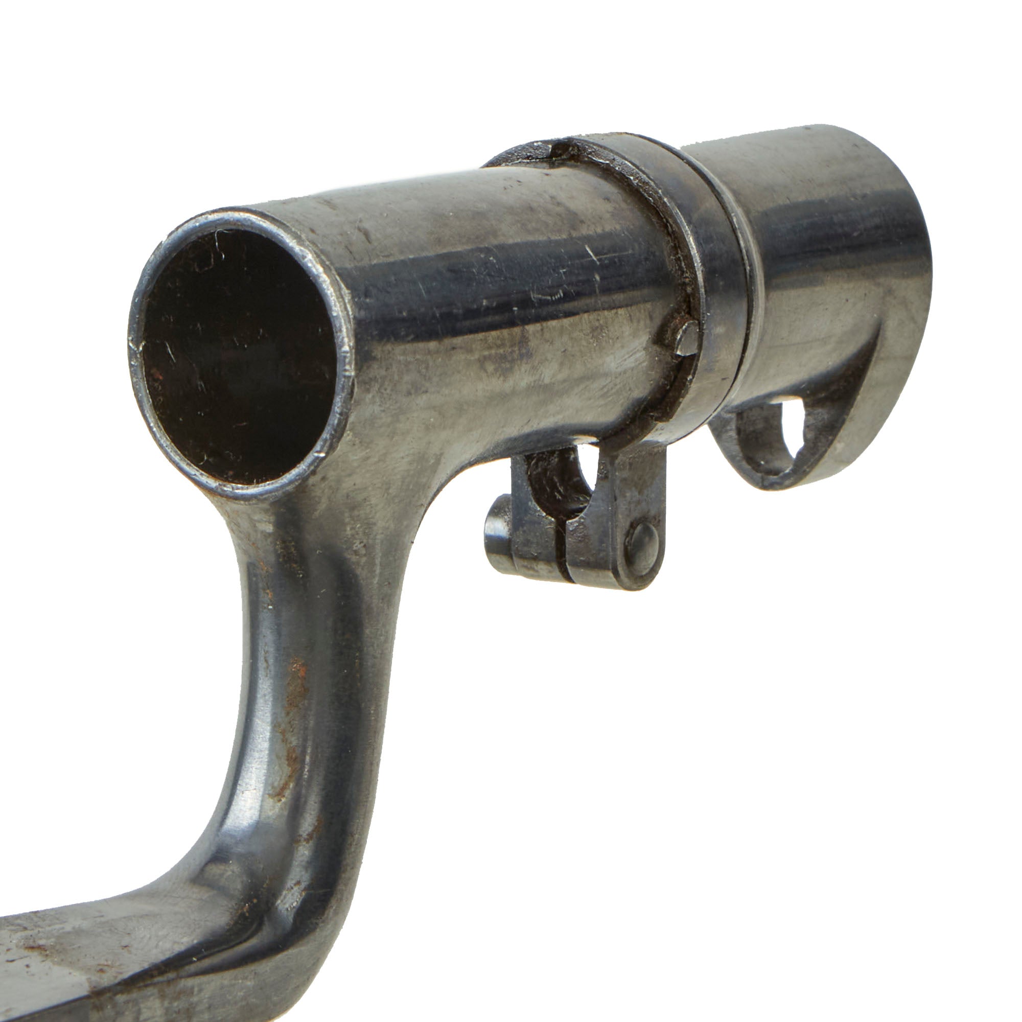 The bayonet comes complete with its original steel scabbard, with attached belt frog. The scabbard, like the bayonet, has a great worn patina from years of age and service. Most of the original finish is worn away, however there are no major dents, bends, or other damage. The leather frog is in good shape, with cracking and flaking in the black finish, and has a very nice leather belt loop attached by the rosette hinge.