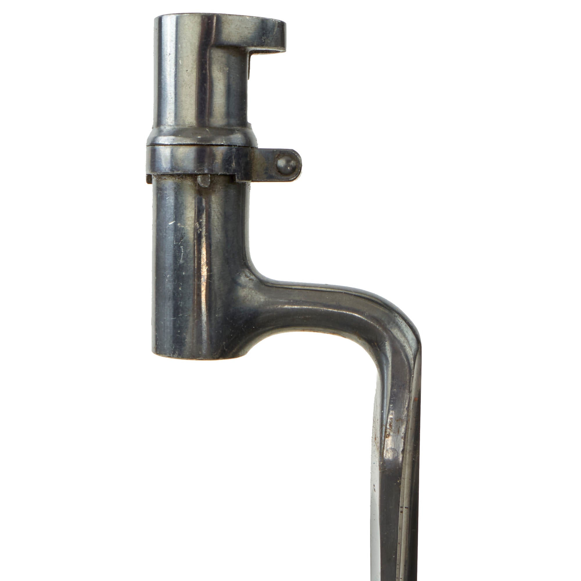 This example is really in very good used condition, with a lovely patina of age. There is some rust peppering on the socket, as often seen, and there is a bit of deformation to the blade end of the socket. It is correctly marked U.S. on the ricasso.The locking ring moves easily, and still has the correct securing screw.
