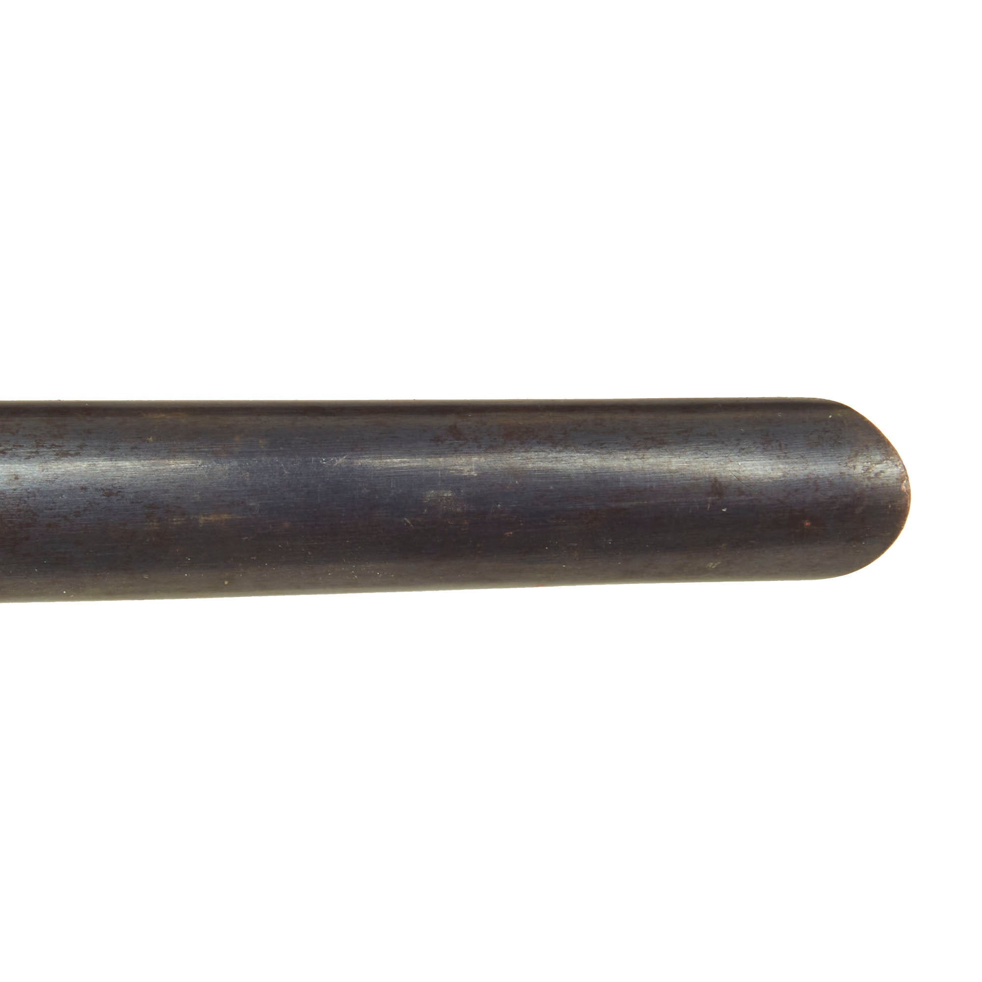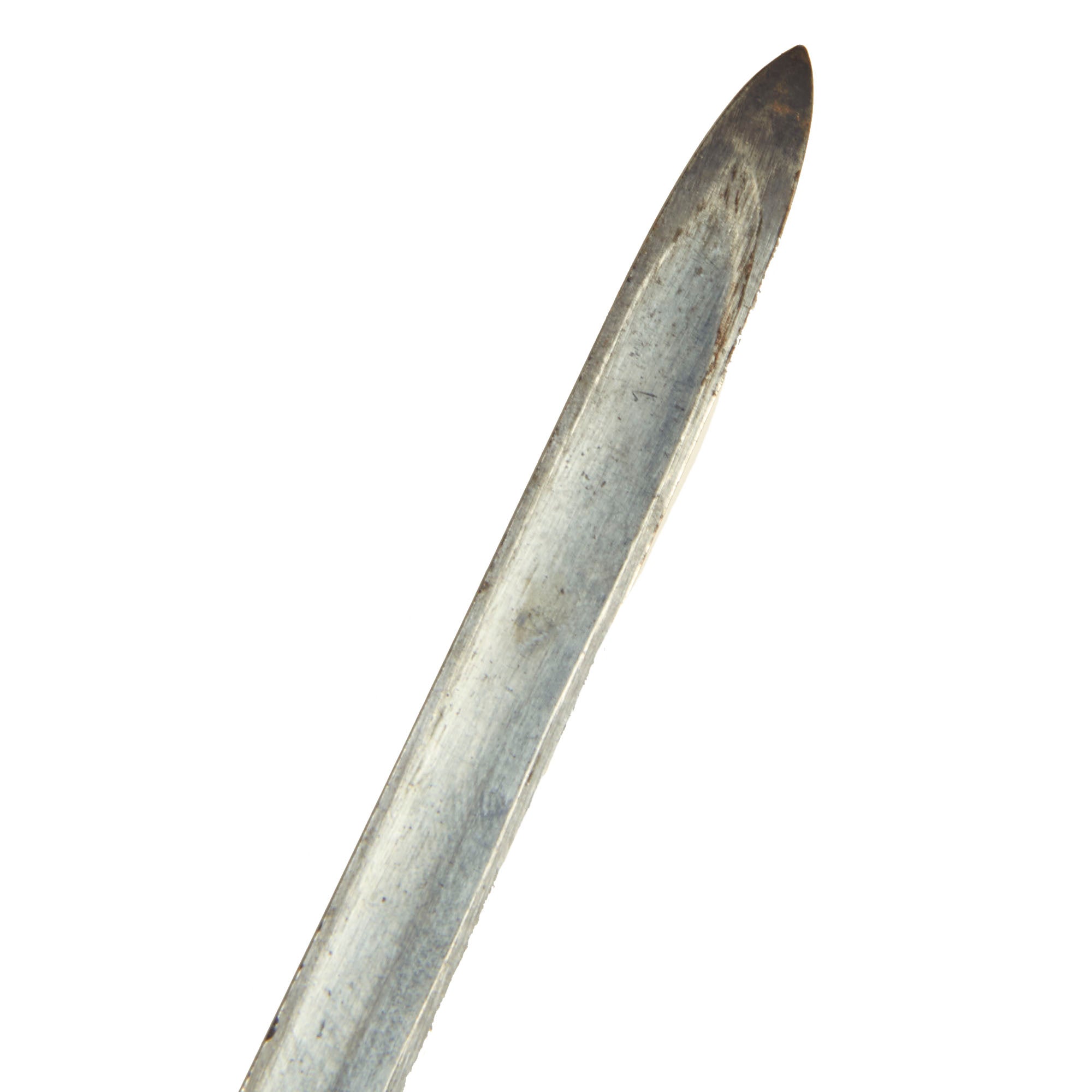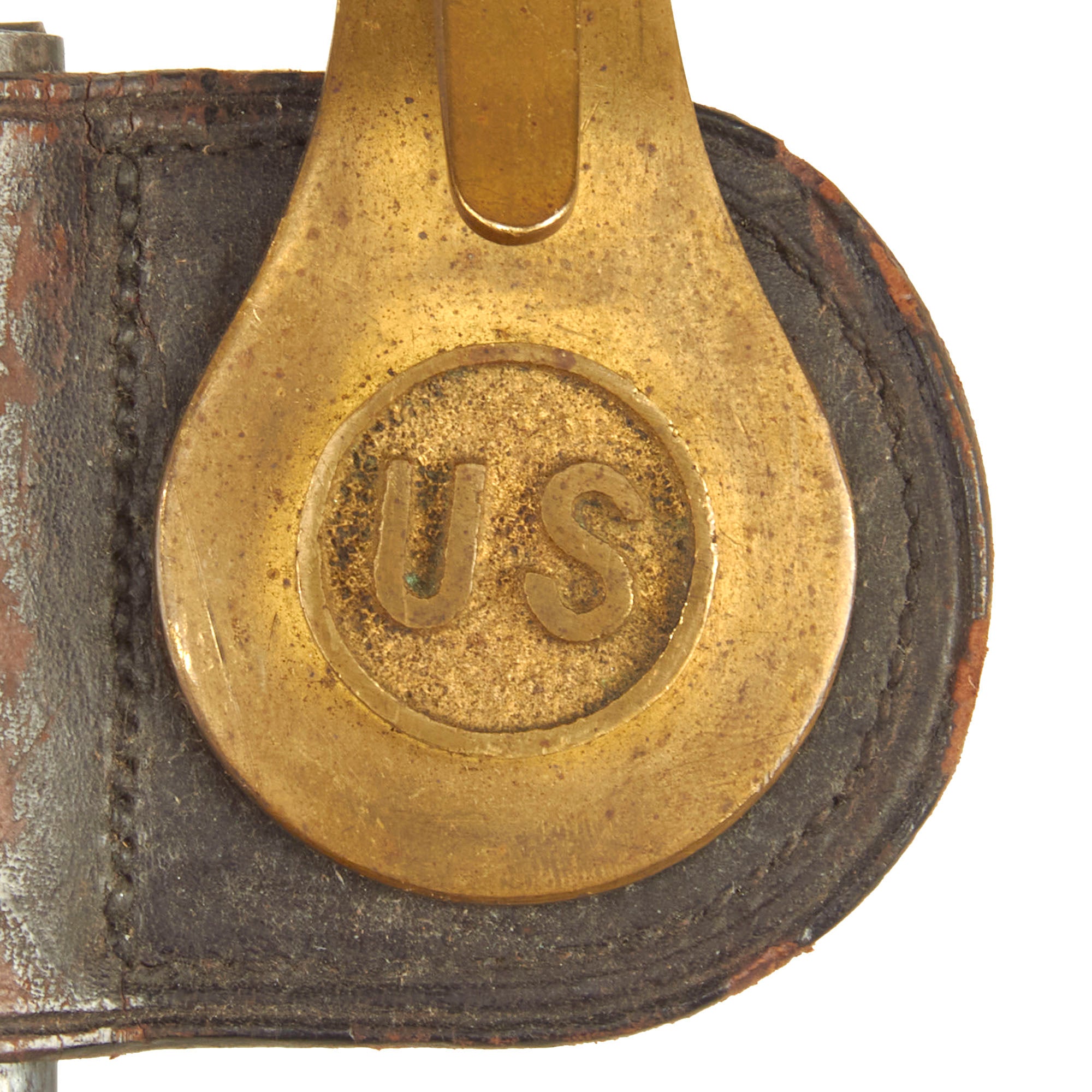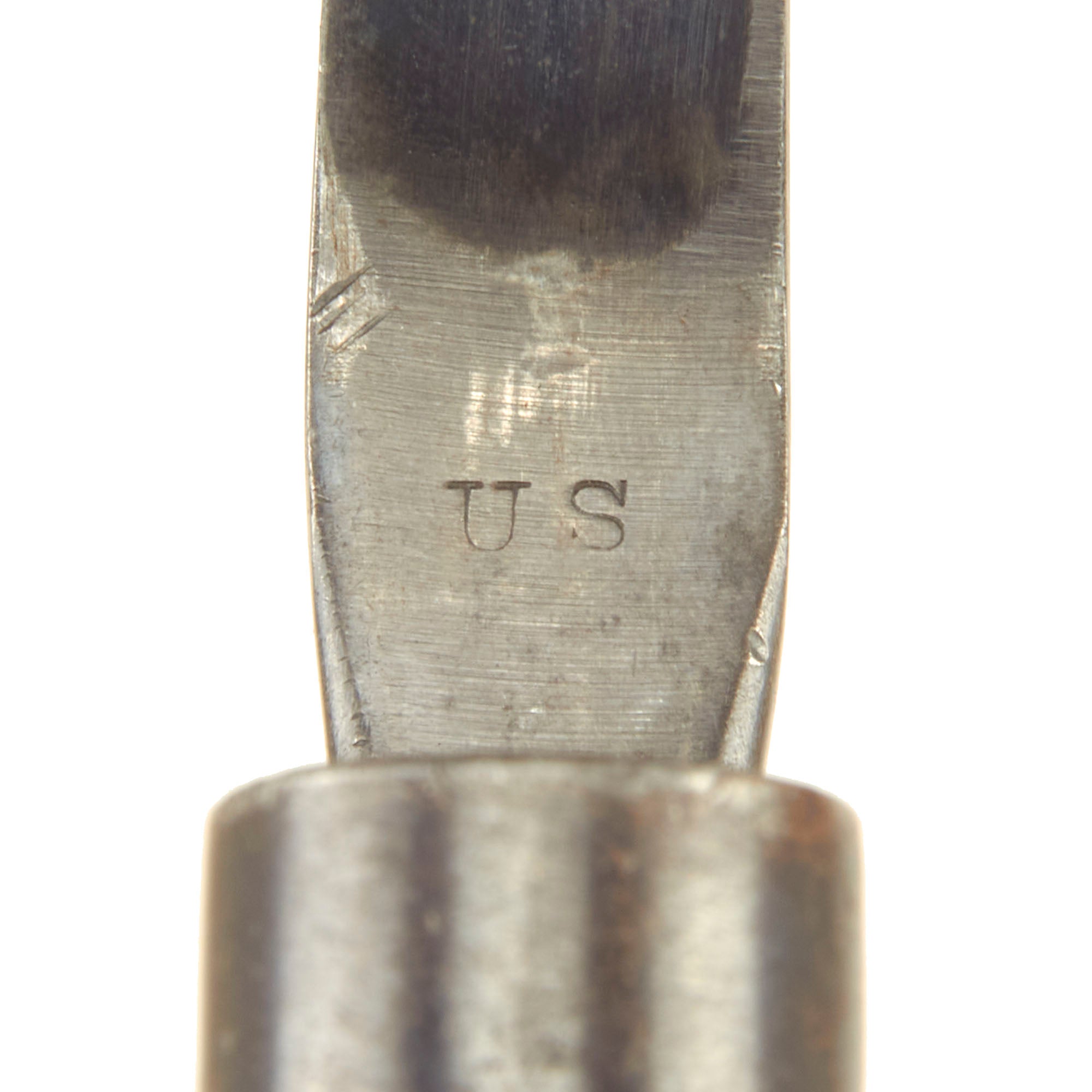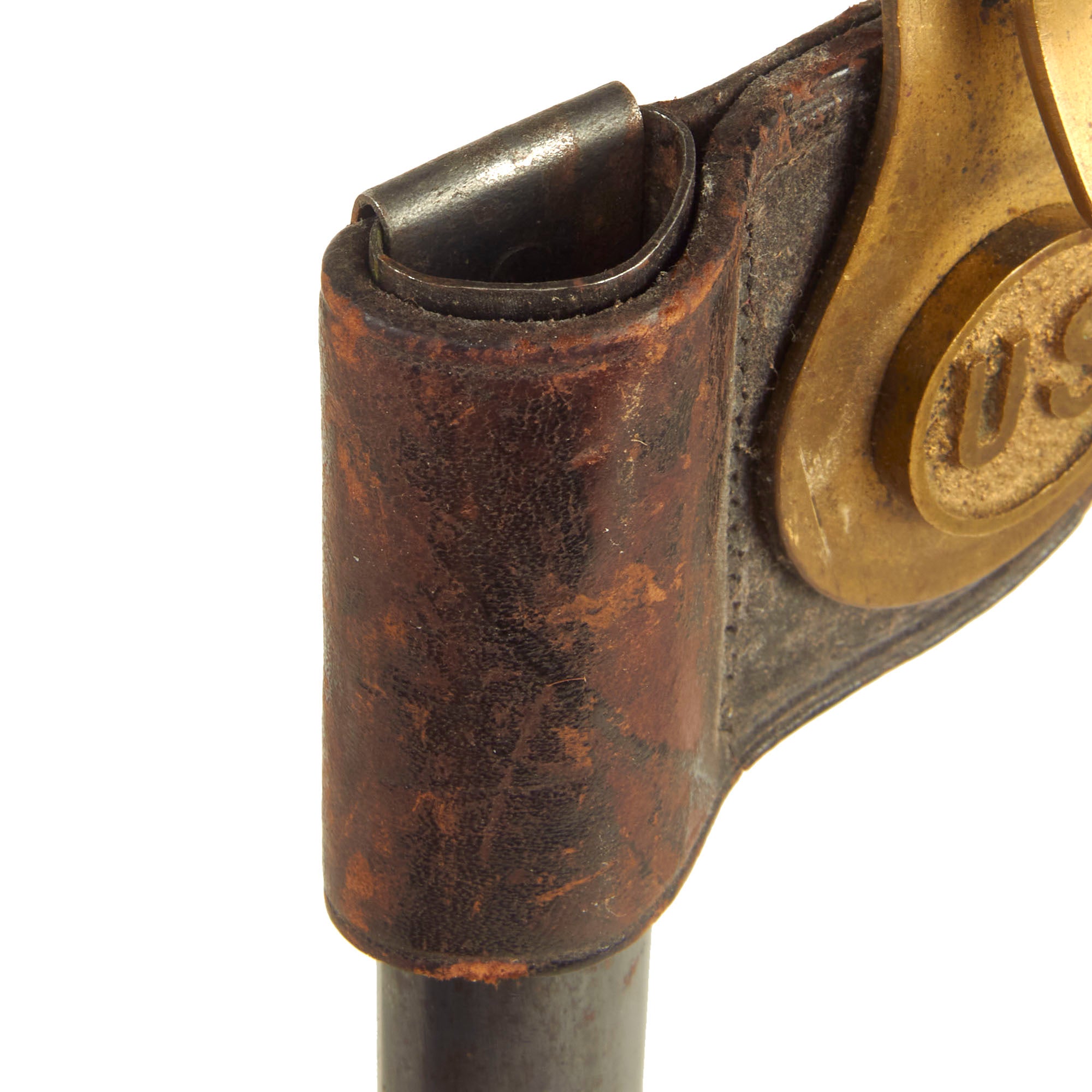 The bayonet comes complete with its original steel scabbard, with attached 2nd pattern belt frog. The scabbard, like the bayonet, looks to have been refinished at some point, in this case given a lovely deep blued color. It now has some rust speckling, however there are no dents, bends, or other damage. The leather frog is in good shape, with cracking and flaking in the black finish, and has a very nice brass hook attached by the U.S. rosette hinge.