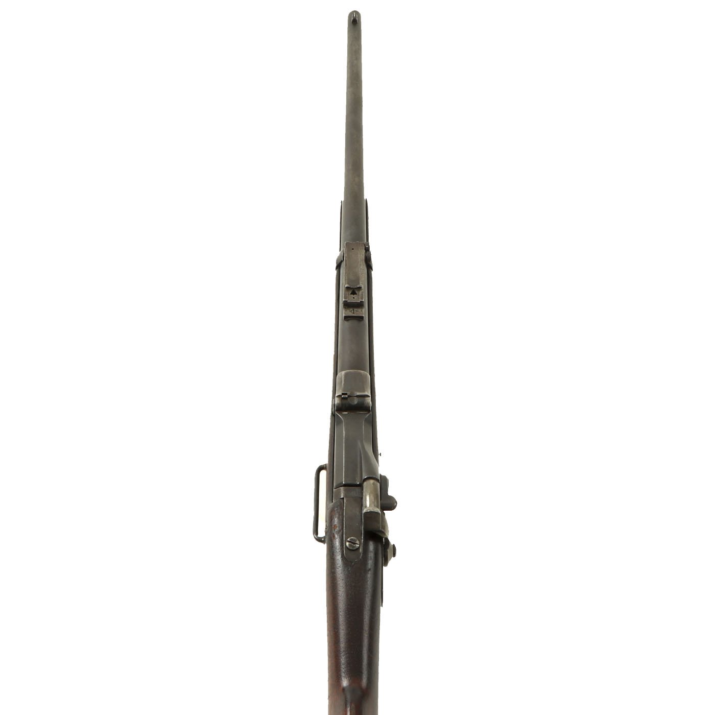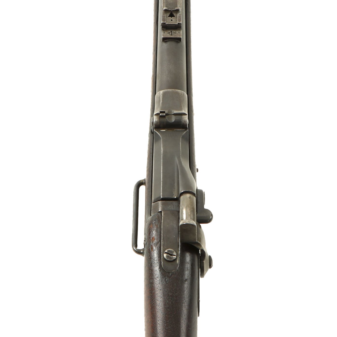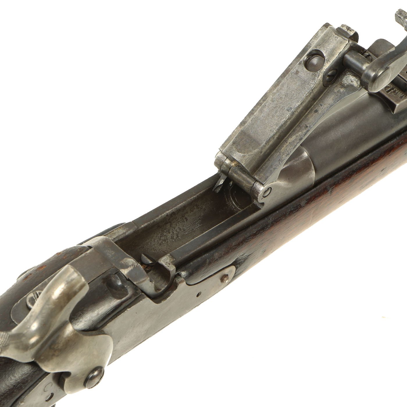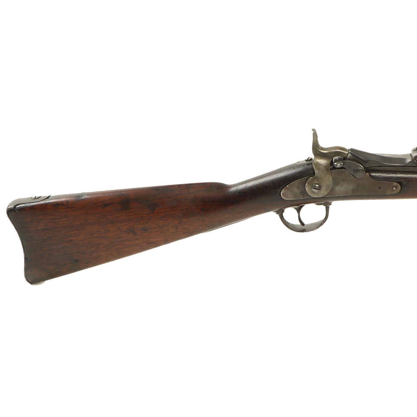 The butt plate is marked U.S. and the barrel band is U marked. Metal finish worn, with some areas of original finish present, but the rest is a faded plum color. The butt stock has the correct cleaning rod compartment, which is unfortunately empty. Center fire breechloader, .45 cal., single band, no sling swivels, and a standard rear ladder sight. It still has the correct saddle ring bar, however the sliding ring was lost at some point. The lock markings are unfortunately completely worn away.