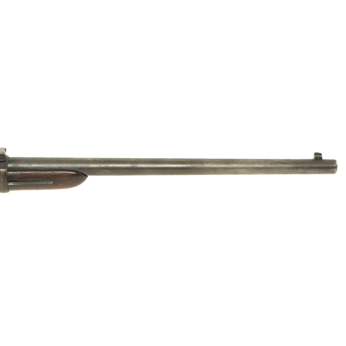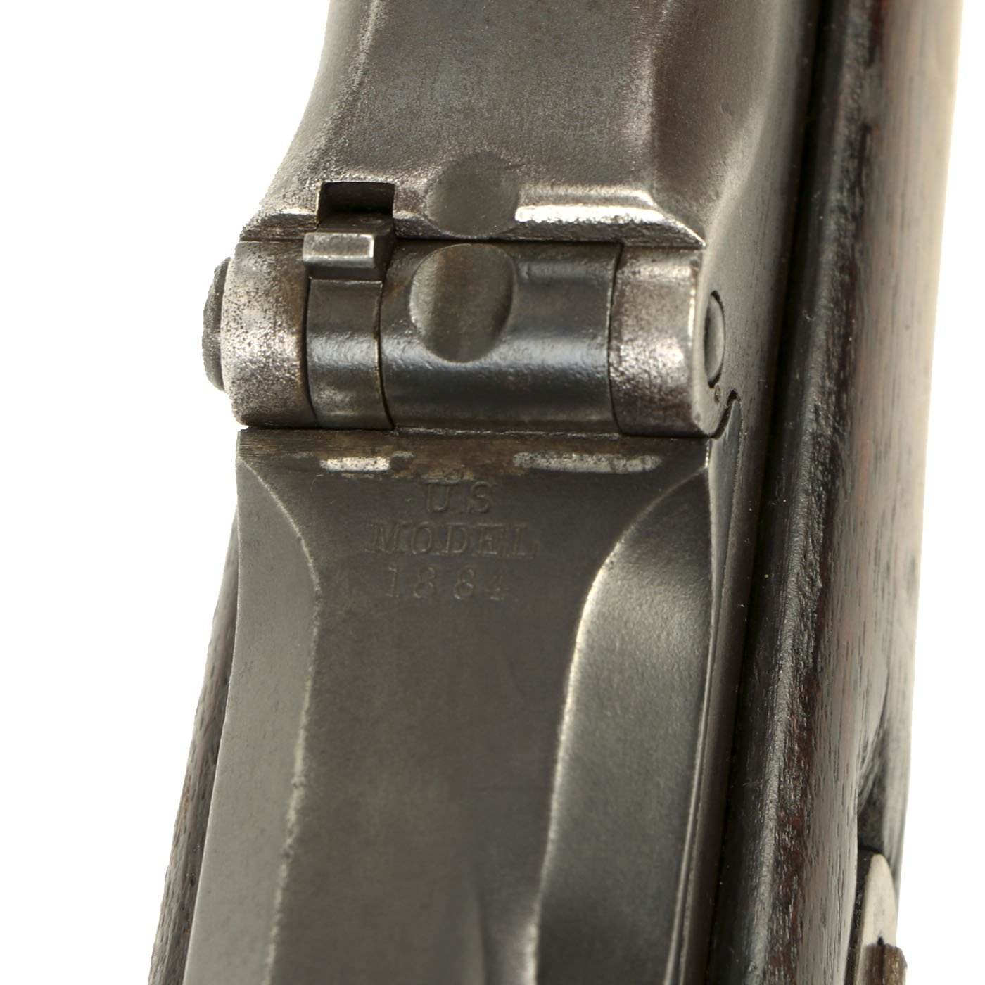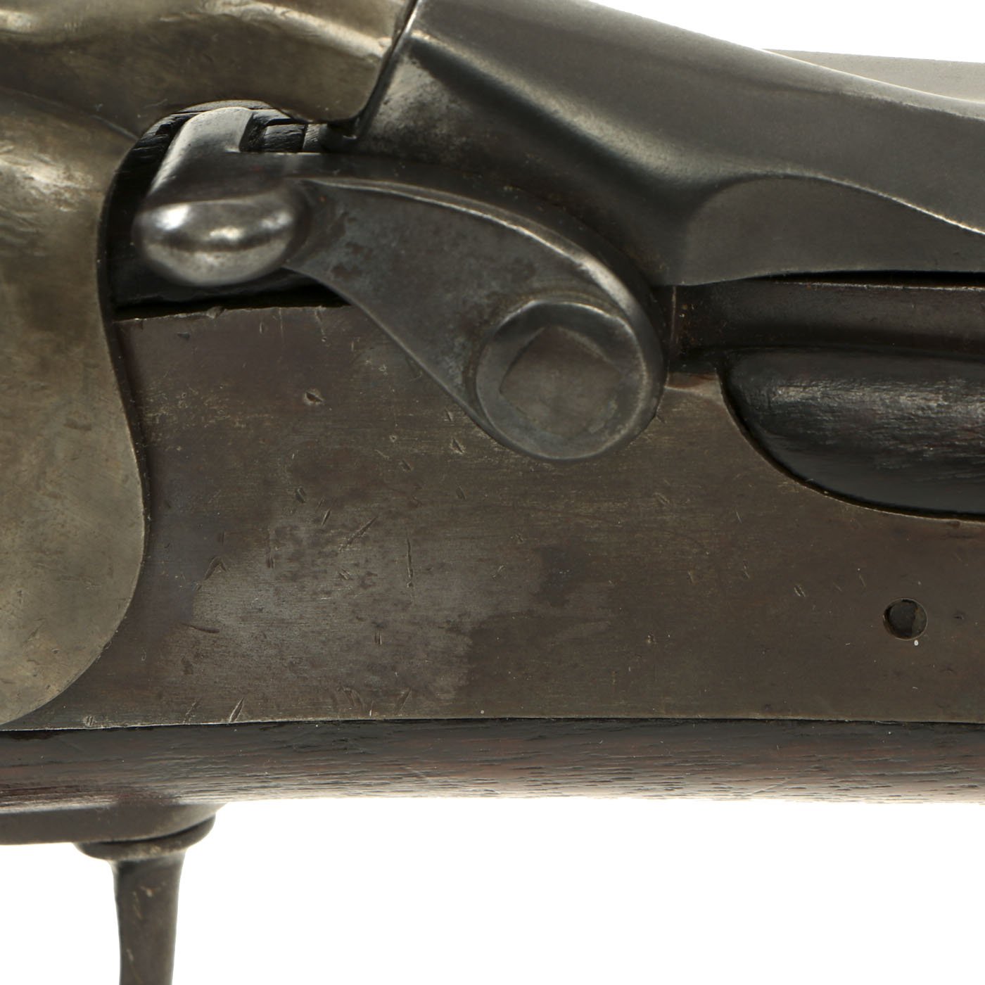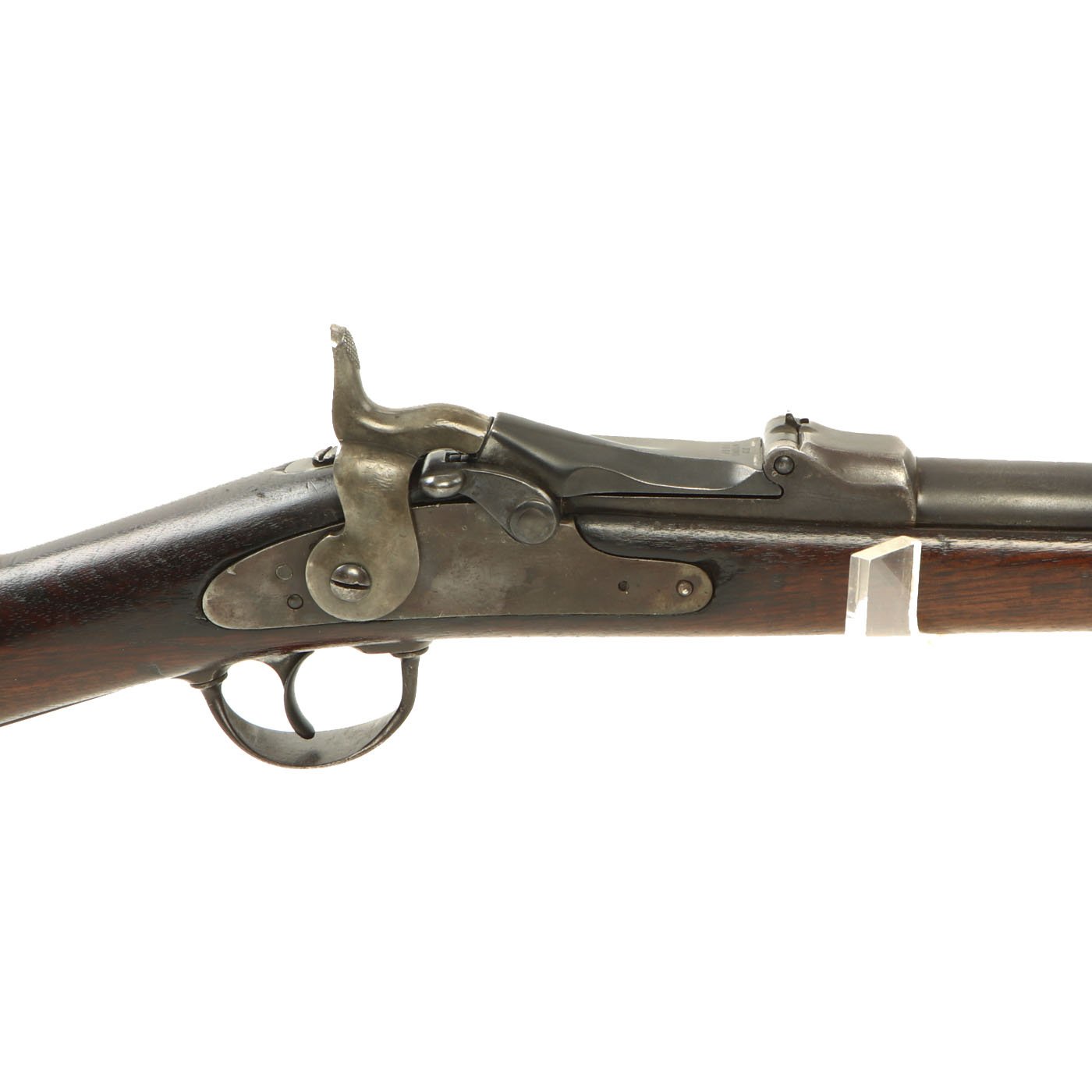 The butt plate is marked U.S. and the barrel band is U marked. Metal finish worn, with some areas of original finish present, but the rest is a faded plum color. The butt stock has the correct cleaning rod compartment, which is unfortunately empty. Center fire breechloader, .45 cal., single band, no sling swivels, and a standard rear ladder sight. It still has the correct saddle ring bar, however the sliding ring was lost at some point. The lock markings are unfortunately completely worn away.