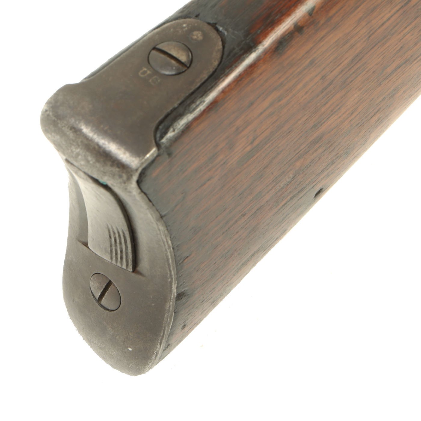 The stock on this example does show use and wear. It has many small dents, chips, and gouges, the look of a carbine that saw long service in the field. There are however no major structural issues. The bore is in very good condition, with clear lands and grooves, and a partly bright finish with overall light haze. The breech block extractor is present and functional, though we have not tested the ability to eject an actual spent cartridge.