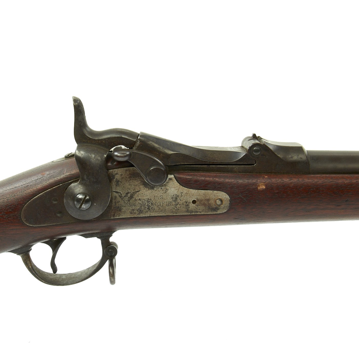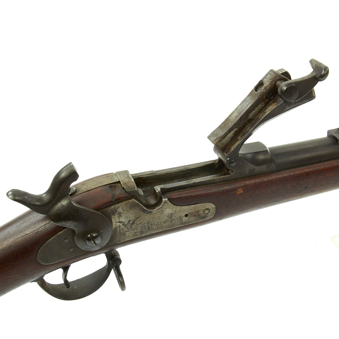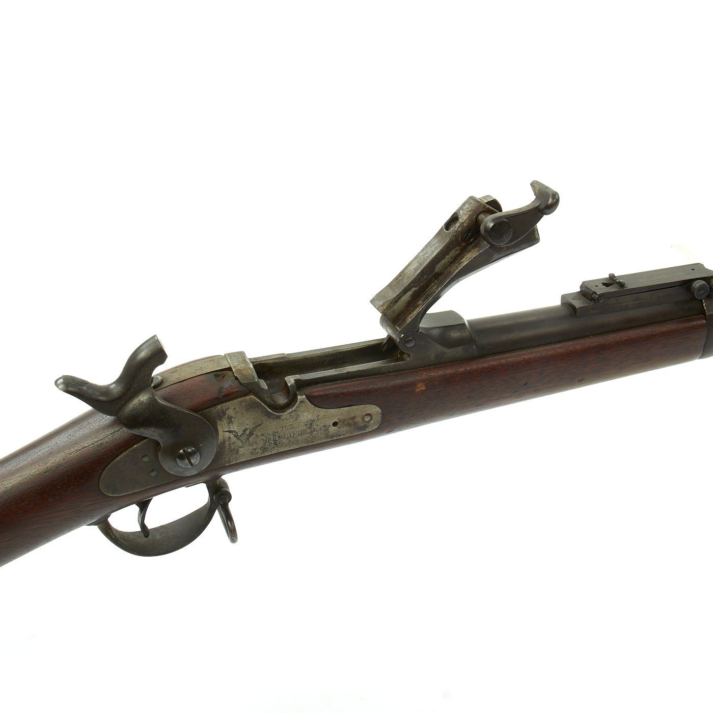 The butt plate is marked U.S. and both barrel bands are U marked. Metal finish is a nice aged blued color, with a bit of light peppering in places. Center fire breechloader, .45 cal., two bands, two sling swivels with stacking swivel, Buffington sight, with standard ramrod. Lock is marked with an eagle and U.S. / SPRINGFIELD, indicating manufacture by Springfield Armory in Springfield, Massachusetts.