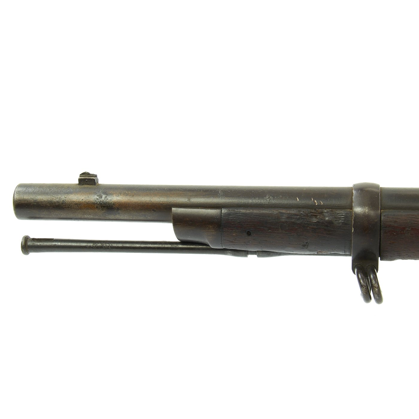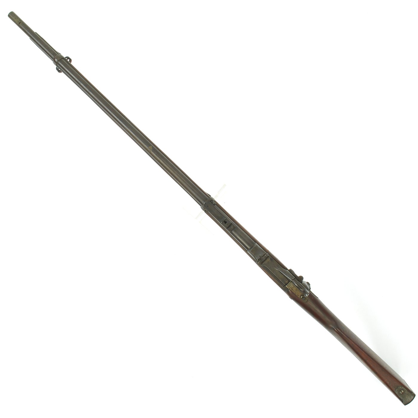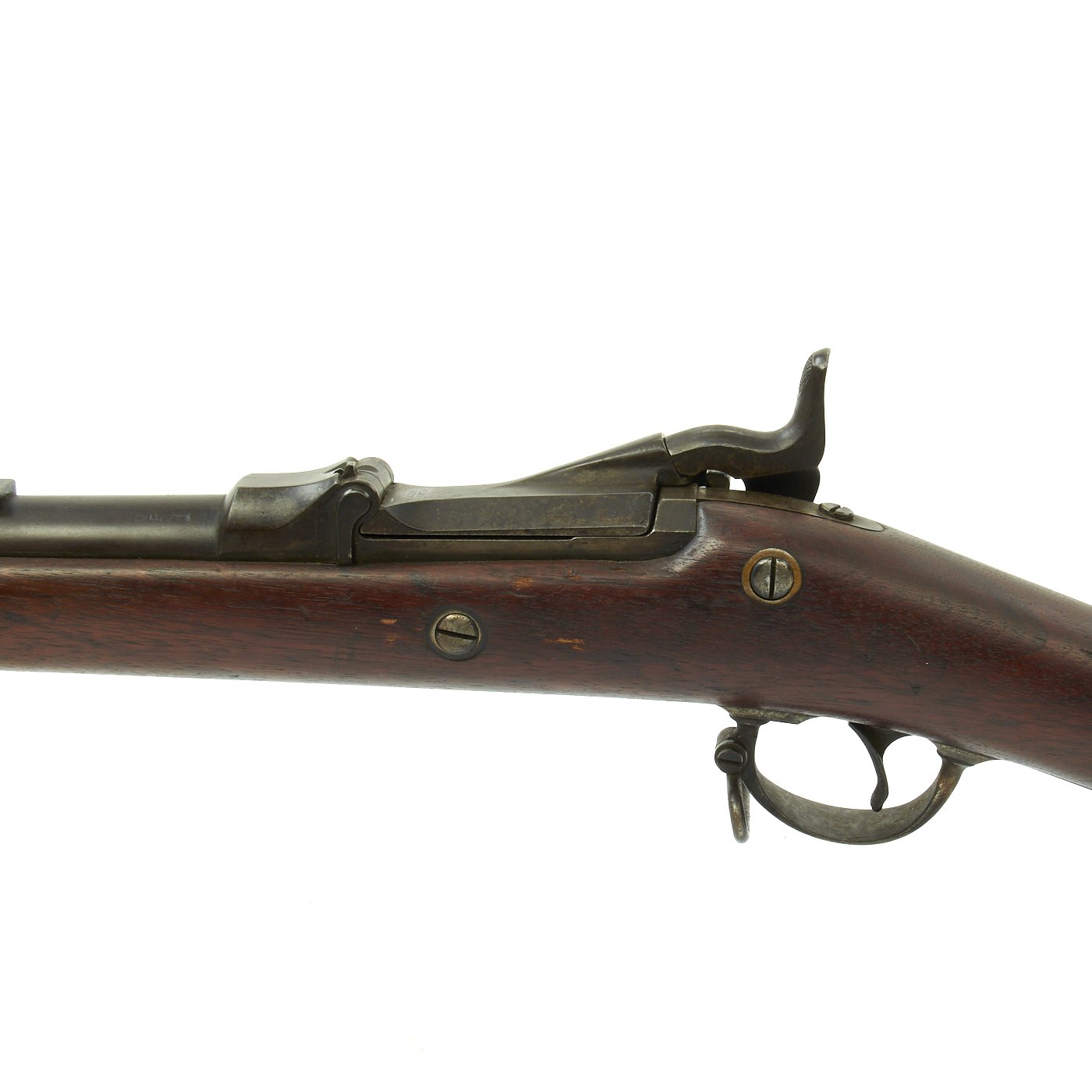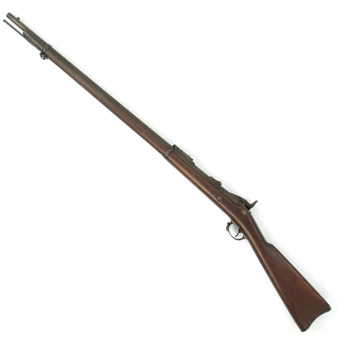 The butt plate is marked U.S. and both barrel bands are U marked. Metal finish is a nice aged blued color, with a bit of light peppering in places. Center fire breechloader, .45 cal., two bands, two sling swivels with stacking swivel, Buffington sight, with standard ramrod. Lock is marked with an eagle and U.S. / SPRINGFIELD, indicating manufacture by Springfield Armory in Springfield, Massachusetts.