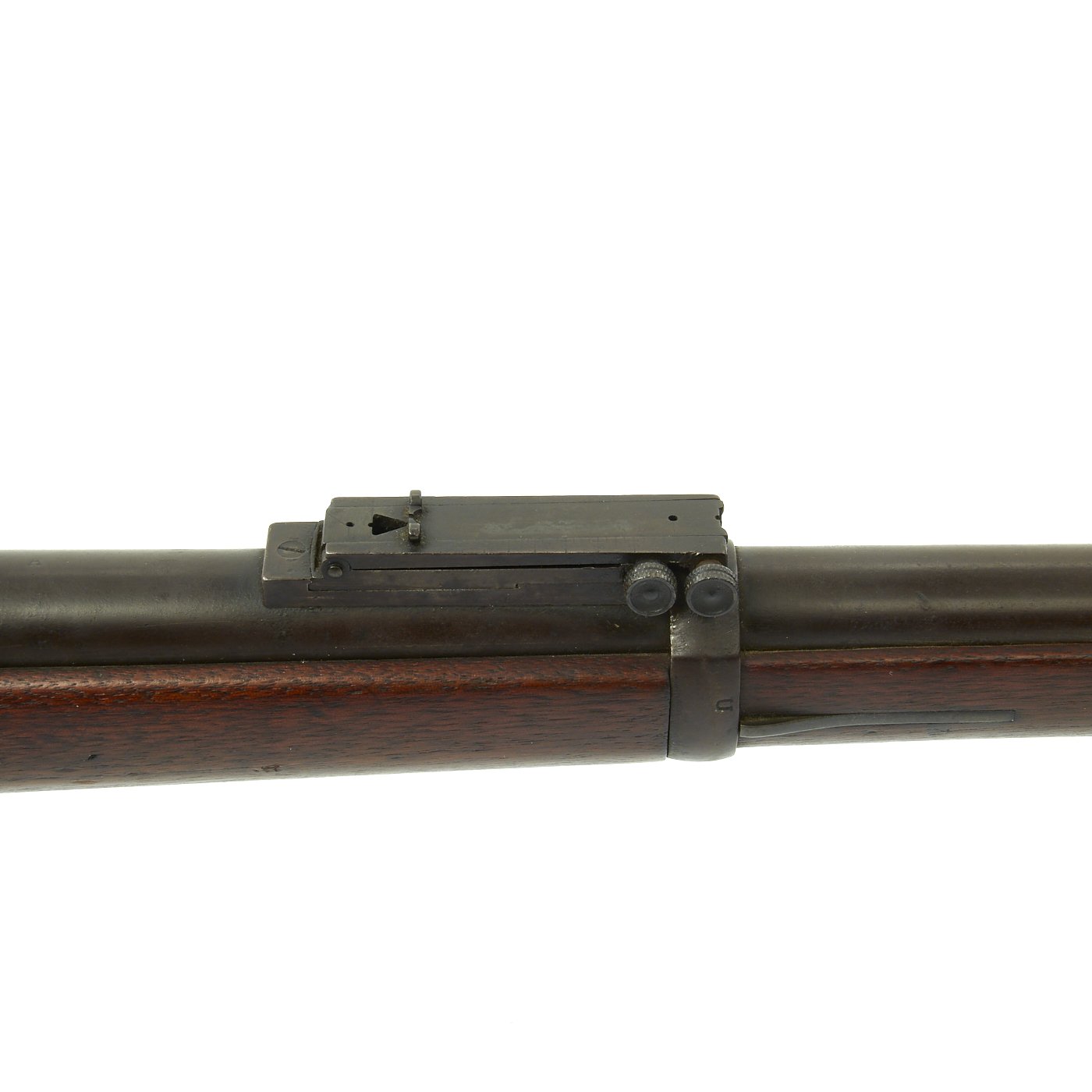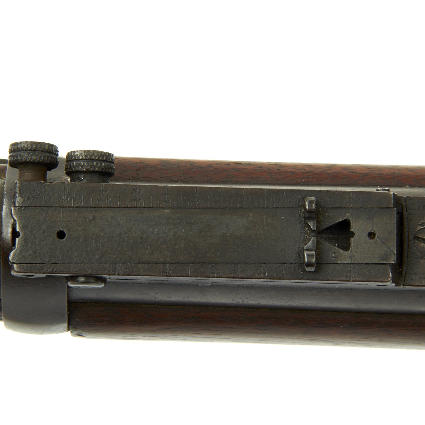 Most likely, the stock and lock plate were taken from a Model 1873 with a worn or damaged barrel, and the barrel and receiver from a model 1884 were then mated to the stock, complete with the original Buffington sight. This type of refit was common, especially for rifles in service with state militia units.
