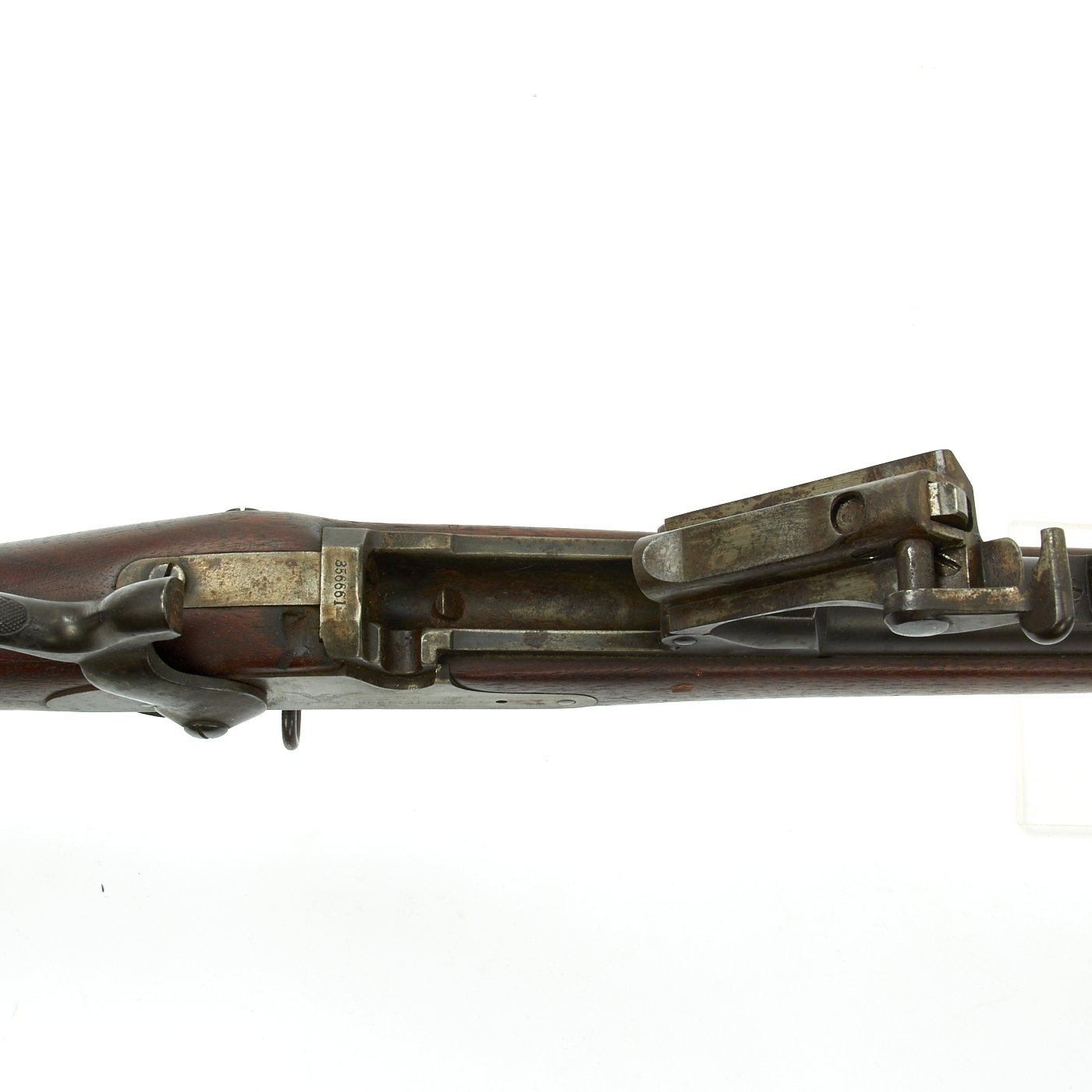Offered in very nice condition is this trapdoor rifle in .45-70 government caliber, Serial # 356661 with overall good metal finish and most metal proofs still present. The serial number indicates production in 1887, however the breech block is dated 1873, so this rifle was re-worked at arsenal at a later date, as the parts for the 1873 and 1884 were for the most part identical. The stock was sanded down, and the breech block was replaced with one marked 1873. The stock conforms to the standard 1873 pattern, with the standard ramrod and two piece trigger guard. However, it has the serrated trigger of the model 1884.