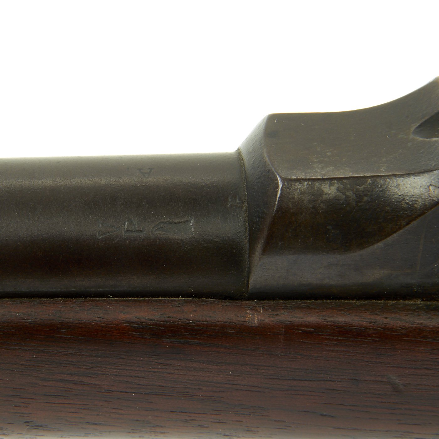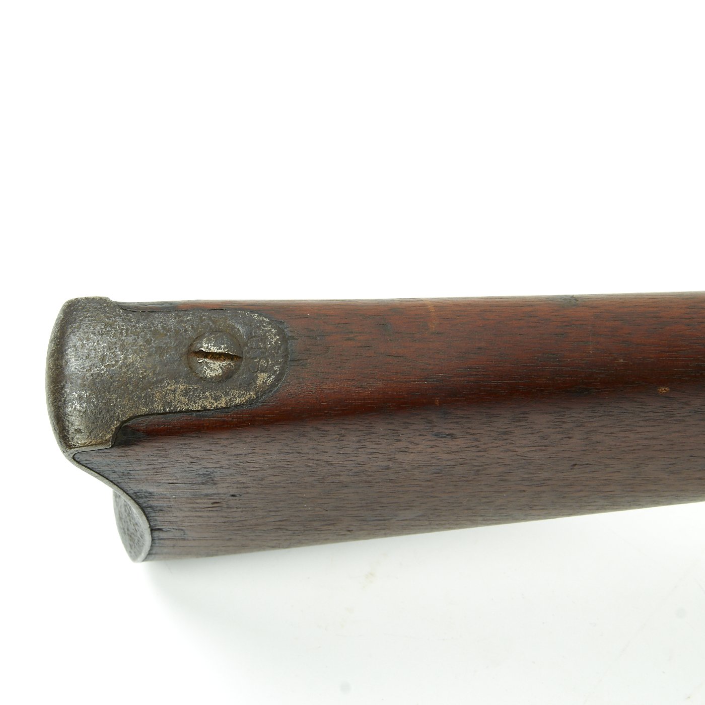 A very faint stylized P in a circle under the wrist of the stock indicates that the rifle passed all of its overpressure proof testing. Additional marks of interest include inspectors' and proof marks around the breech end of the barrel: a capital A on top; and a V over a P over an eagle's head over another P on the left side just above the stock. The upper right corner of the Buffington sight leaf is marked R to indicate that the sight graduations are for a rifle and not a carbine.