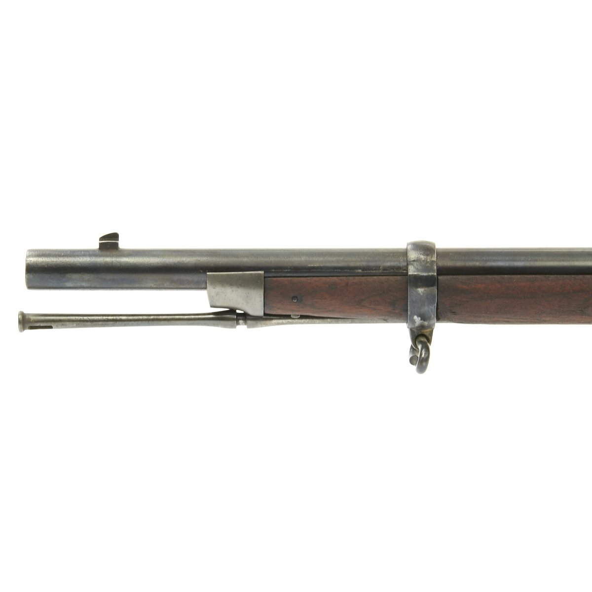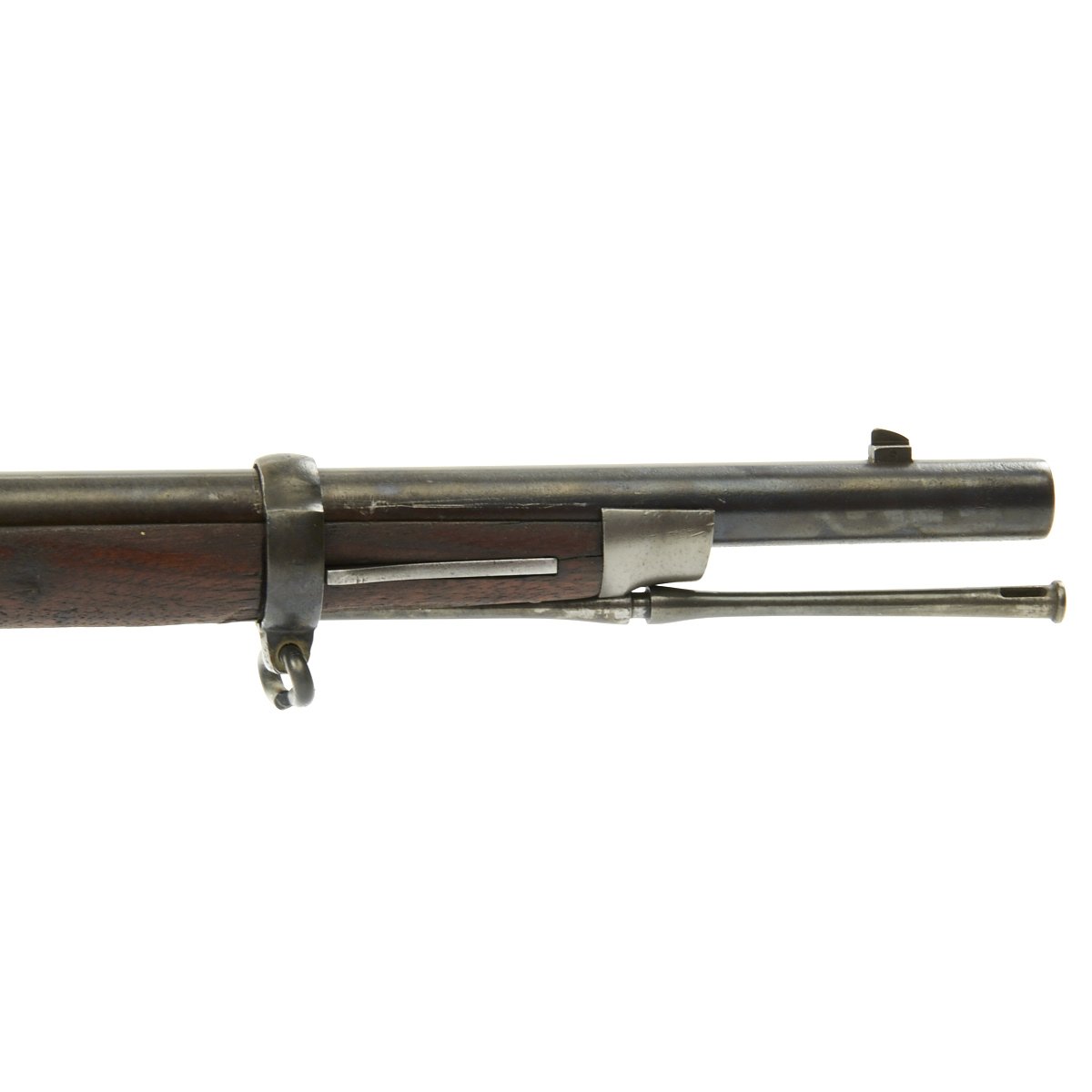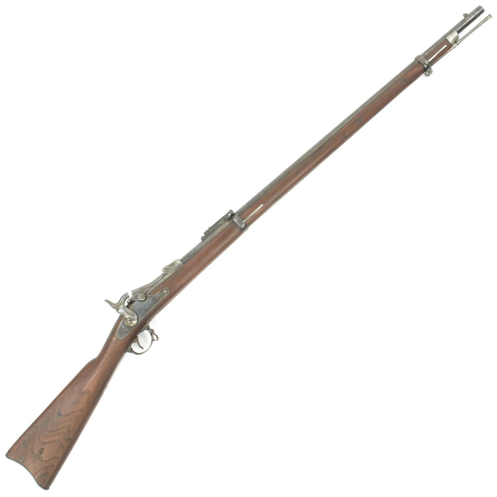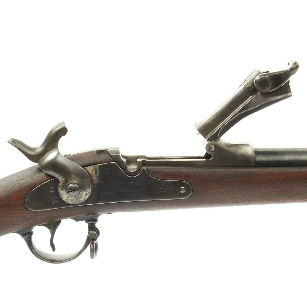 The butt plate is marked U.S. and the lower barrel band is U marked. Metal finish is a nice aged brown color, with a bit of peppering in places. Center fire breechloader, .45 cal., two bands, one sling swivel with stacking swivel, Buffington sight, standard ramrod. Lock is marked with an eagle and U.S. SPRINGFIELD manufactured by Springfield Armory, Springfield Massachusetts. It looks like the upper barrel band was replaced with a Krag band, which only has a stacking swivel.