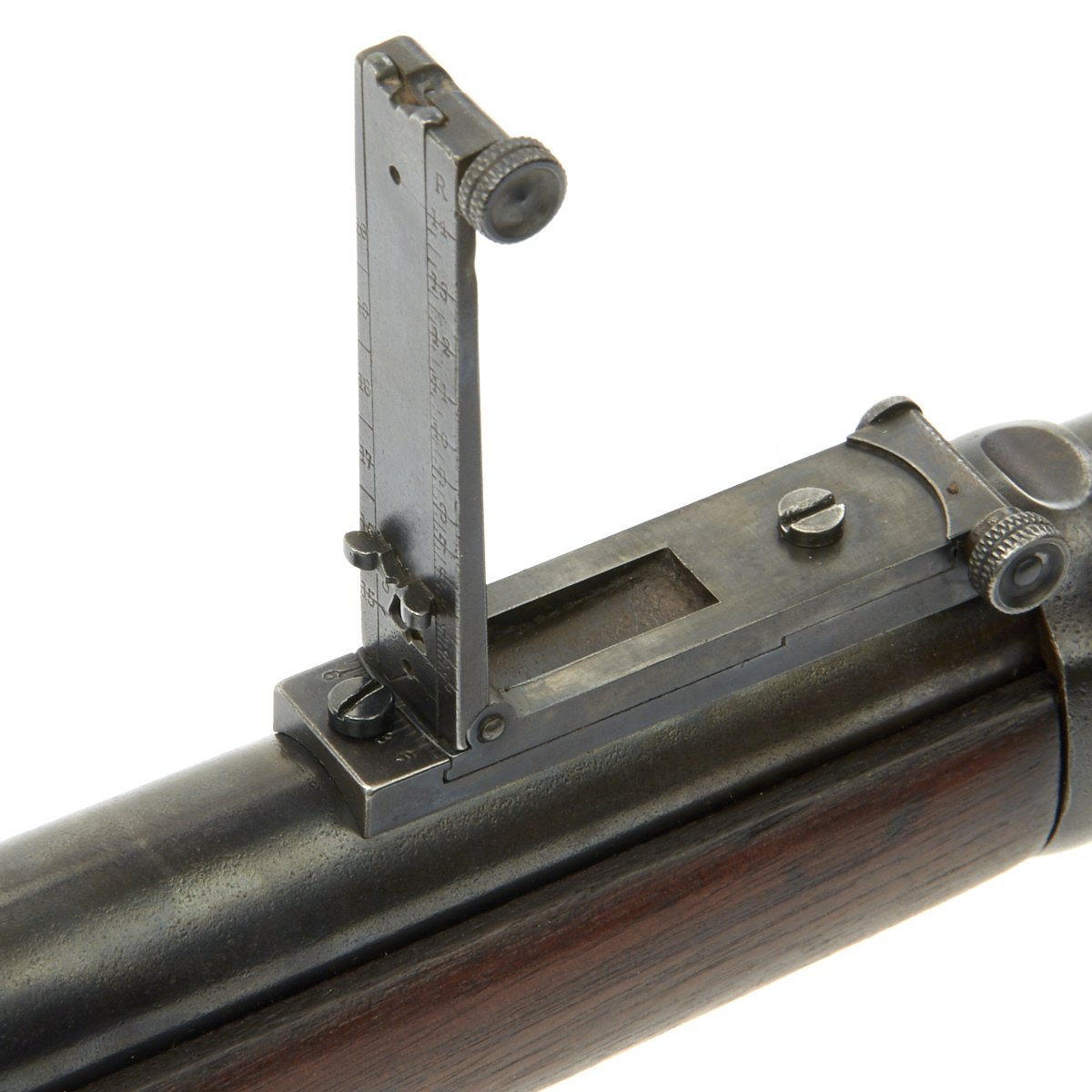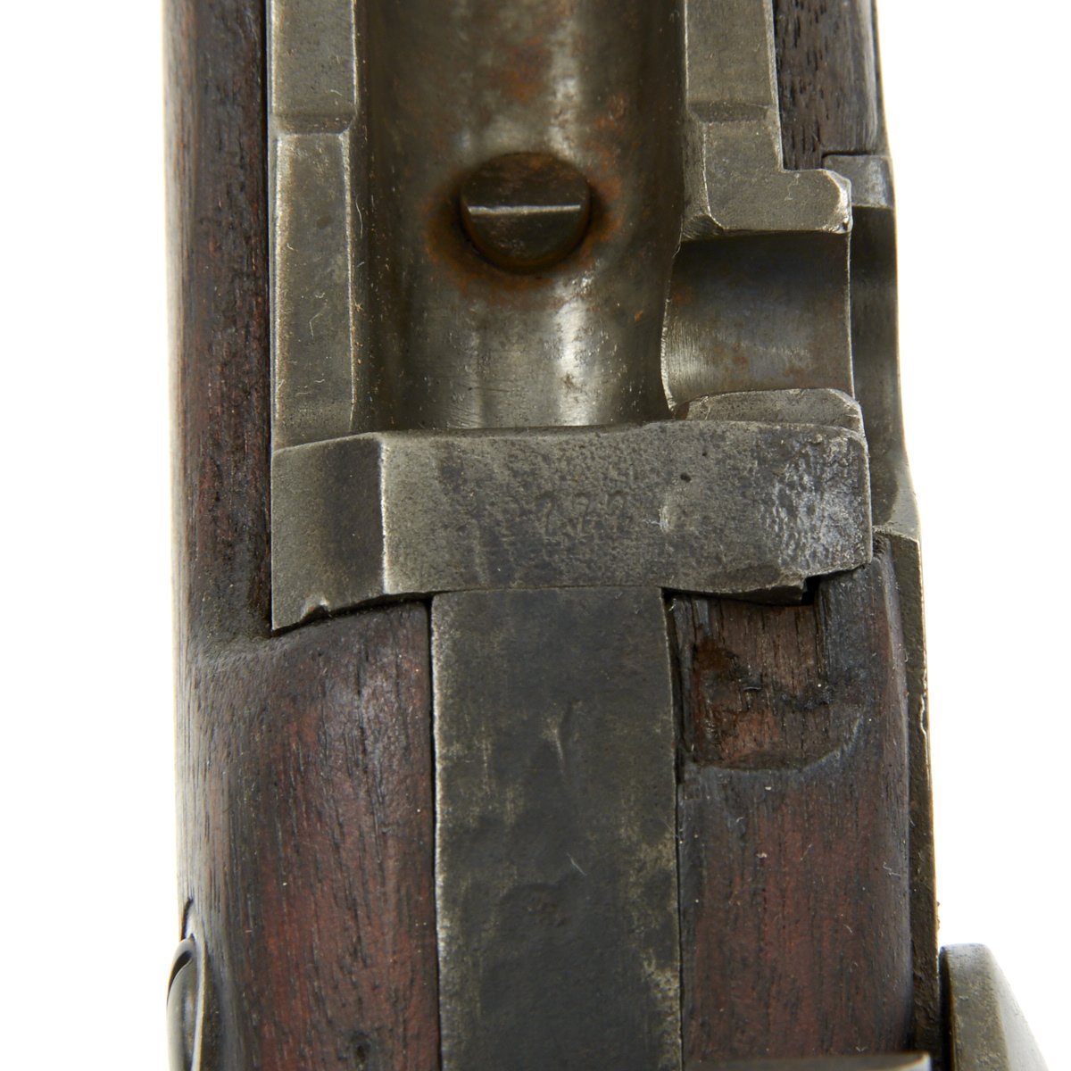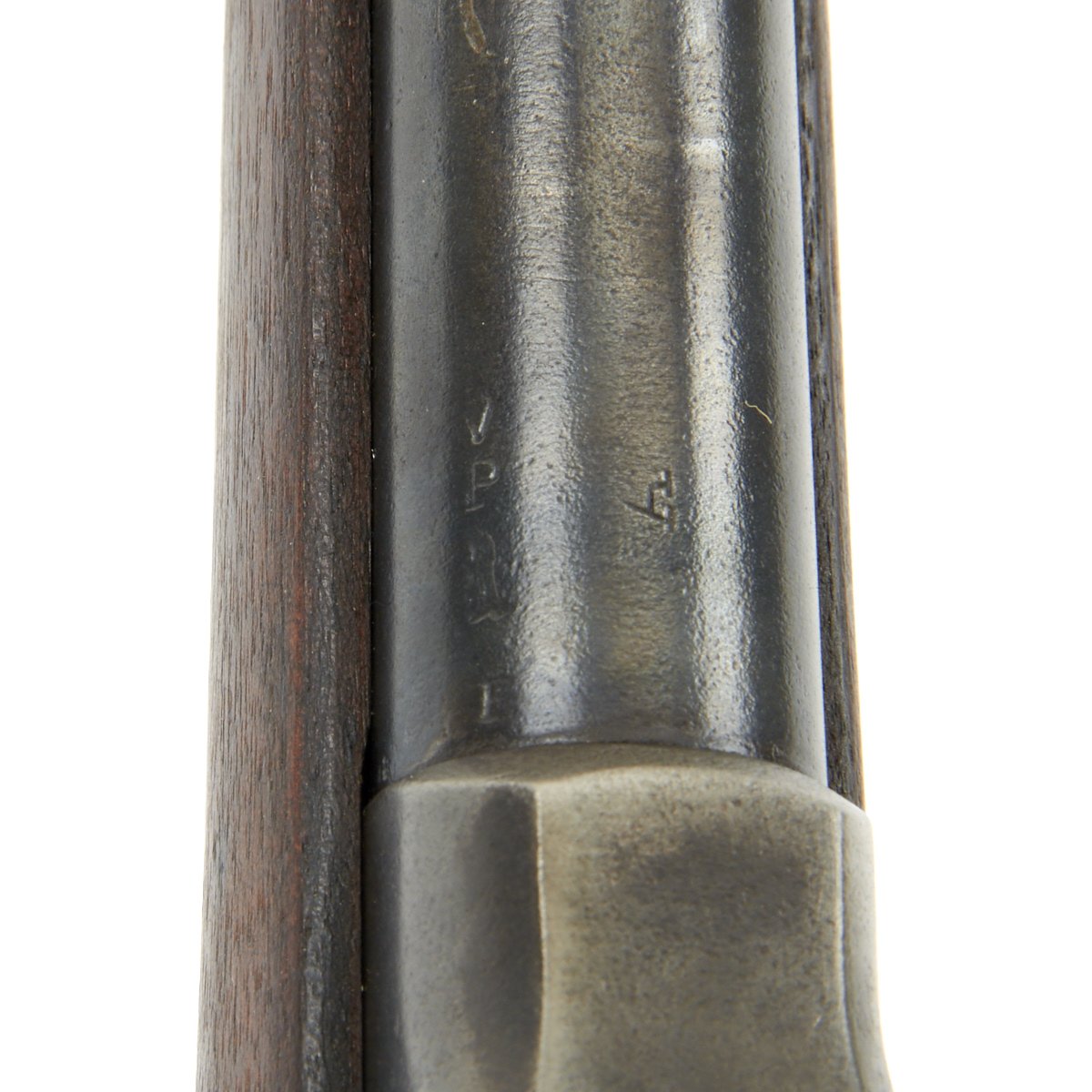 Additional marks of interest include inspectors' and proof marks around the breech end of the barrel: a capital A on top; and a V over a P over an eagle's head over another P on the left side just above the stock. The upper right corner of the Buffington sight leaf is marked R to indicate that the sight graduations are for a rifle and not a carbine.