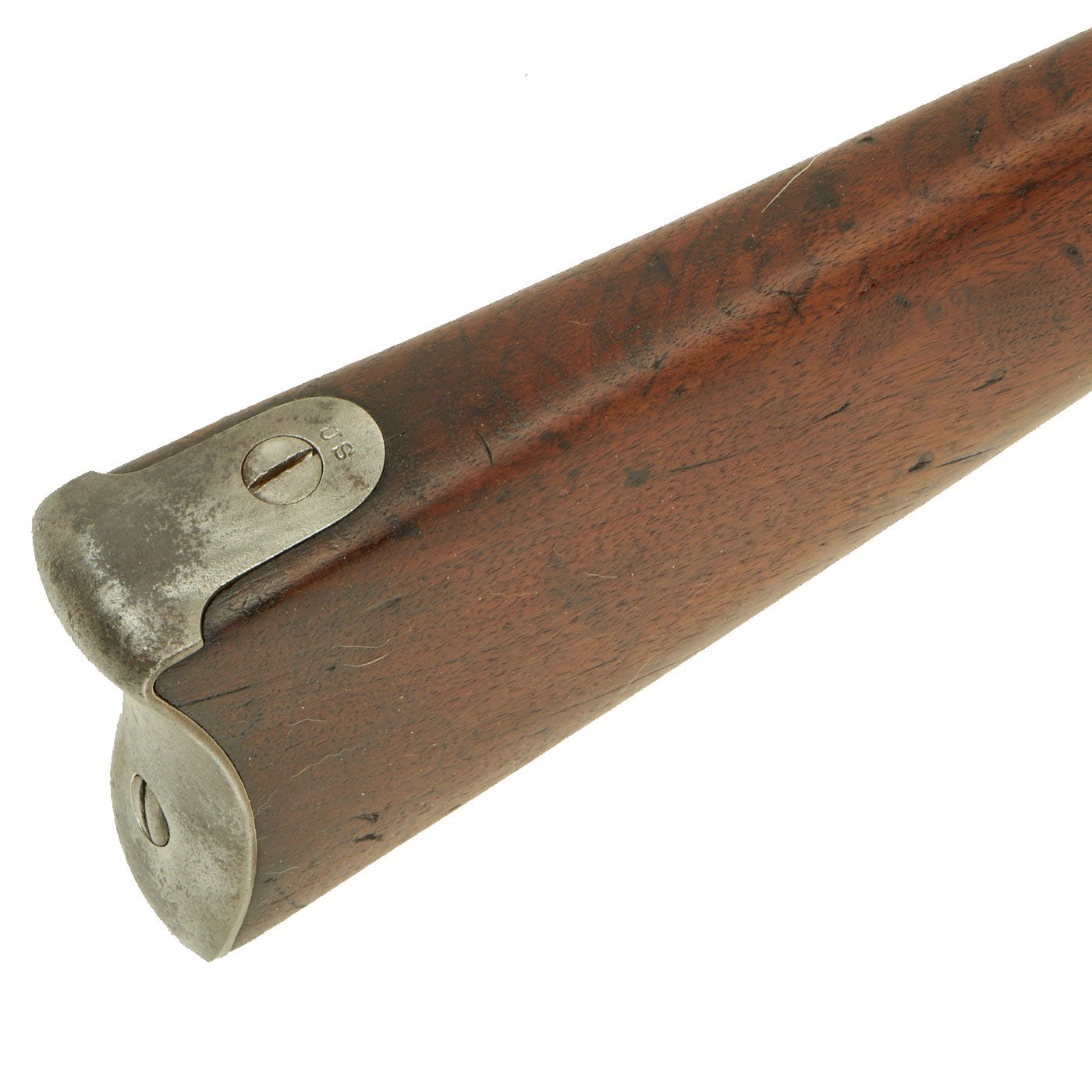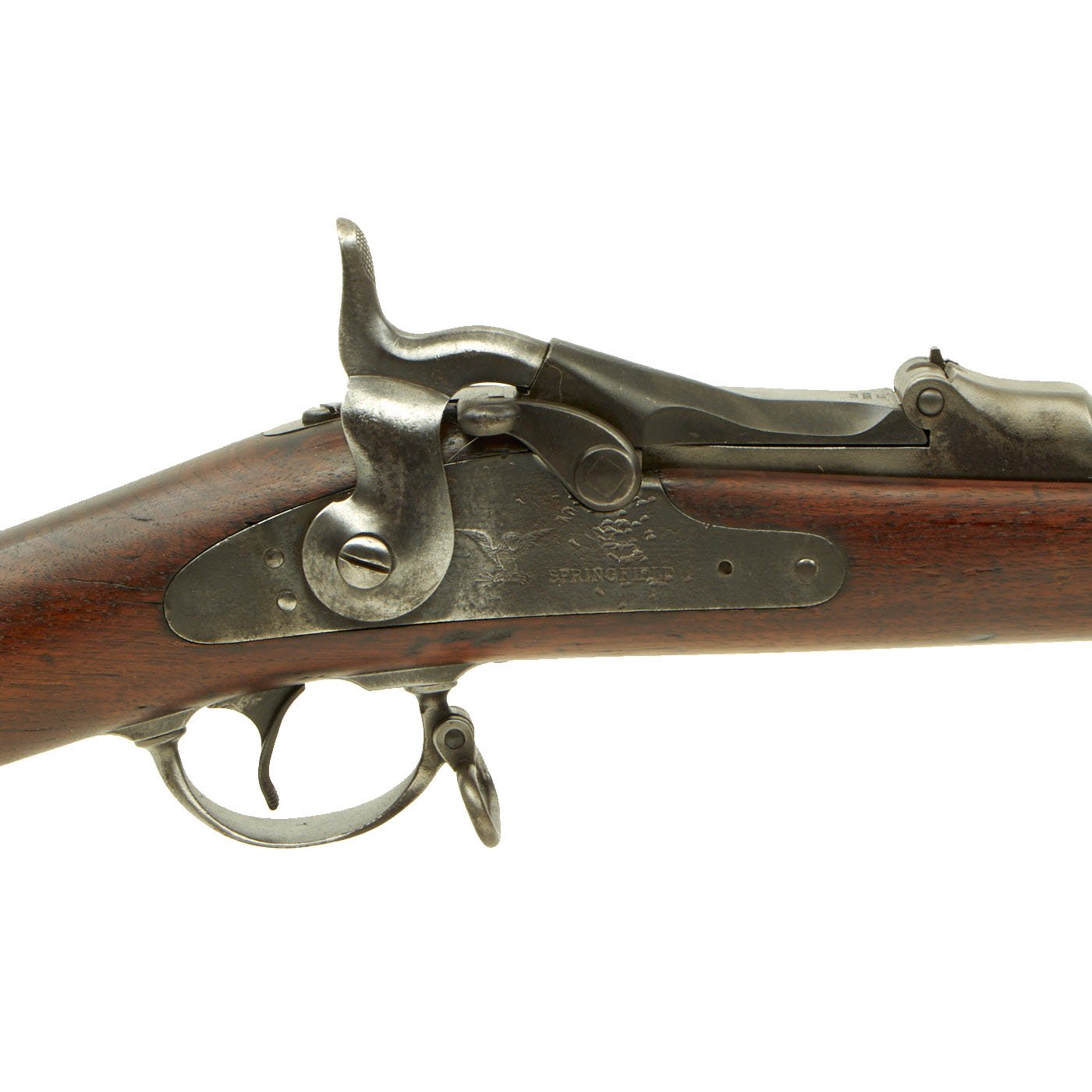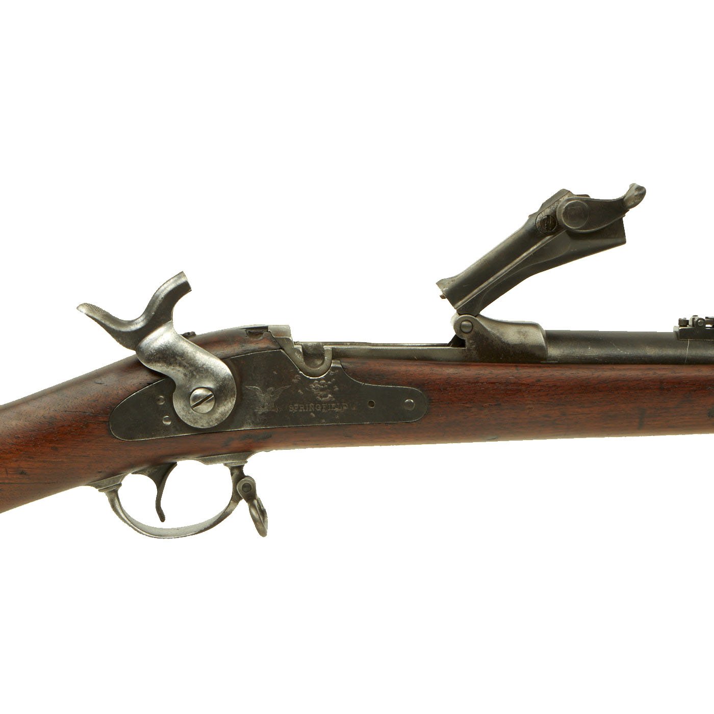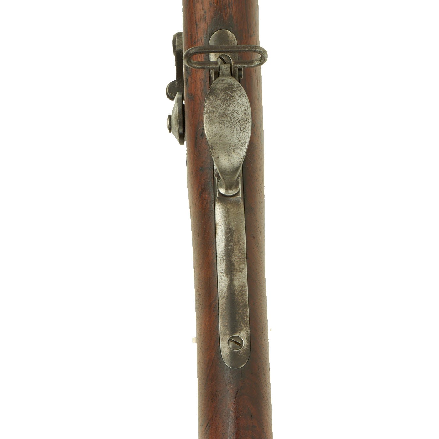The butt plate is marked U.S. and both barrel bands are U marked. Metal finish very nice, with a dark patina on most components, with just a bit of peppering. It does look like there has been some overall peppering in the distant past, long cleaned away. Center fire breechloader, .45 cal., two bands, two sling swivels with stacking swivel, standard sliding sight, and standard ramrod. Lock is marked with an eagle and U.S. / SPRINGFIELD, manufactured by Springfield Armory, Springfield Massachusetts.
