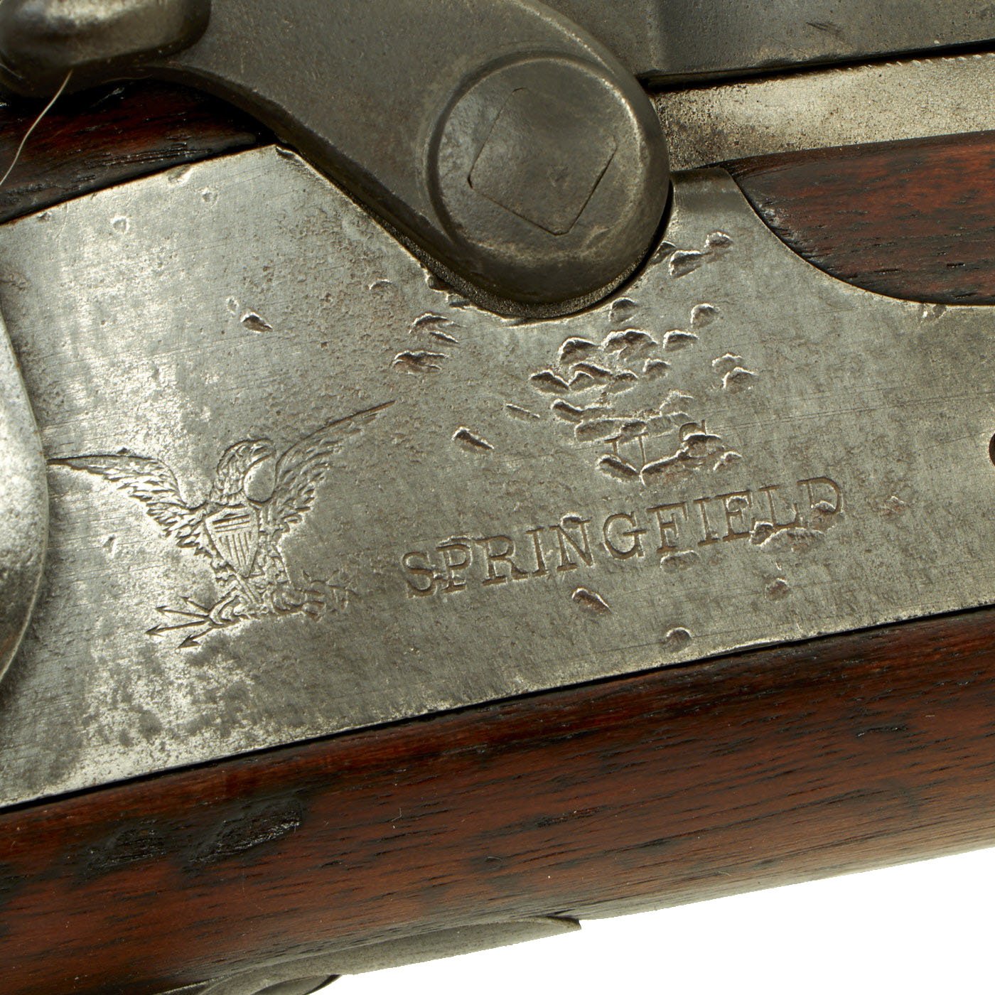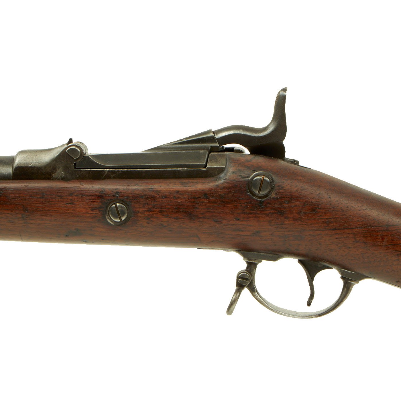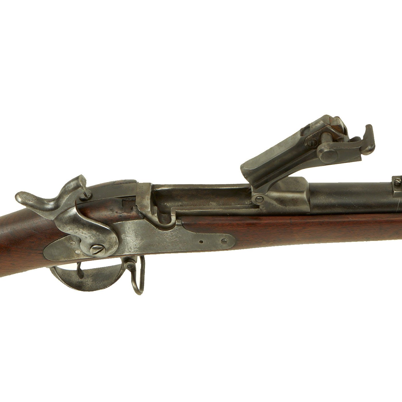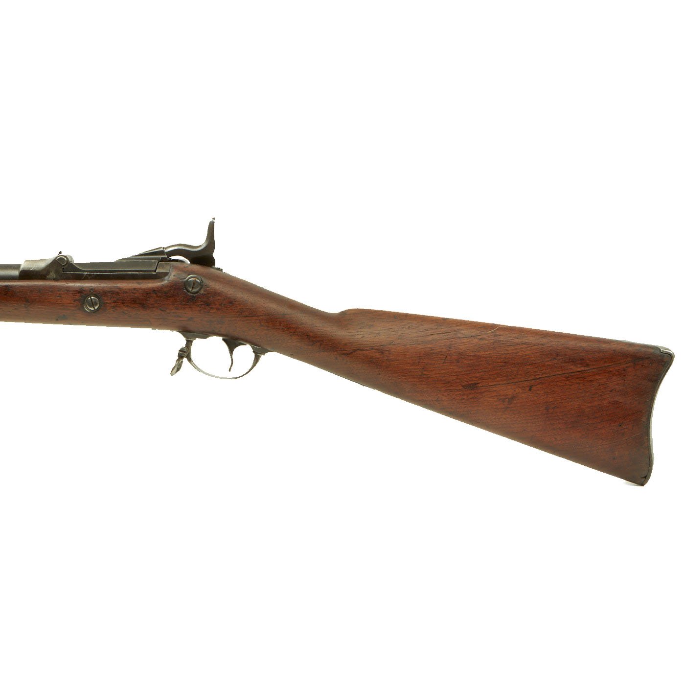 The butt plate is marked U.S. and both barrel bands are U marked. Metal finish very nice, with a dark patina on most components, with just a bit of peppering. It does look like there has been some overall peppering in the distant past, long cleaned away. Center fire breechloader, .45 cal., two bands, two sling swivels with stacking swivel, standard sliding sight, and standard ramrod. Lock is marked with an eagle and U.S. / SPRINGFIELD, manufactured by Springfield Armory, Springfield Massachusetts.