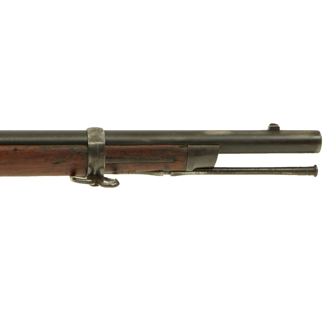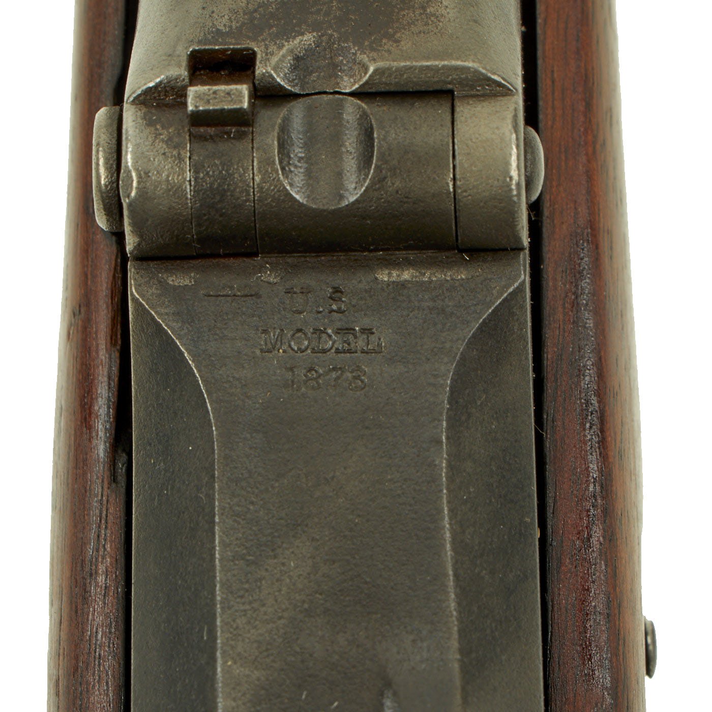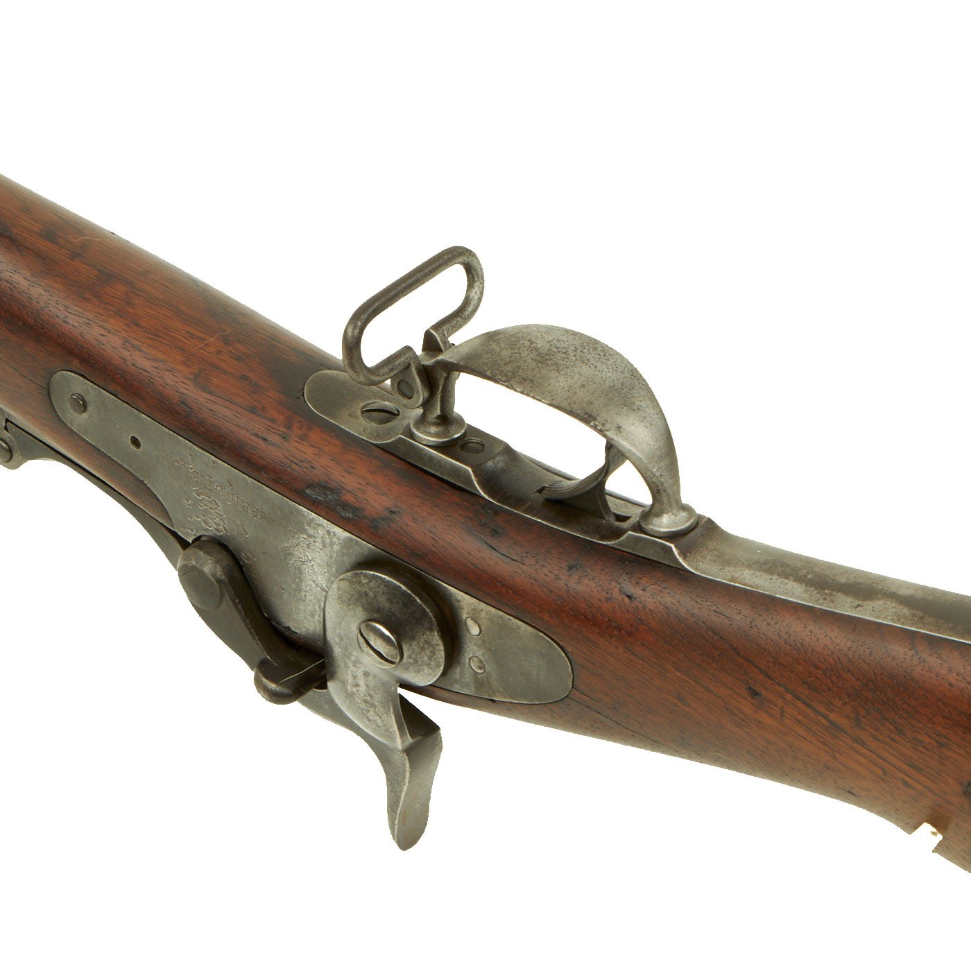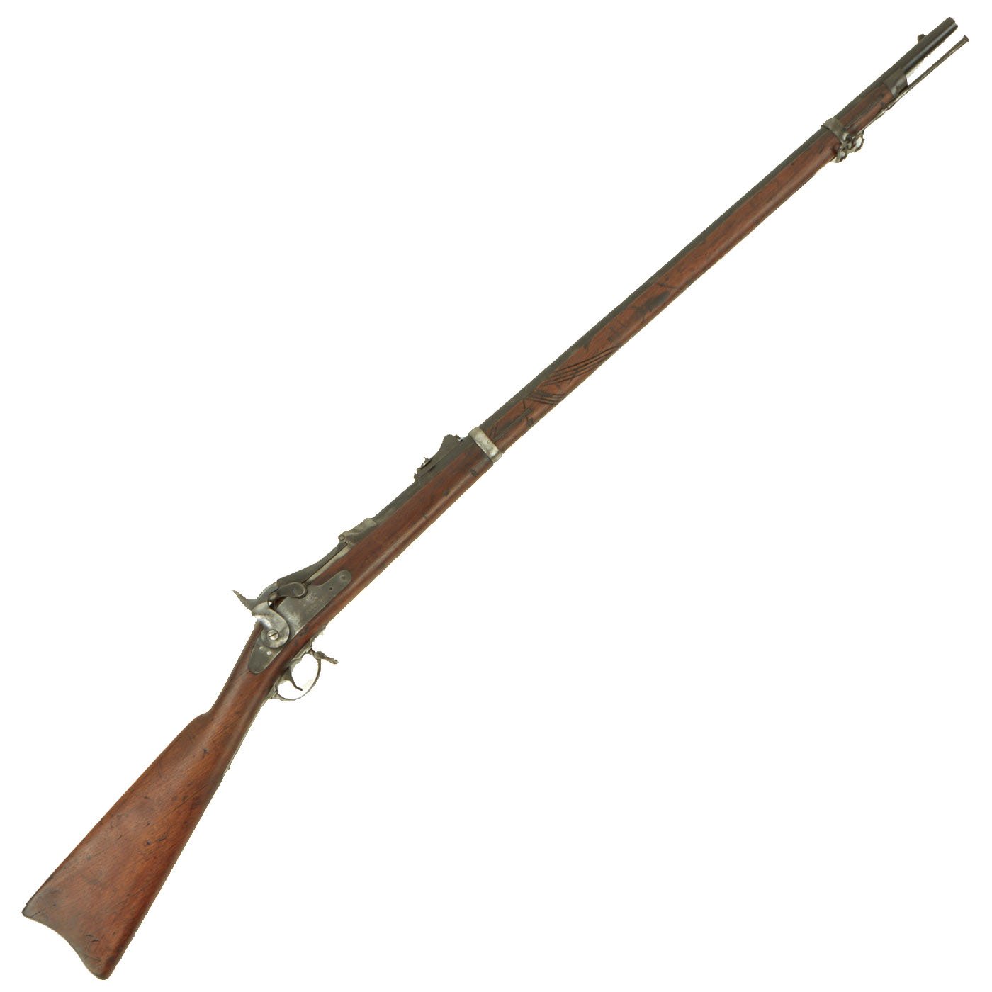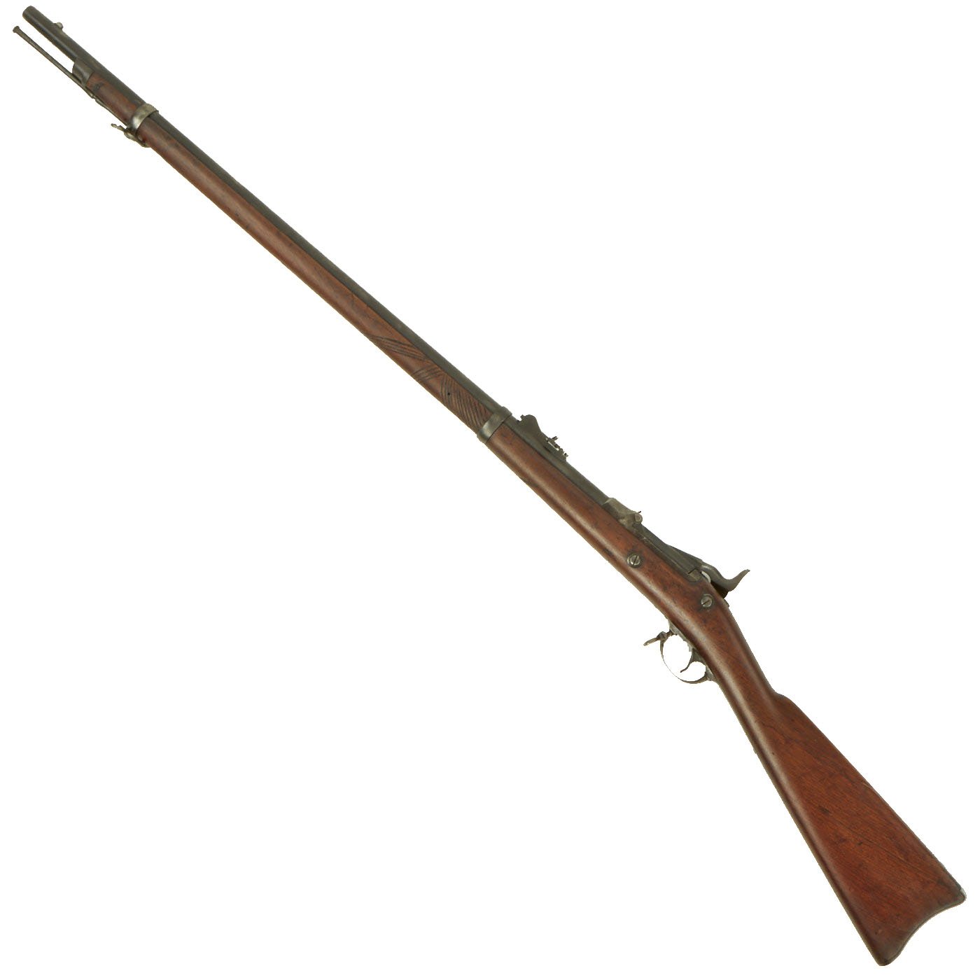 The butt plate is marked U.S. and both barrel bands are U marked. Metal finish very nice, with a dark patina on most components, with just a bit of peppering. It does look like there has been some overall peppering in the distant past, long cleaned away. Center fire breechloader, .45 cal., two bands, two sling swivels with stacking swivel, standard sliding sight, and standard ramrod. Lock is marked with an eagle and U.S. / SPRINGFIELD, manufactured by Springfield Armory, Springfield Massachusetts.