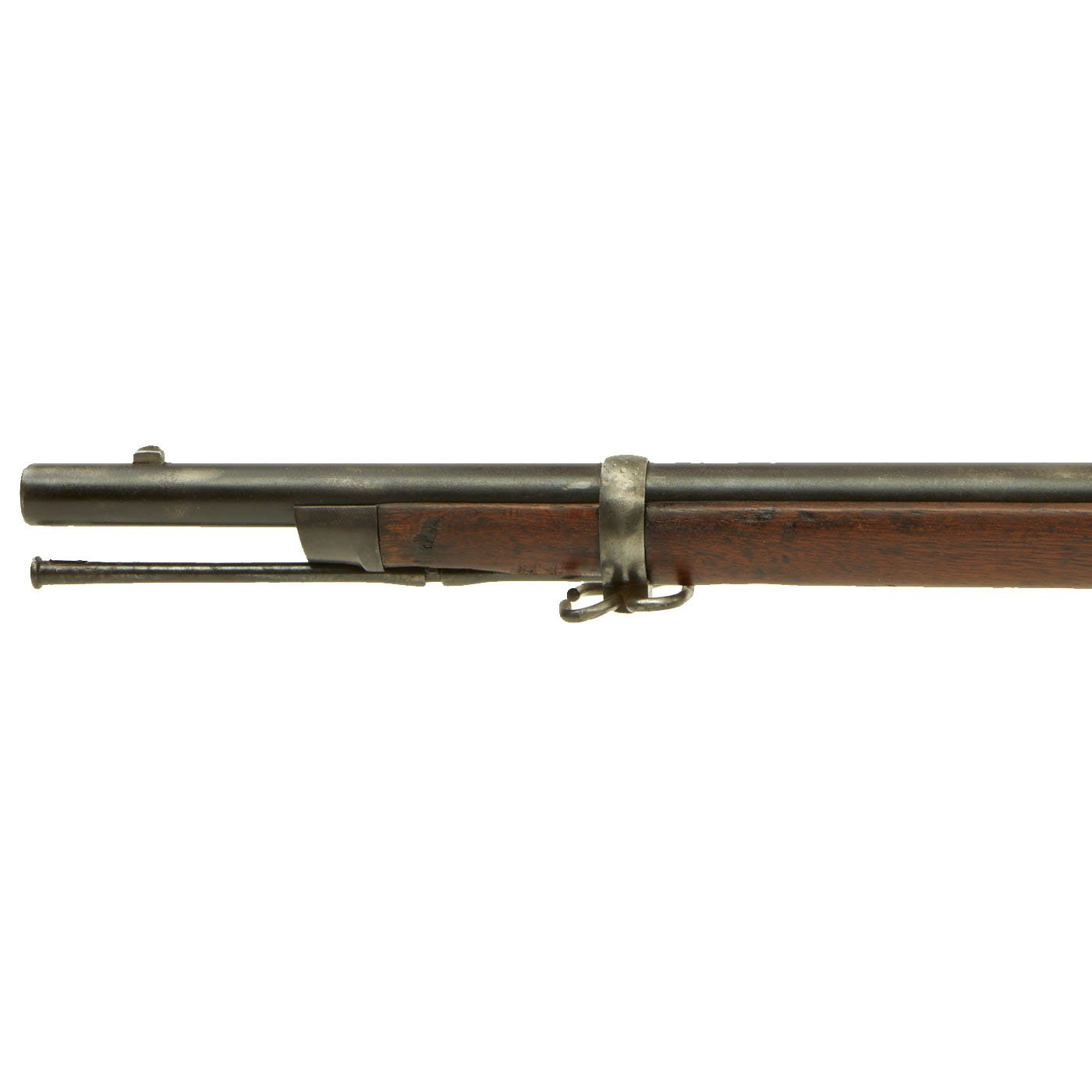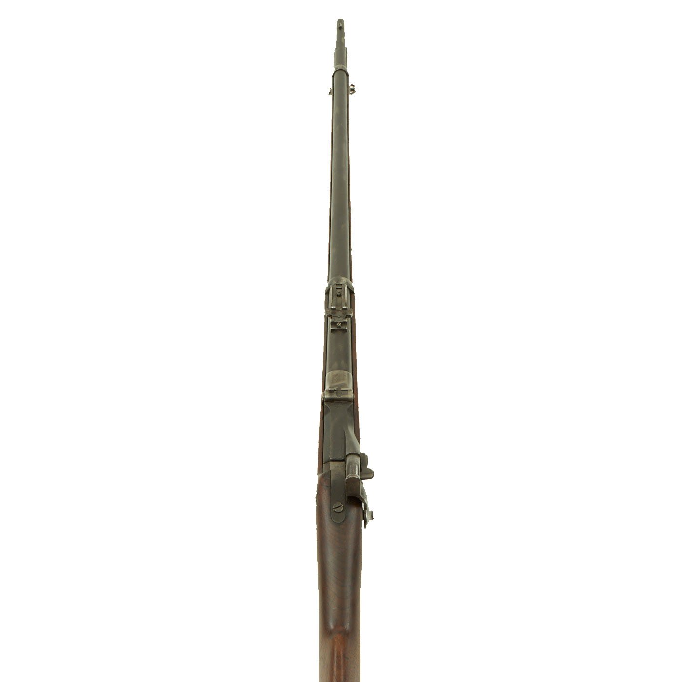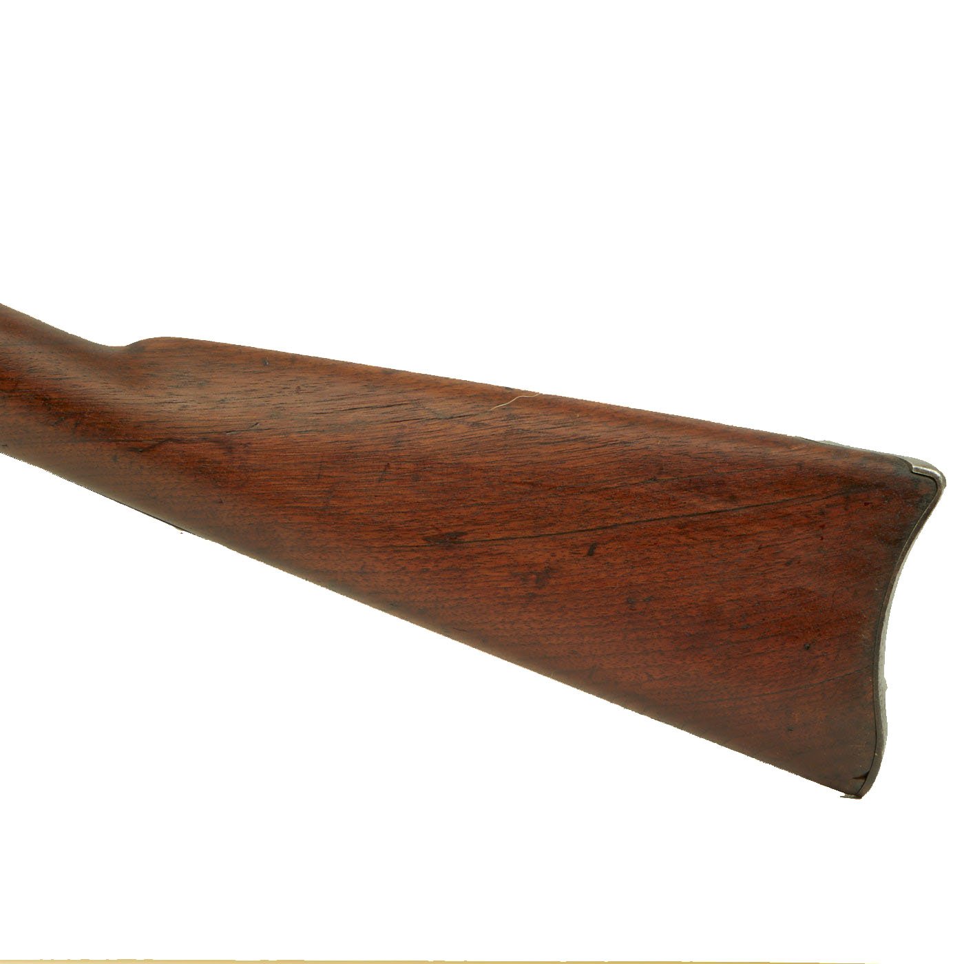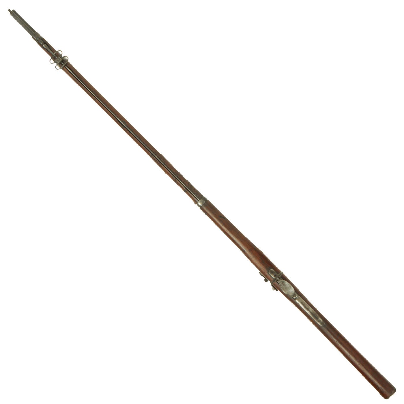 The butt plate is marked U.S. and both barrel bands are U marked. Metal finish very nice, with a dark patina on most components, with just a bit of peppering. It does look like there has been some overall peppering in the distant past, long cleaned away. Center fire breechloader, .45 cal., two bands, two sling swivels with stacking swivel, standard sliding sight, and standard ramrod. Lock is marked with an eagle and U.S. / SPRINGFIELD, manufactured by Springfield Armory, Springfield Massachusetts.