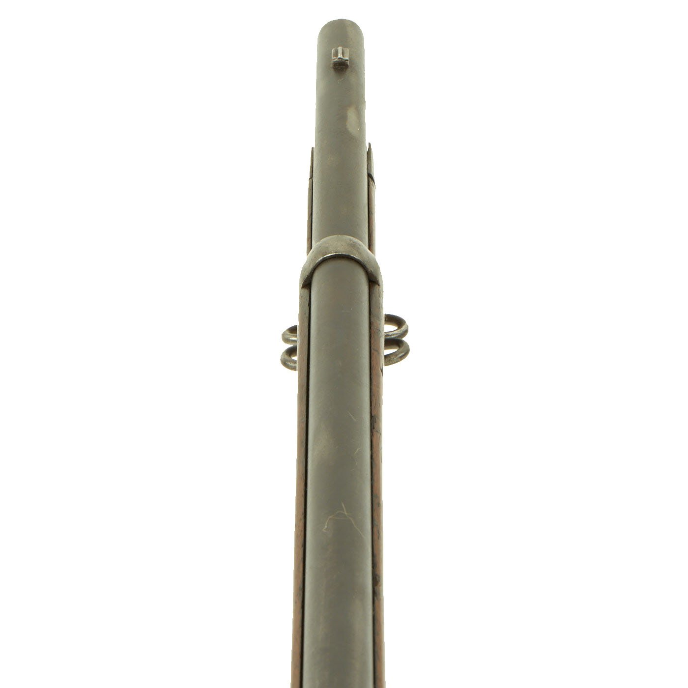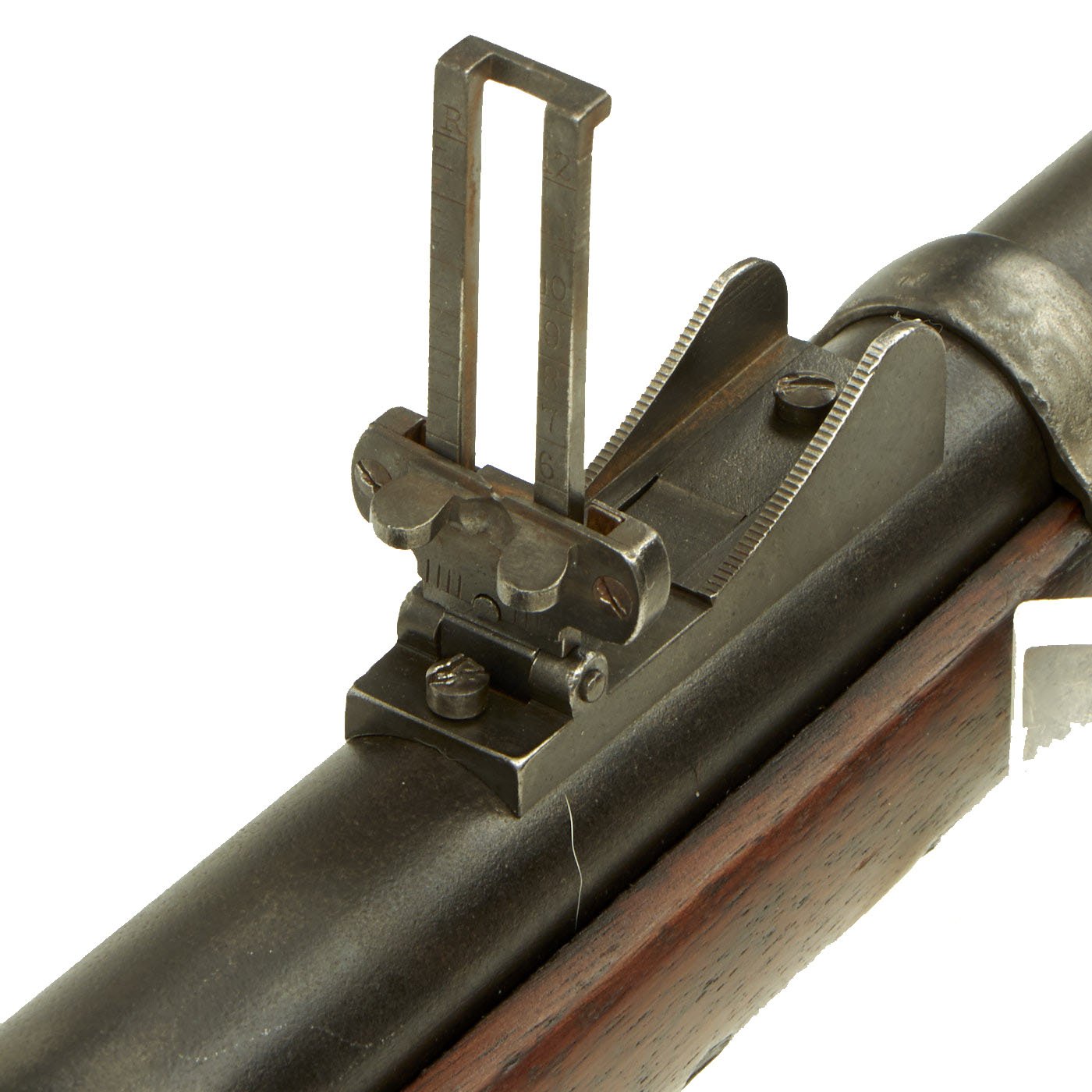 Additional marks of interest include inspectors' and proof marks around the breech end of the barrel: a very faint V over a P over an eagle's head on the left side just above the stock. The upper right corner of the standard sliding sight leaf and the left side of the ramp are marked R to indicate that the sight graduations are for a rifle and not a carbine.