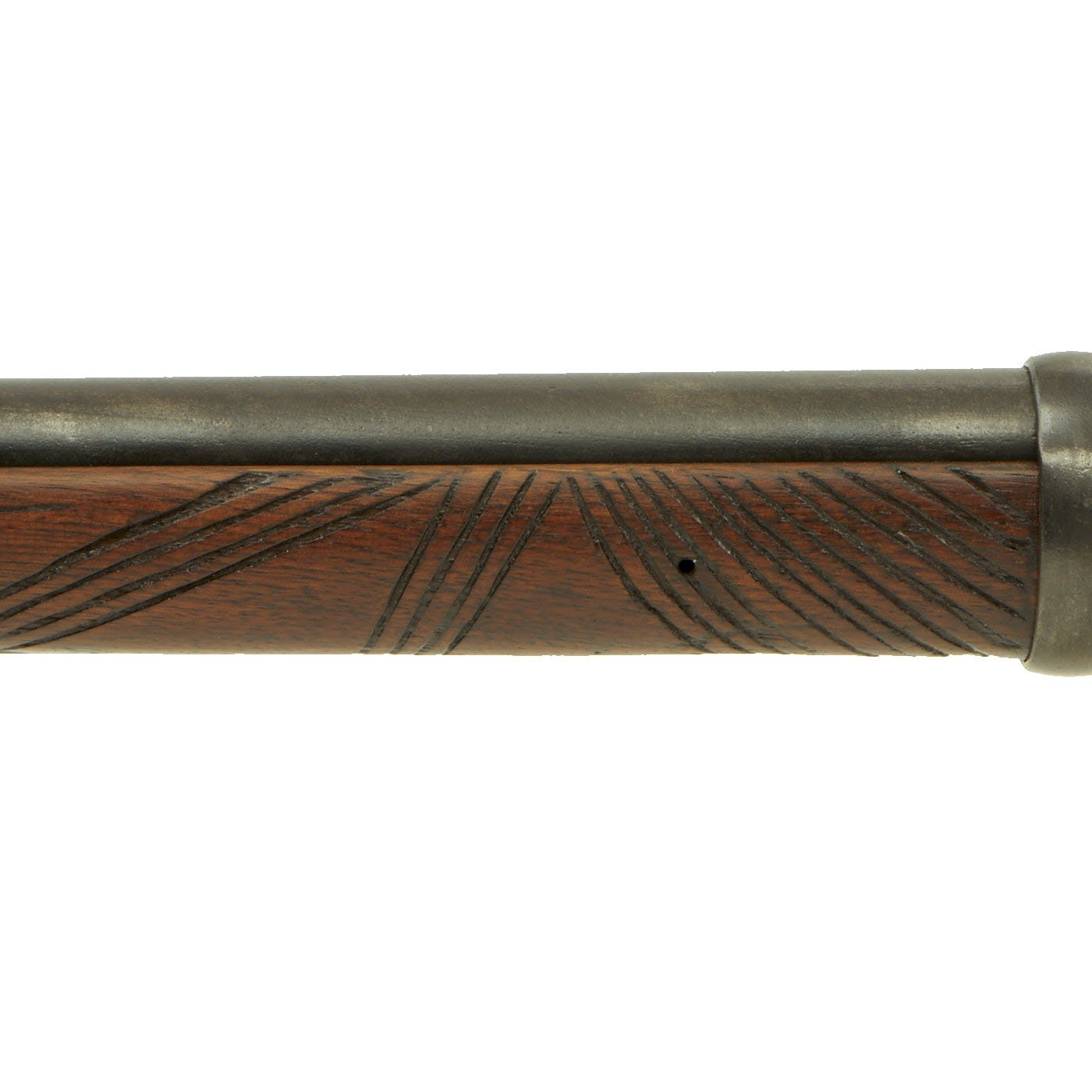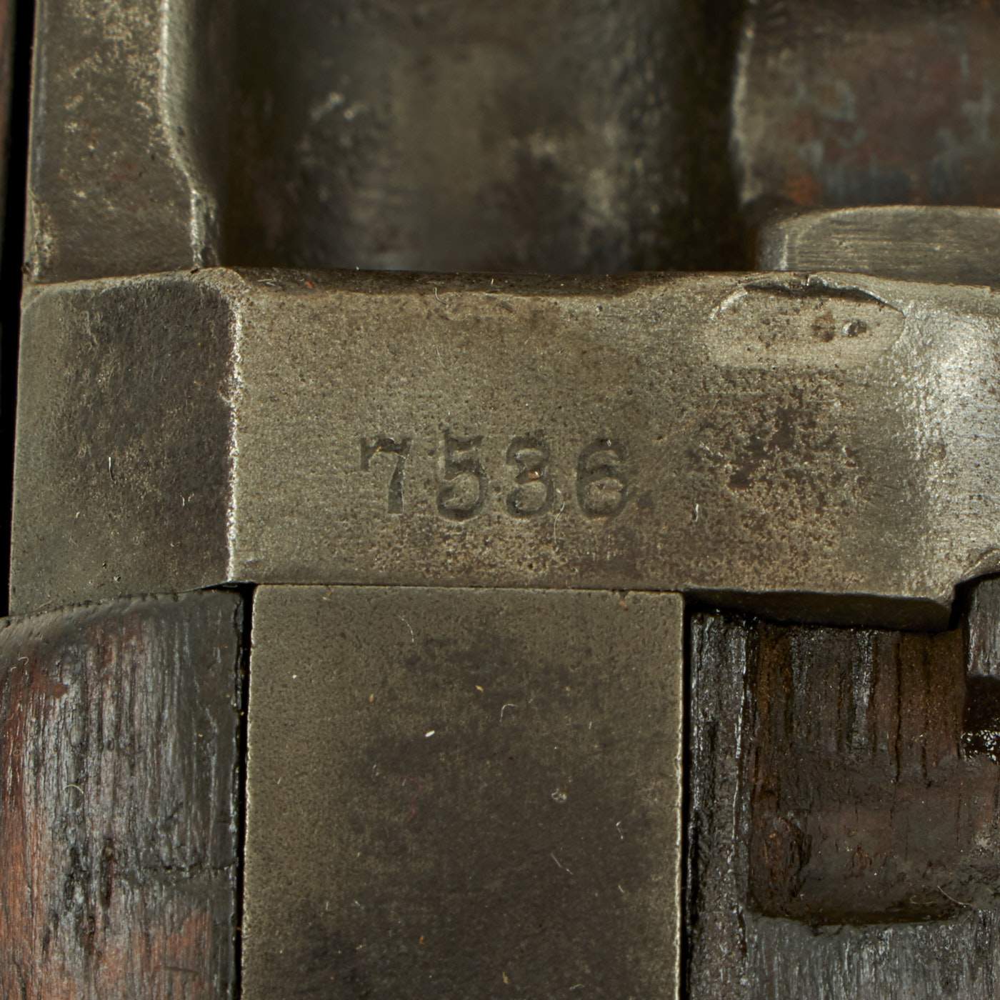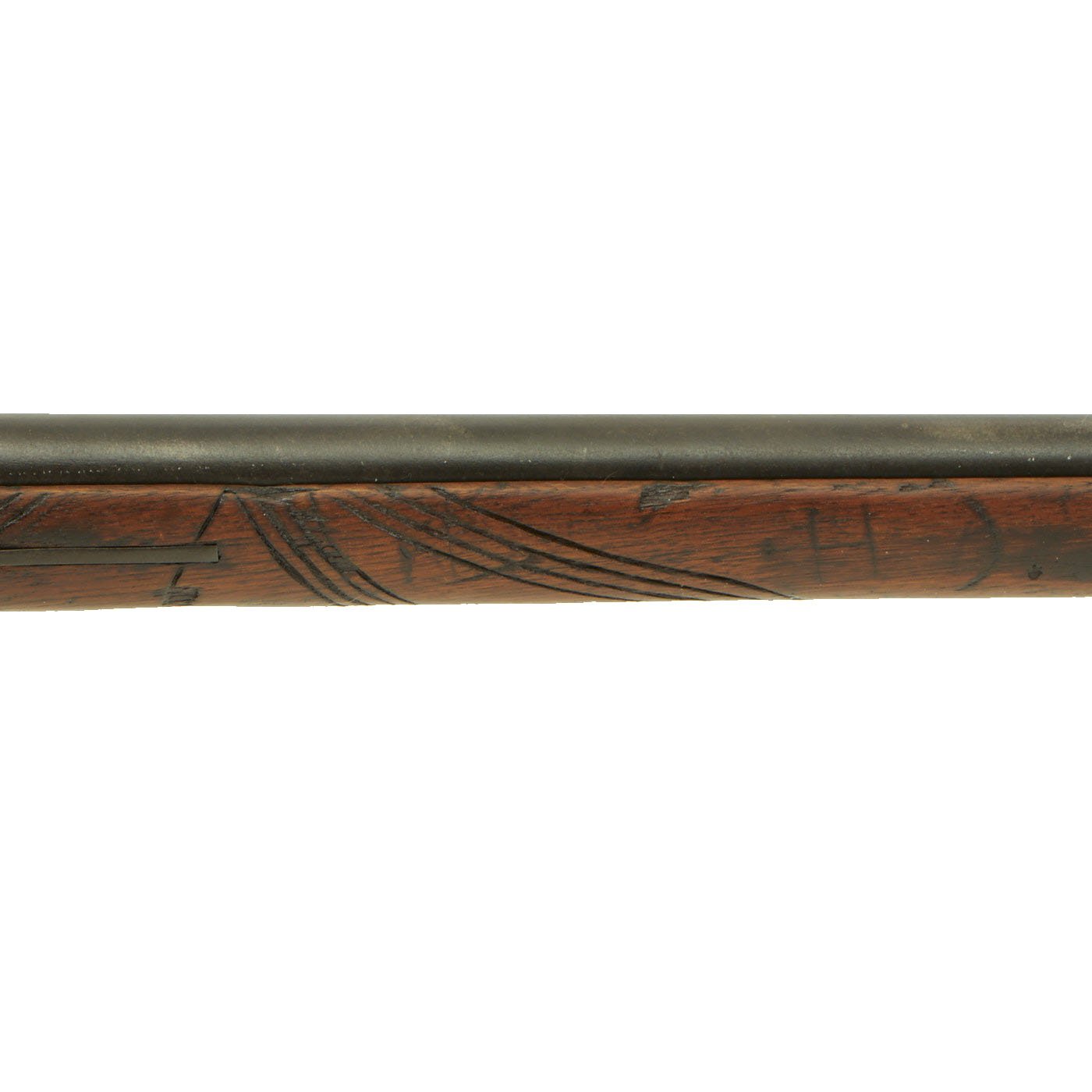 Offered in very nice condition is this trapdoor rifle in .45-70 government caliber, Serial # 7586? with an overall worn metal finish with all proofs still present. The serial number has the last number unfortunately worn away, but serial numbers for the entire production stopped at 567882, so it has to be production in 1877. The stock is in very good original condition, with lots of character. It has some designs carved into the fore stock above the lower barrel band, possibly to make it easier to grip. There is some separation along the grain lines on the butt stock, which have been filled from what we can tell. Most likely it dried out, and the wood started to split in areas, now in the long past.