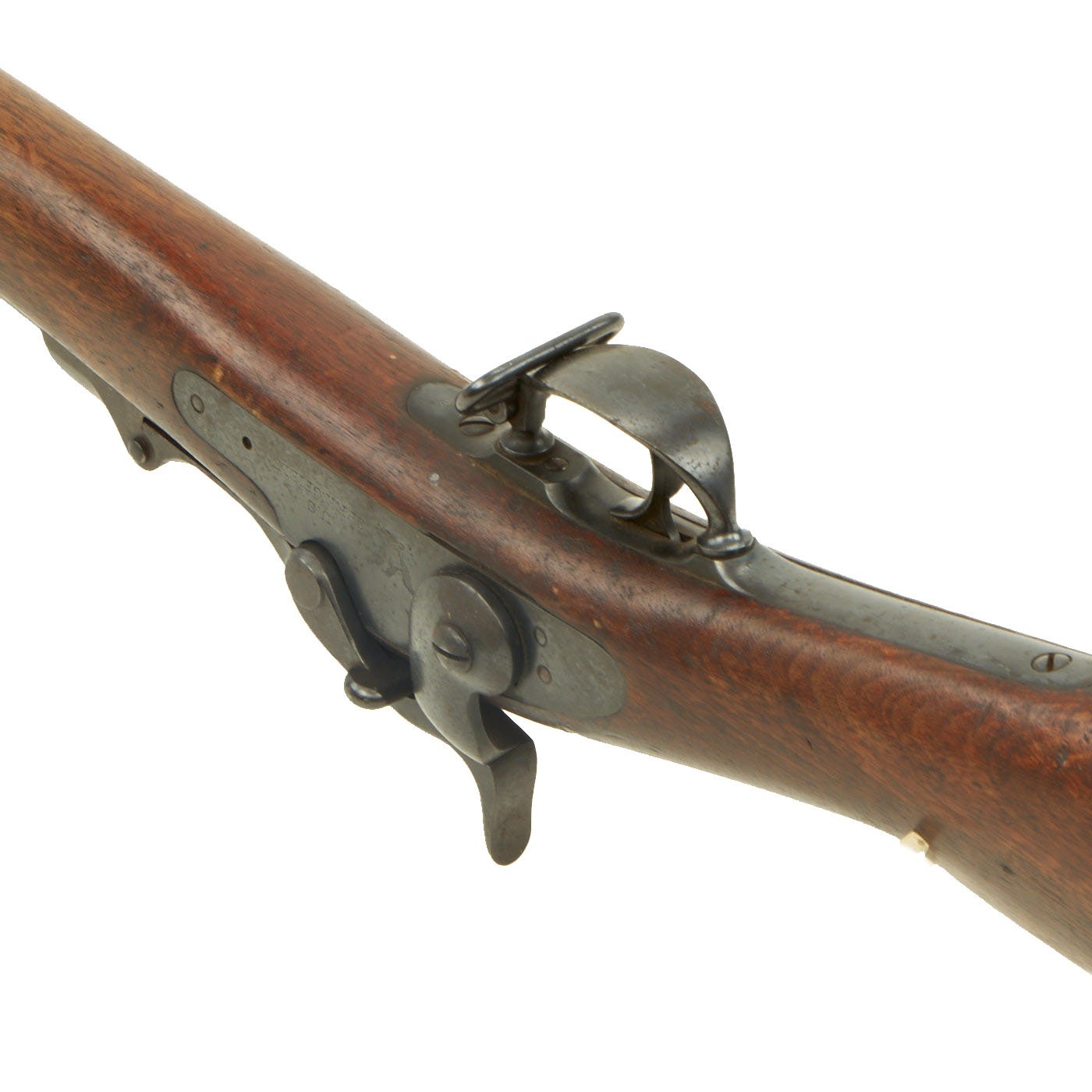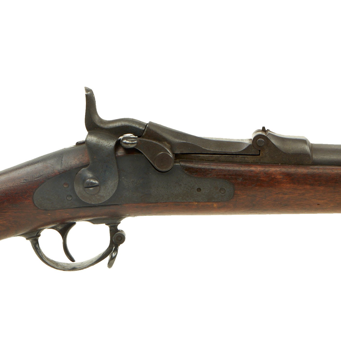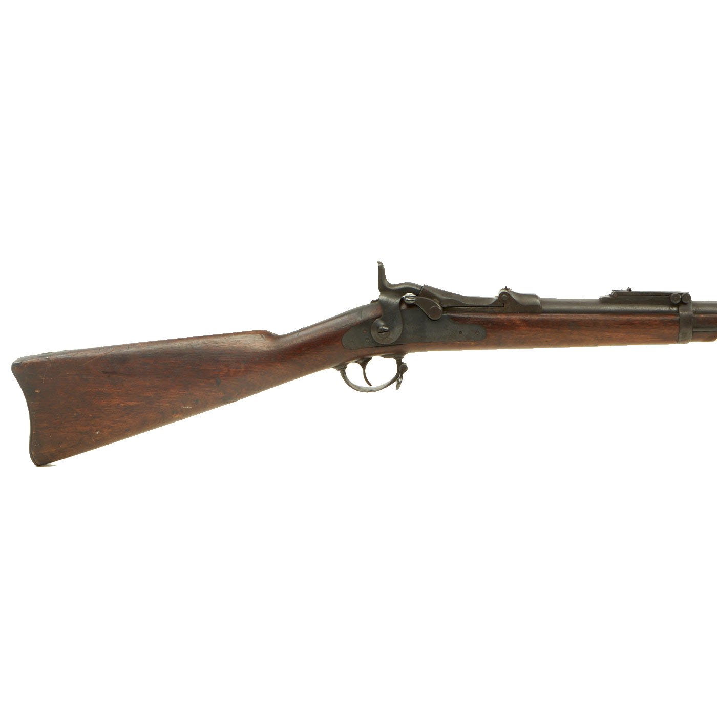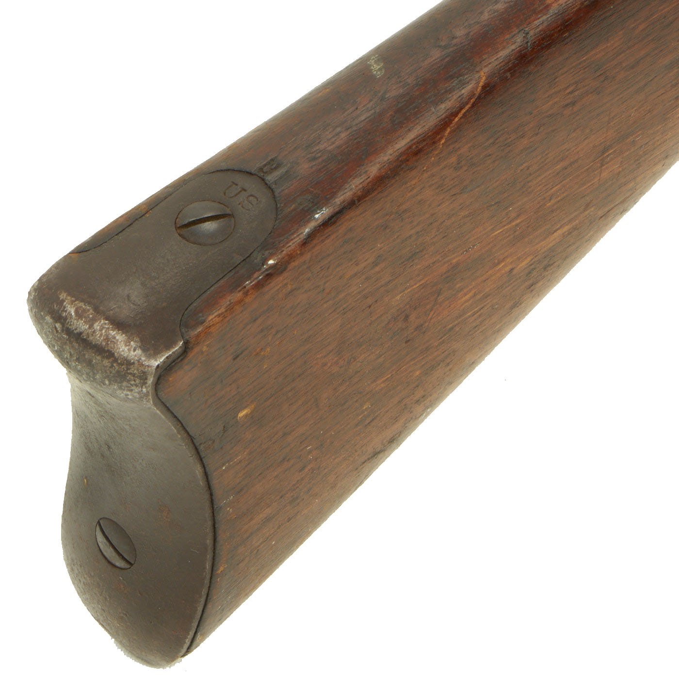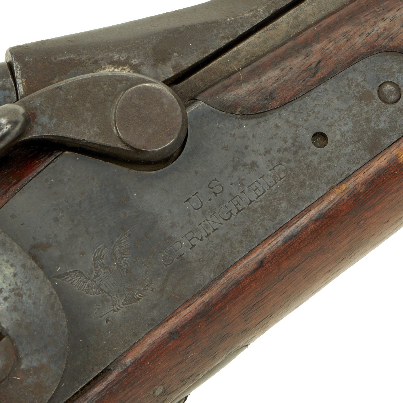 The butt plate is marked U.S. and both barrel bands are U marked. Metal finish is a slightly worn plum patina, with peppering in places, as shown. Center fire breechloader, .45 cal., two bands, two sling swivels with stacking swivel, Buffington adjustable sight, and standard ramrod. Lock is marked with an eagle and U.S. / SPRINGFIELD, manufactured by Springfield Armory, Springfield Massachusetts.