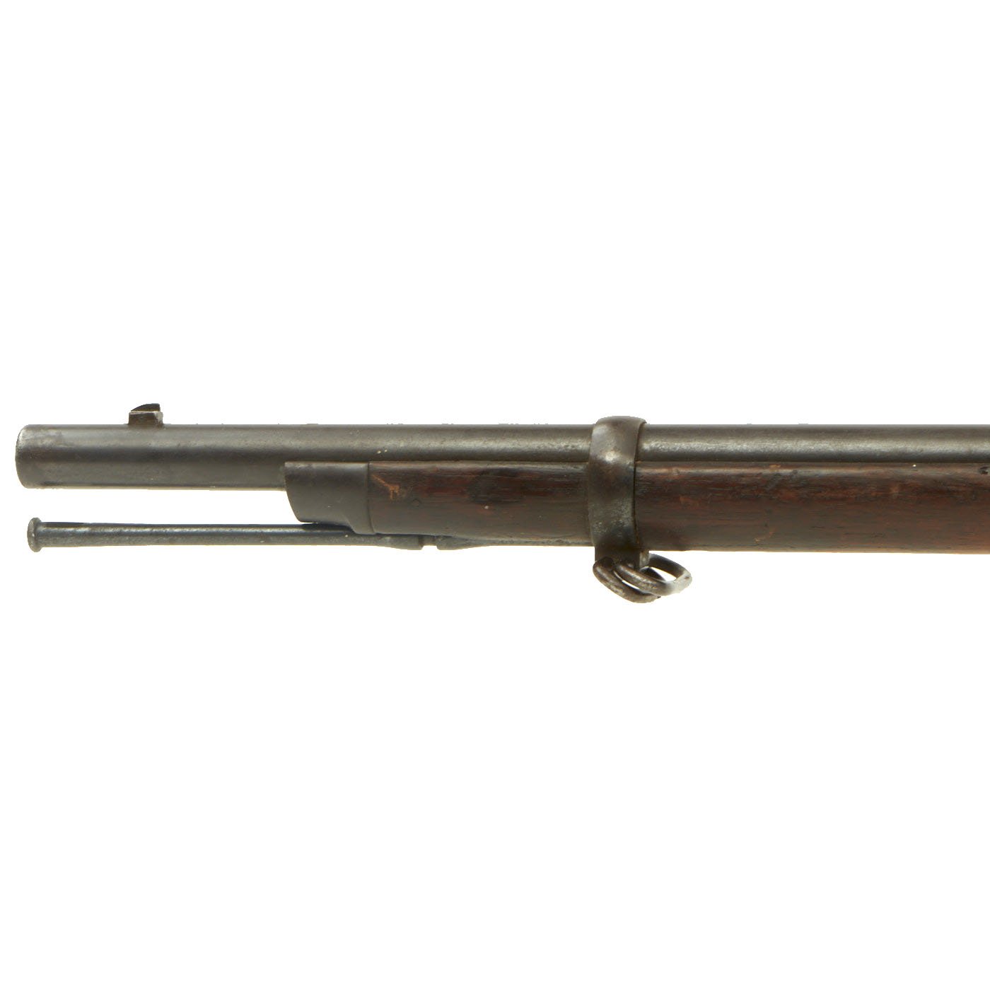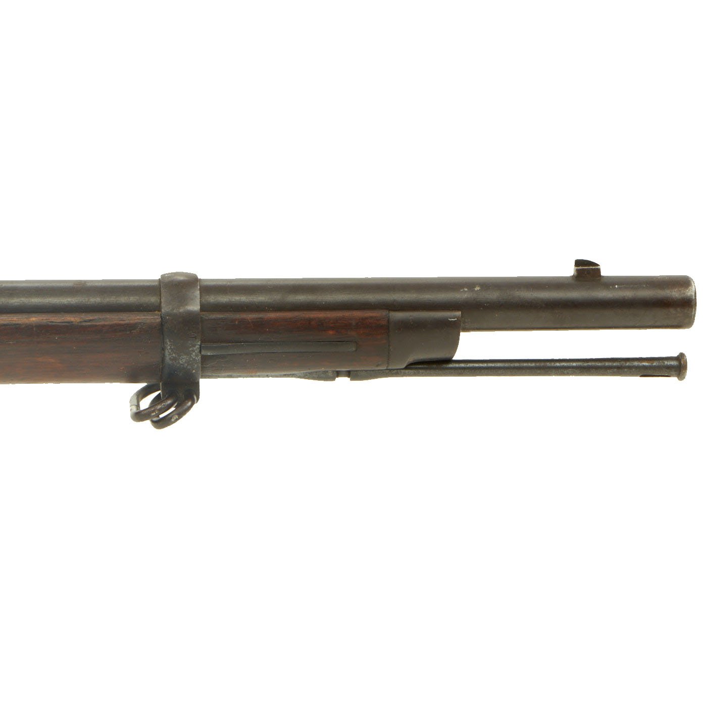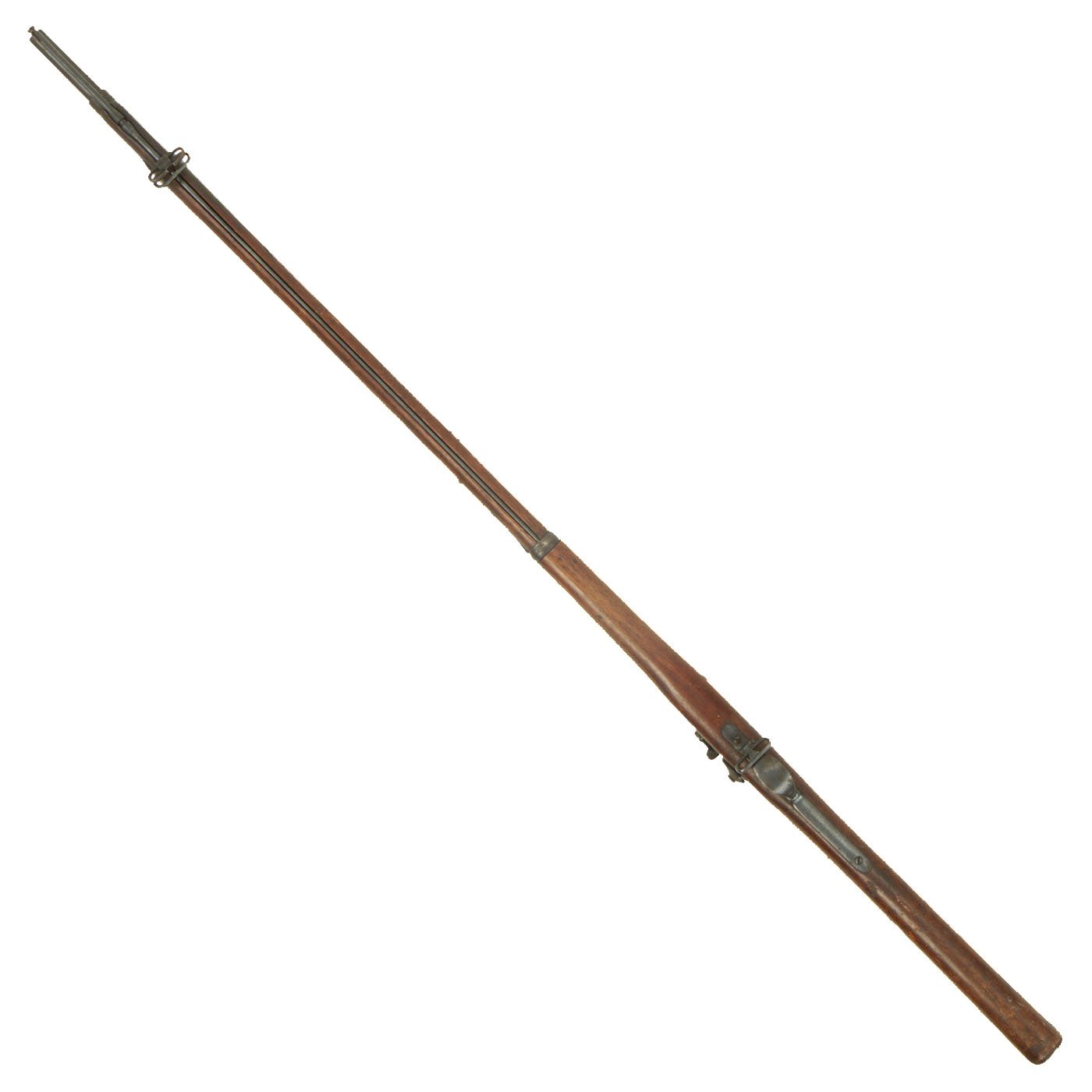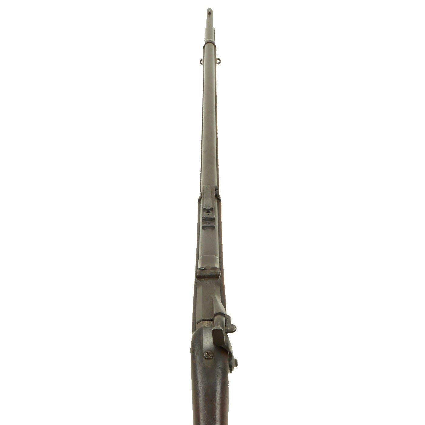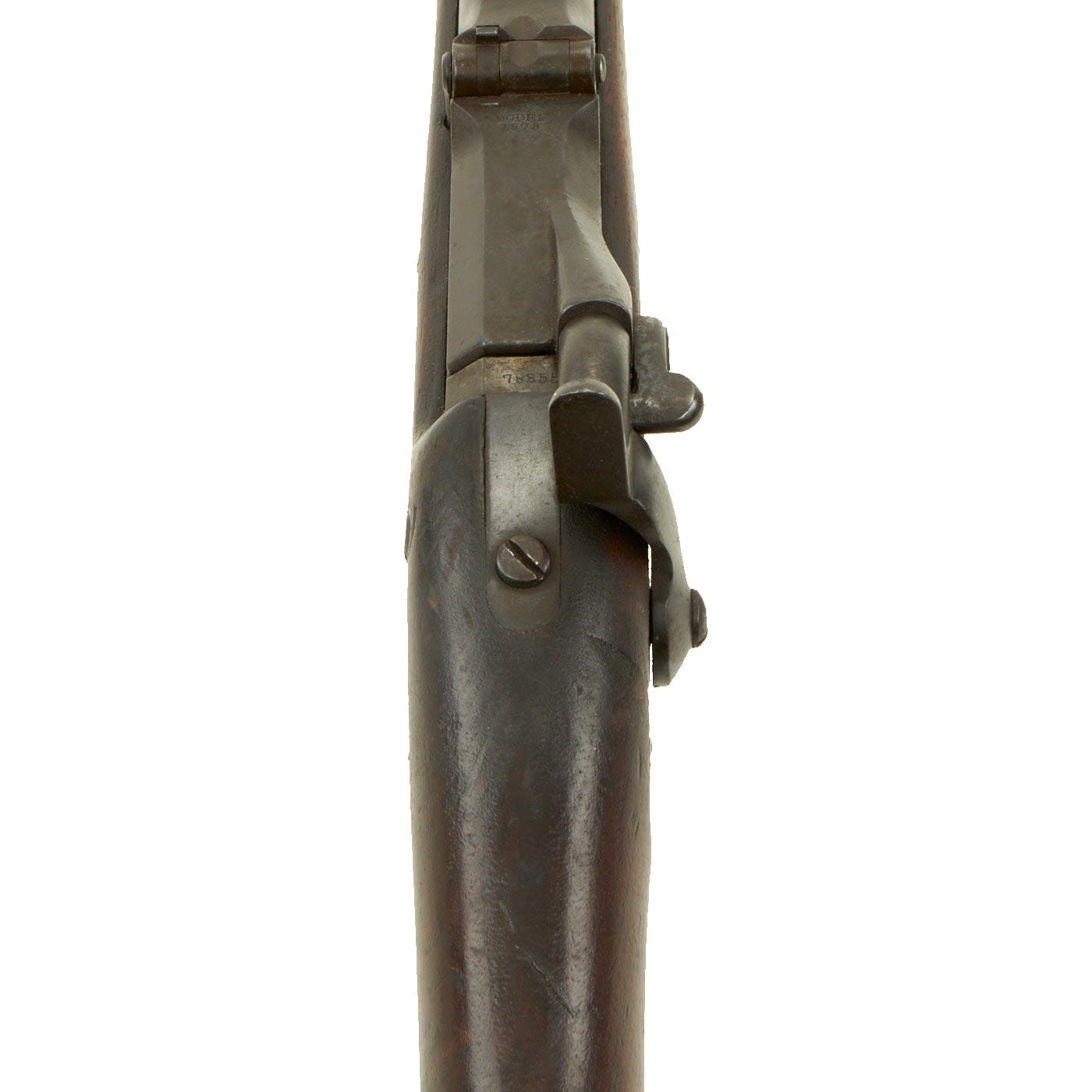 The butt plate is marked U.S. and both barrel bands are U marked. Metal finish is a slightly worn plum patina, with peppering in places, as shown. Center fire breechloader, .45 cal., two bands, two sling swivels with stacking swivel, Buffington adjustable sight, and standard ramrod. Lock is marked with an eagle and U.S. / SPRINGFIELD, manufactured by Springfield Armory, Springfield Massachusetts.