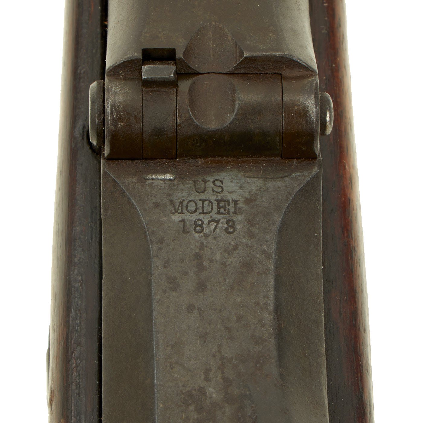 Offered in very nice condition is this trapdoor rifle in .45-70 government caliber, Serial # 78355, with an overall very good metal finish with all proofs still present. The serial number indicates production in 1878, however the stock inspection proof has been worn away. The stock is in very good original condition, with lots of character. There are some small dents and scratches in the wood, as expected on a rifle this age, but the stock does not appear to have had any major repairs. It has however been arsenal reconditioned, which has removed the original cartouches. This was probably done when the rifle was fitted with a Buffington rear adjustable sight. The trigger is still the correct smooth type, so it was not swapped out at arsenal for a serrated one.