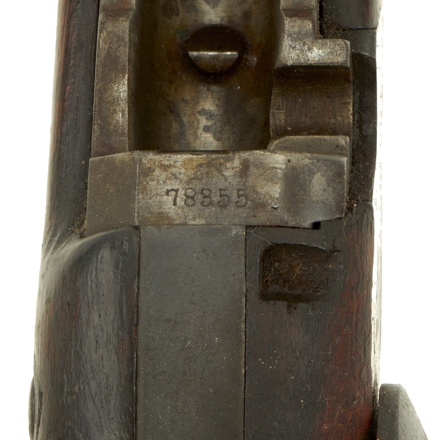 Additional marks of interest include inspectors' and proof marks around the breech end of the barrel: a V over a P over an eagle's head over another P on the left side just above the stock. The upper right corner of the Buffington sight leaf is marked R to indicate that the sight graduations are for a rifle and not a carbine.