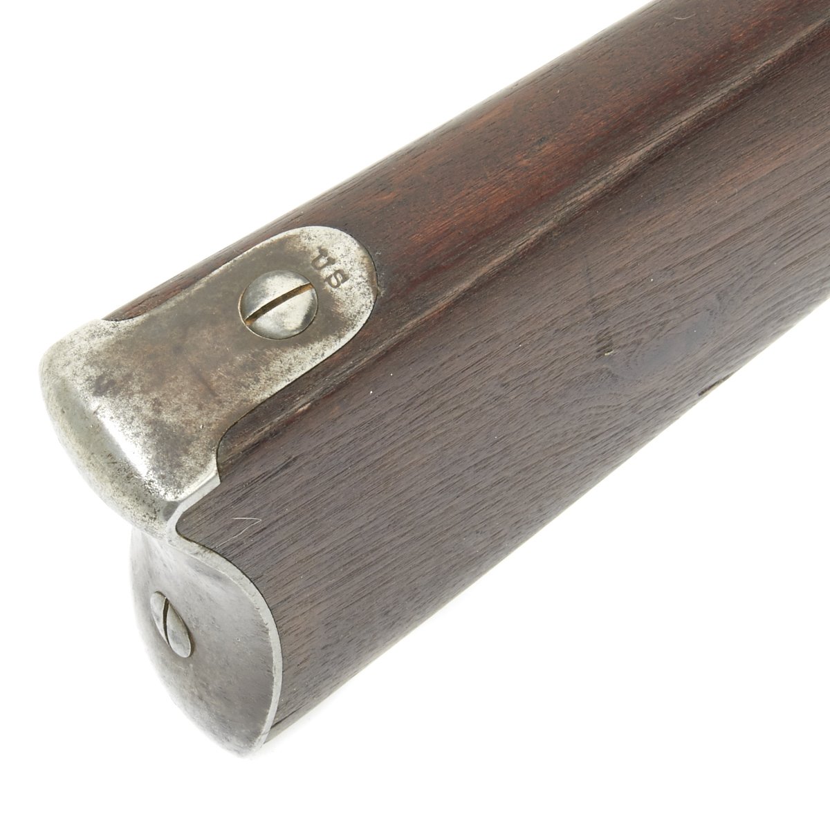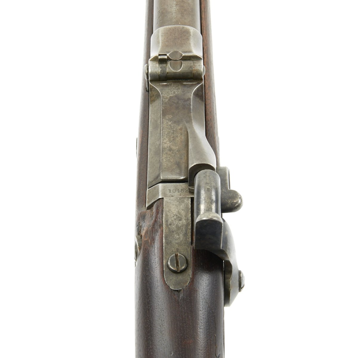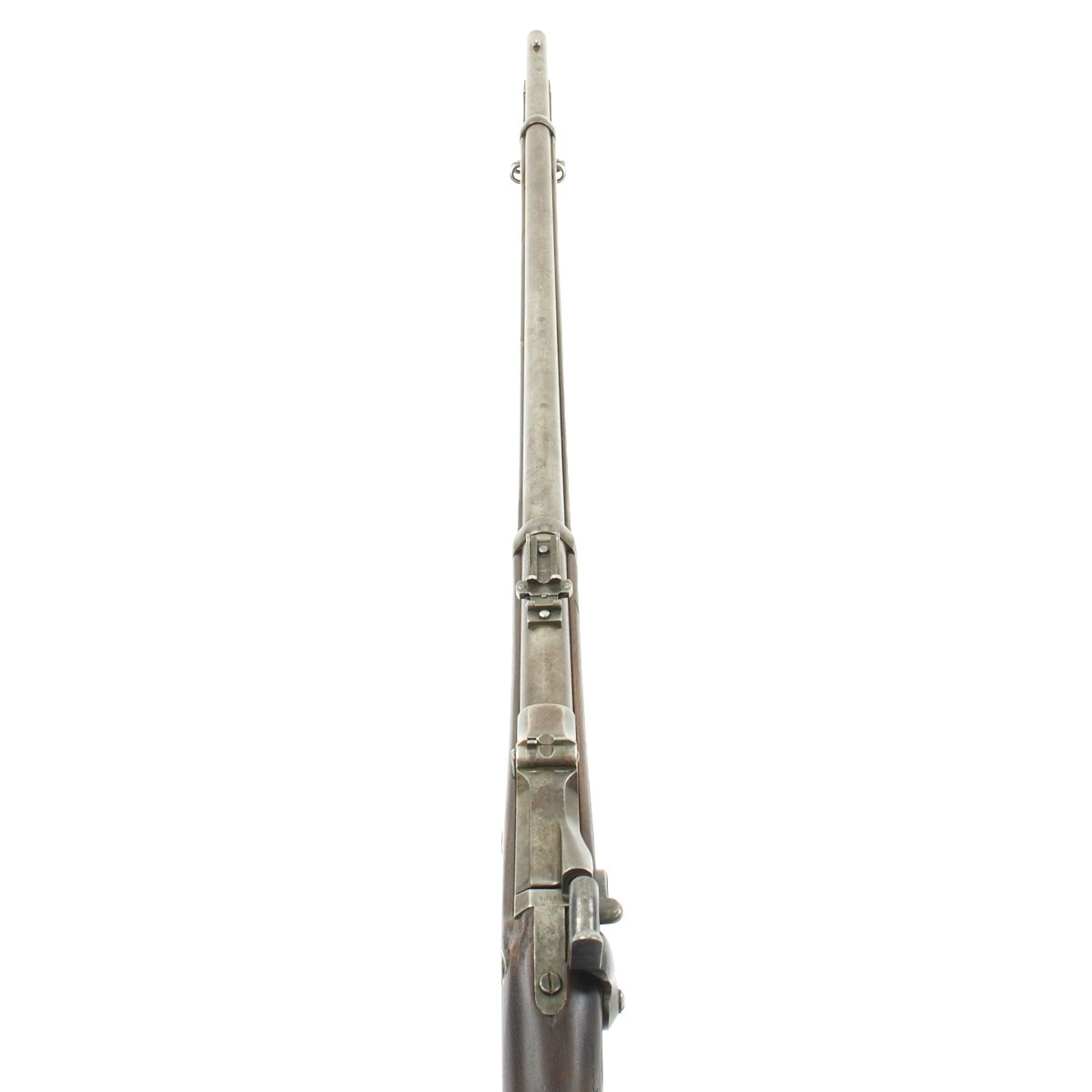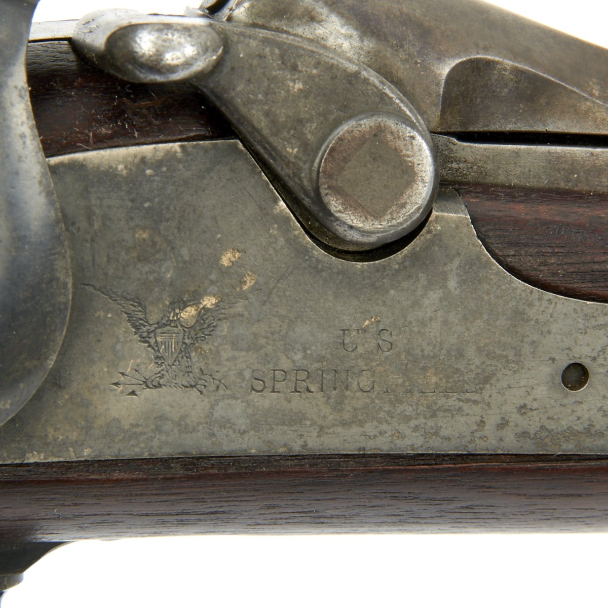 Metal finish is a dull gray patina, with the peppery look of past pitting, however it is still solid. Center fire breechloader, .45 cal., two bands, two sling swivels with stacking swivel, standard sliding sight, and standard ramrod. Lock is marked with an eagle and US SPRINGFIELD, manufactured by Springfield Armory, Springfield Massachusetts.