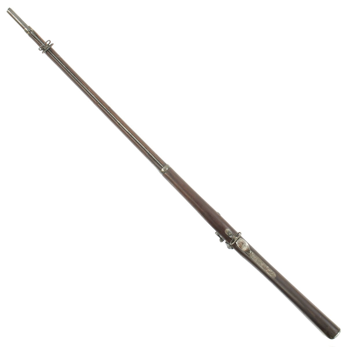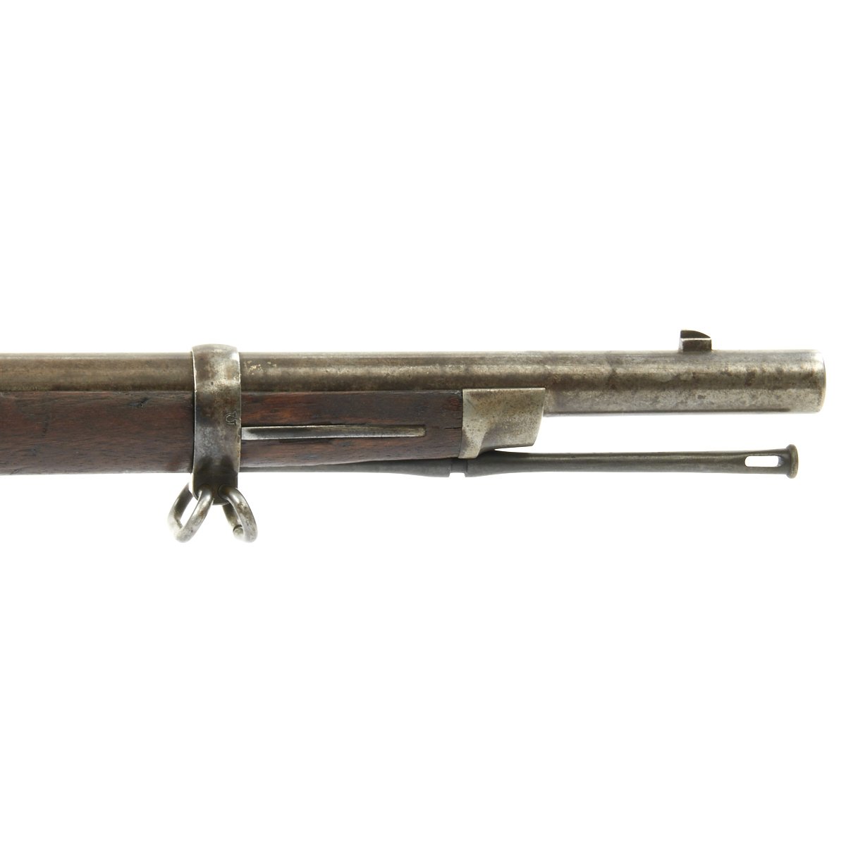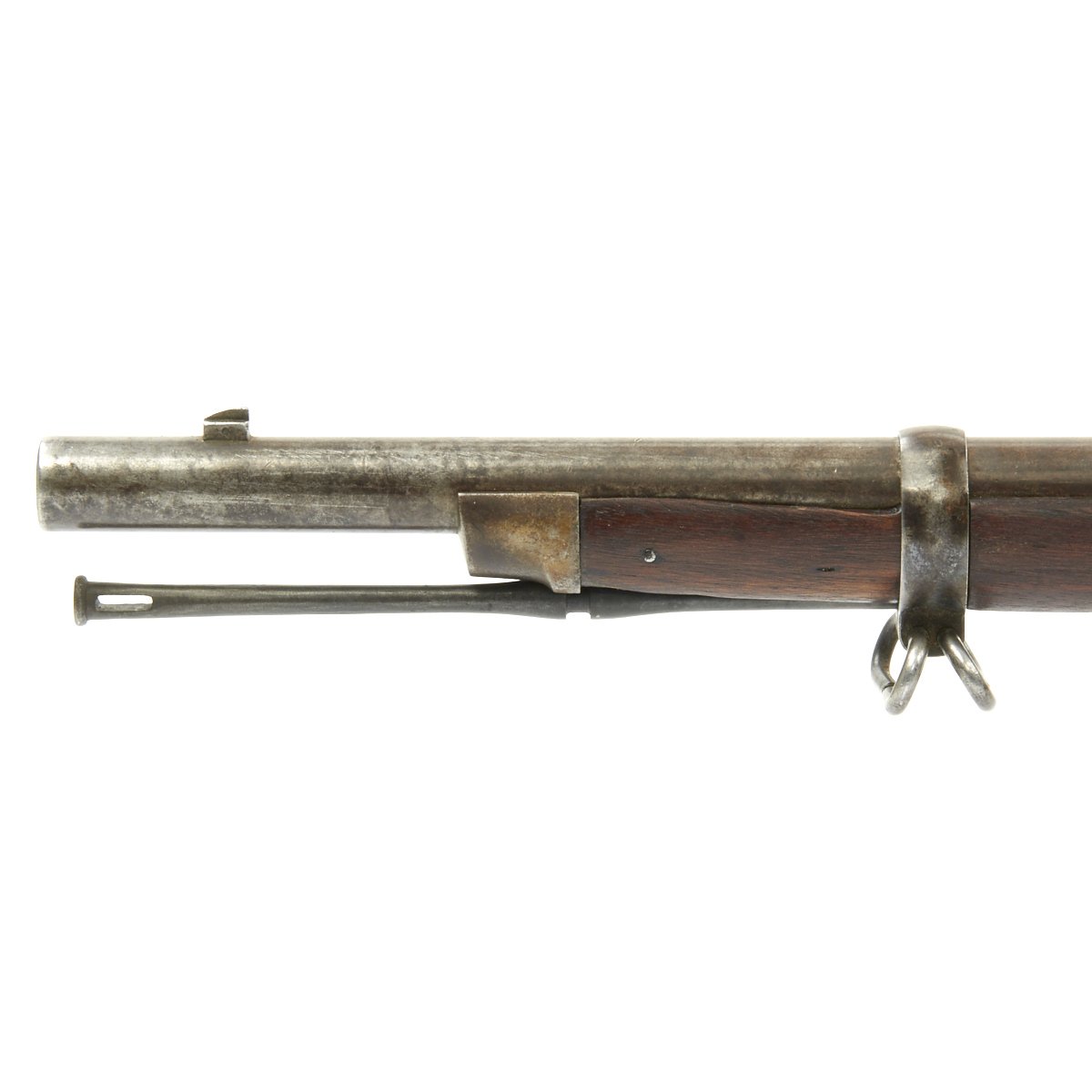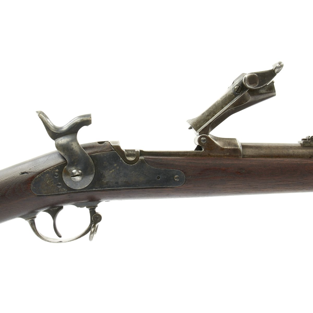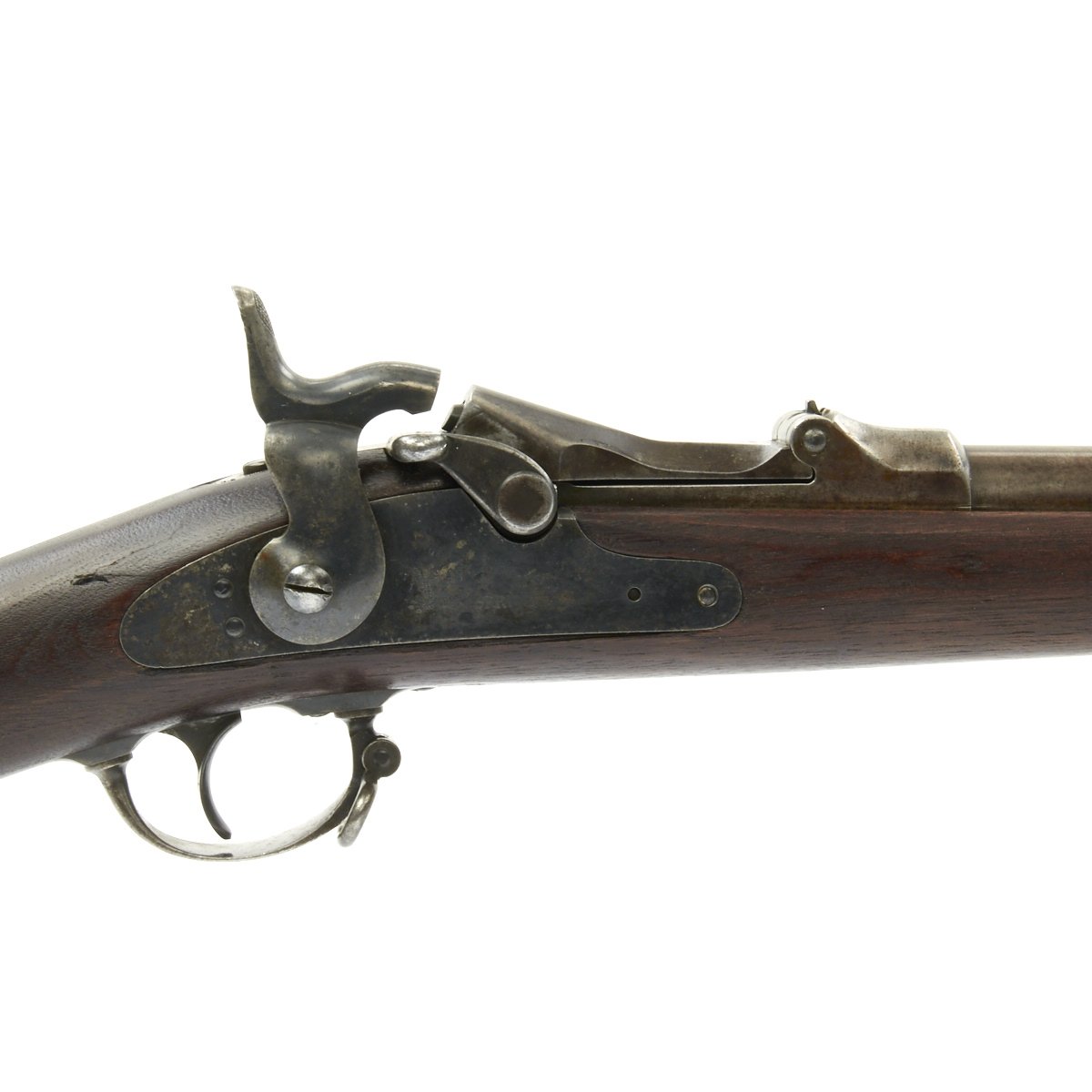 Metal finish is a dull gray patina, with the peppery look of past pitting, however it is still solid. Center fire breechloader, .45 cal., two bands, two sling swivels with stacking swivel, standard sliding sight, and standard ramrod. Lock is marked with an eagle and US SPRINGFIELD, manufactured by Springfield Armory, Springfield Massachusetts.
