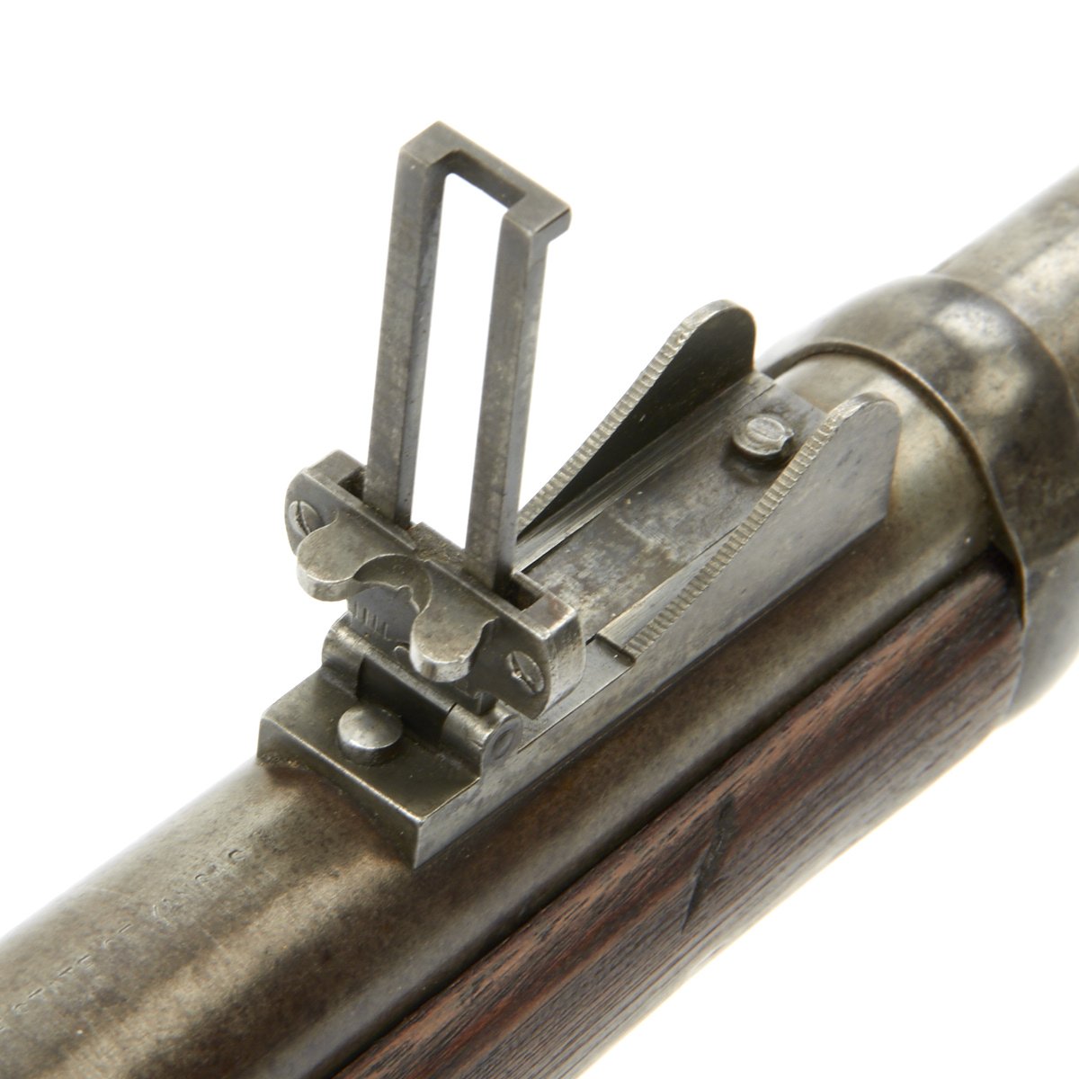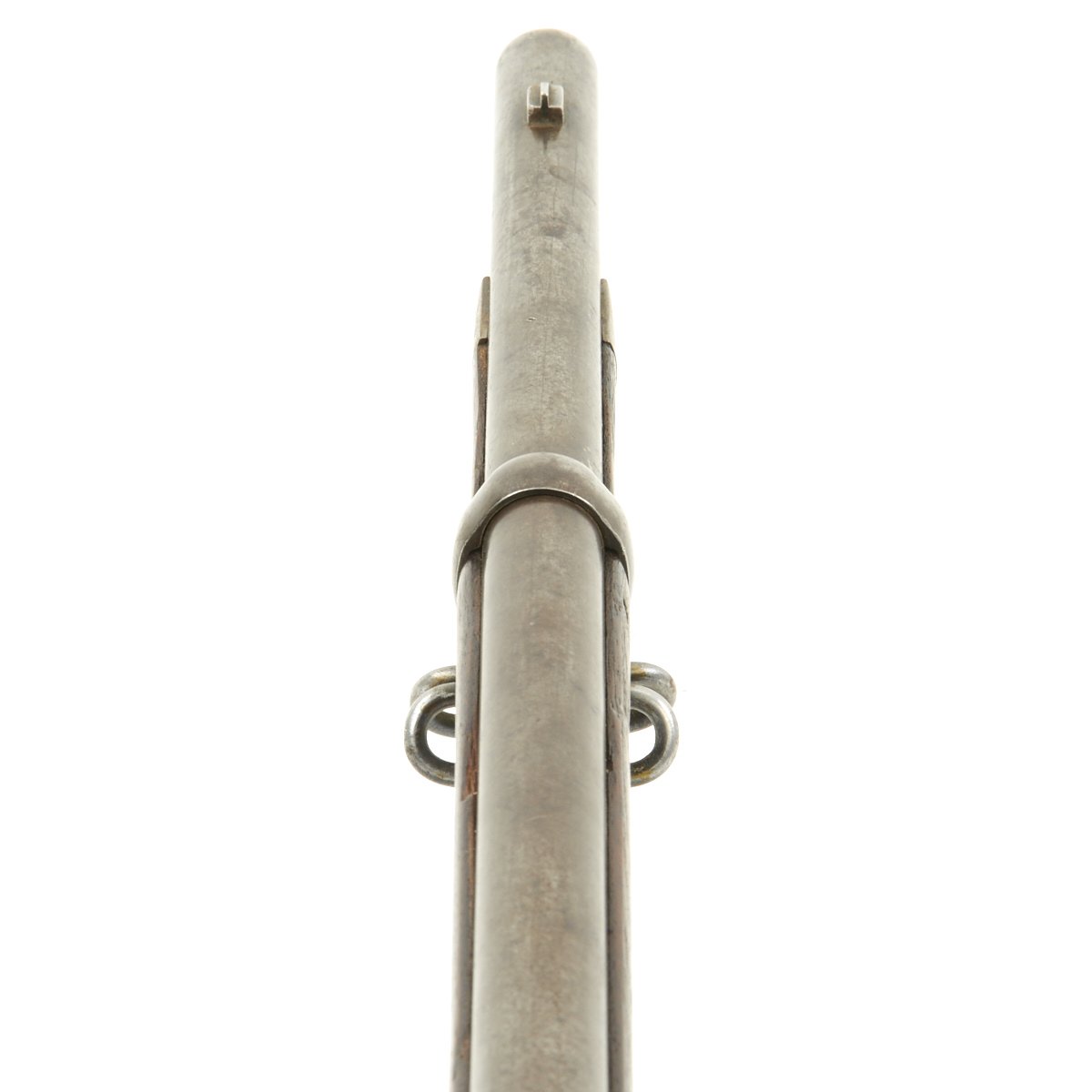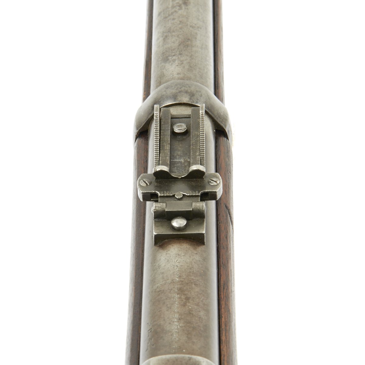 Additional marks of interest include inspectors' and proof marks around the breech end of the barrel: a V over a P over an eagle's head over another P on the left side just above the stock. There is also an I over the chamber. The upper right corner of the standard sliding sight leaf and the left side of the ramp are marked R to indicate that the sight graduations are for a rifle and not a carbine. Sight is in very good condition.