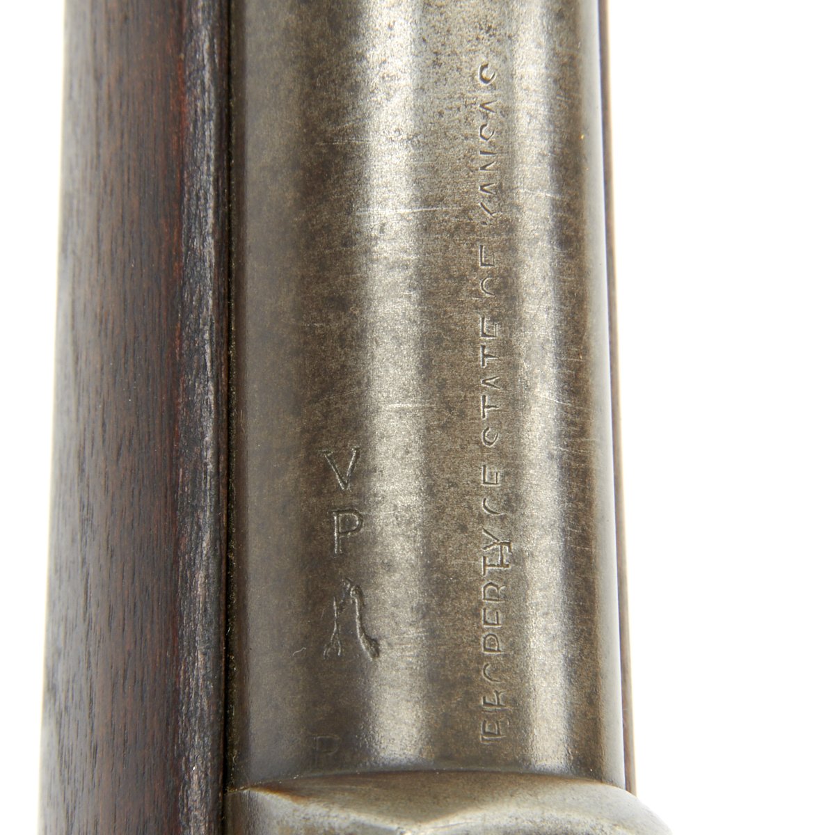 The butt plate is marked U.S. and both barrel bands are U marked. There is also a stamped state ownership marking behind the rear sight: PROPERTY OF STATE OF KANSAS. Many Springfield Trapdoor rifles were shipped to States for use during the frontier period, and this may be one that was sent at that time.