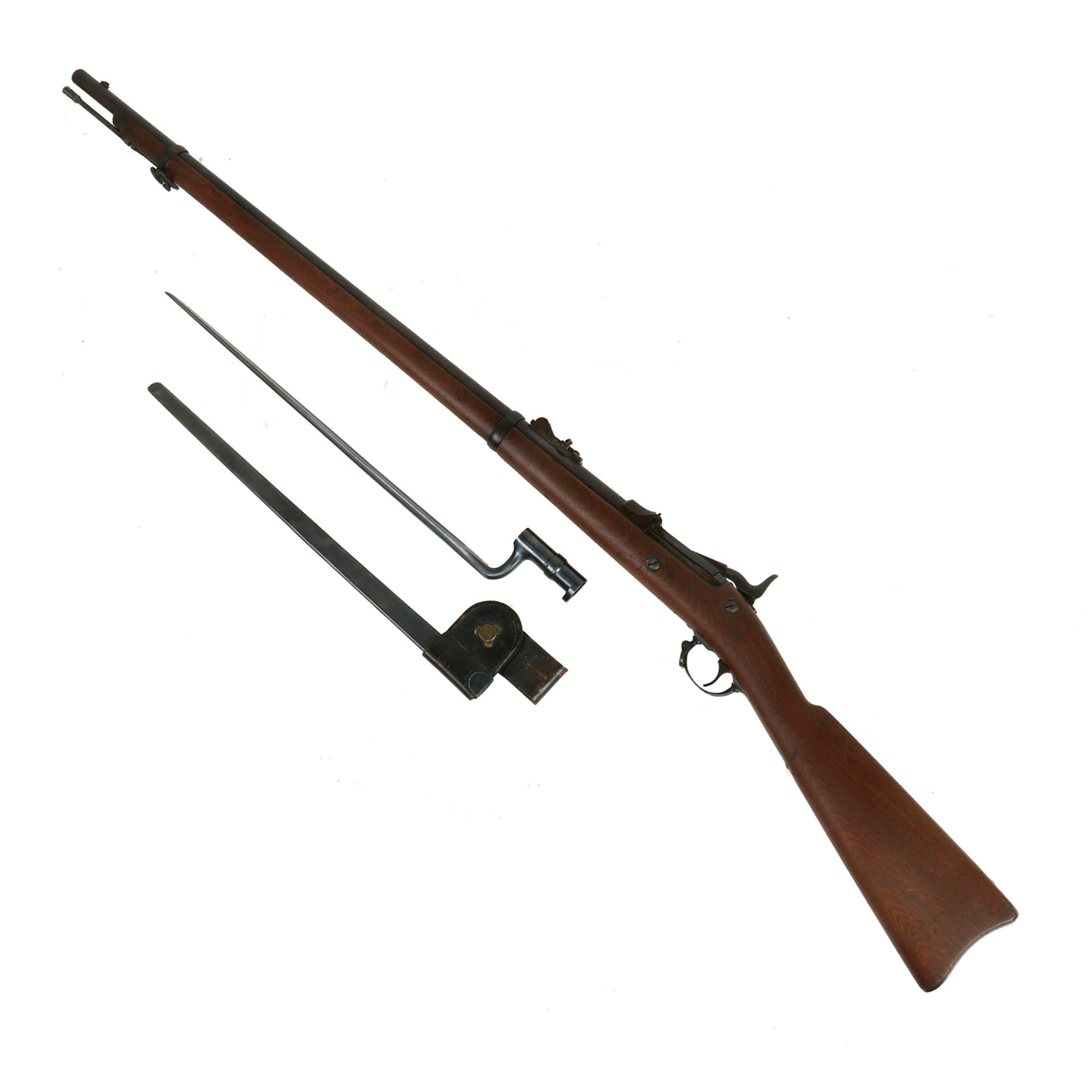 Original Item: Only One available. This is a lovely honest used example of the classic Springfield trapdoor rifle, complete with an original bayonet in a U.S. scabbard with a fully intact belt frog. This was the weapon used, in its carbine form, by the troopers of the 7th Cavalry that met their fate at the Battle of Little Big Horn in 1876. The breech block is marked: