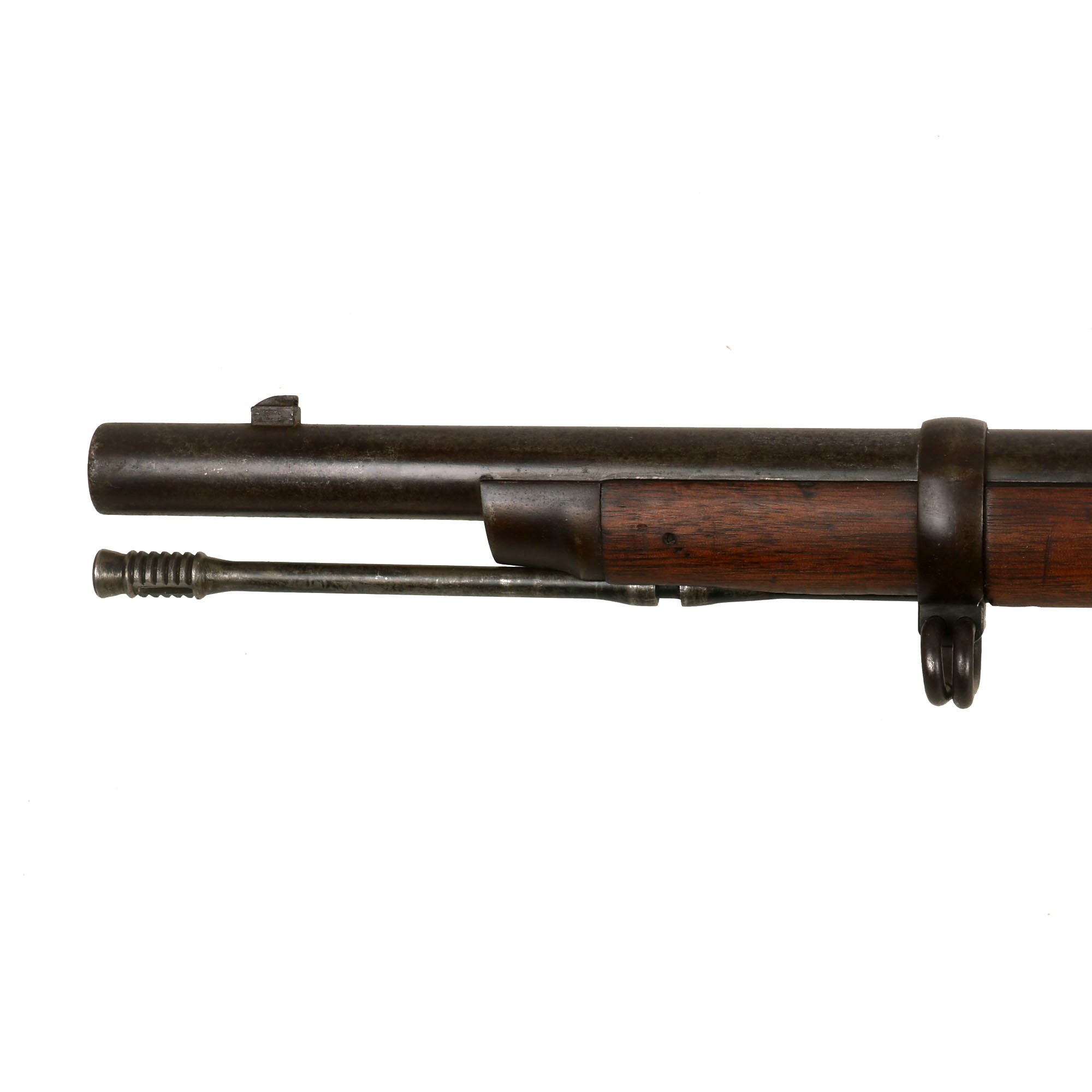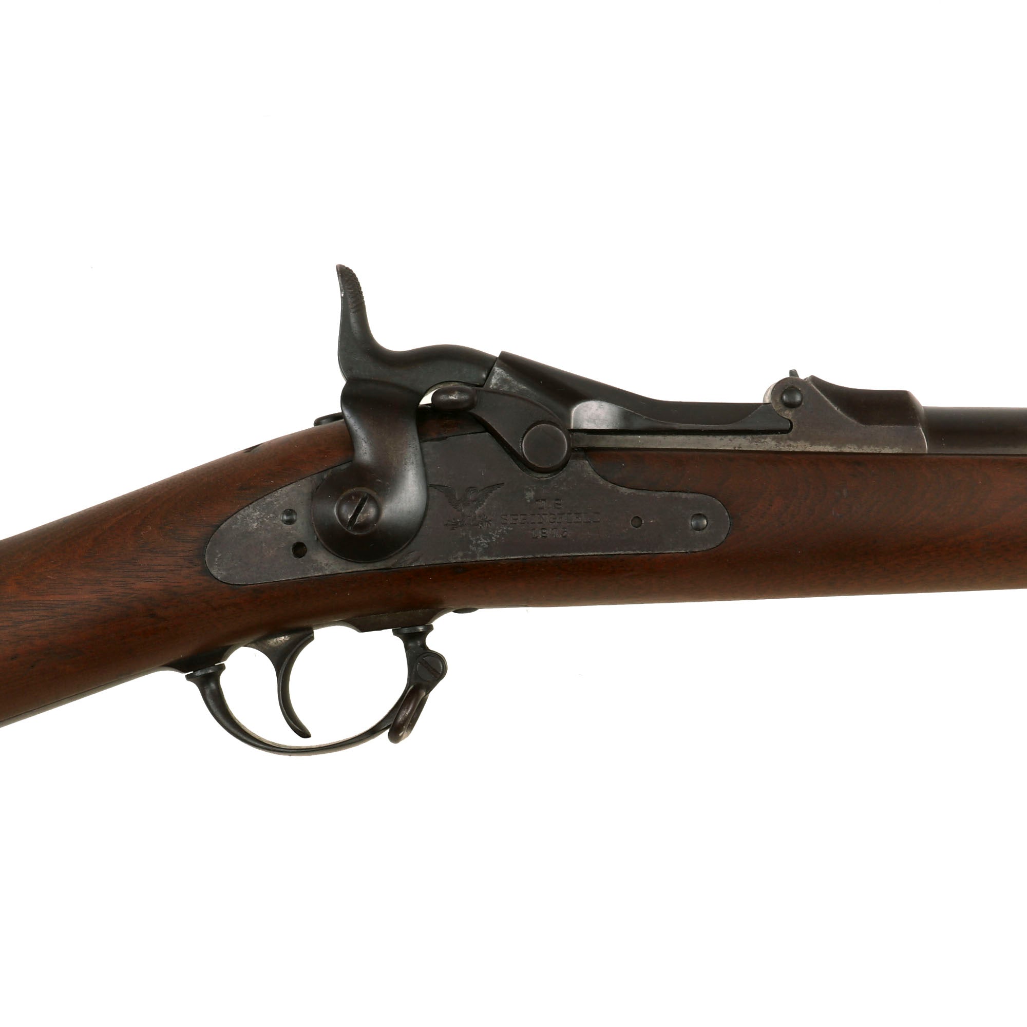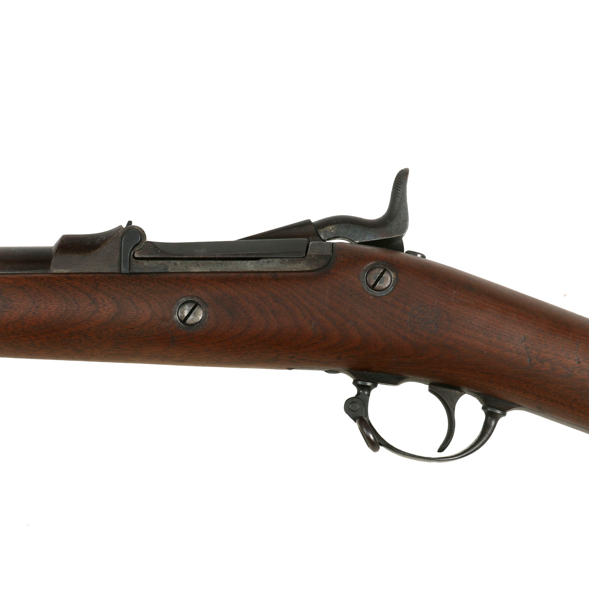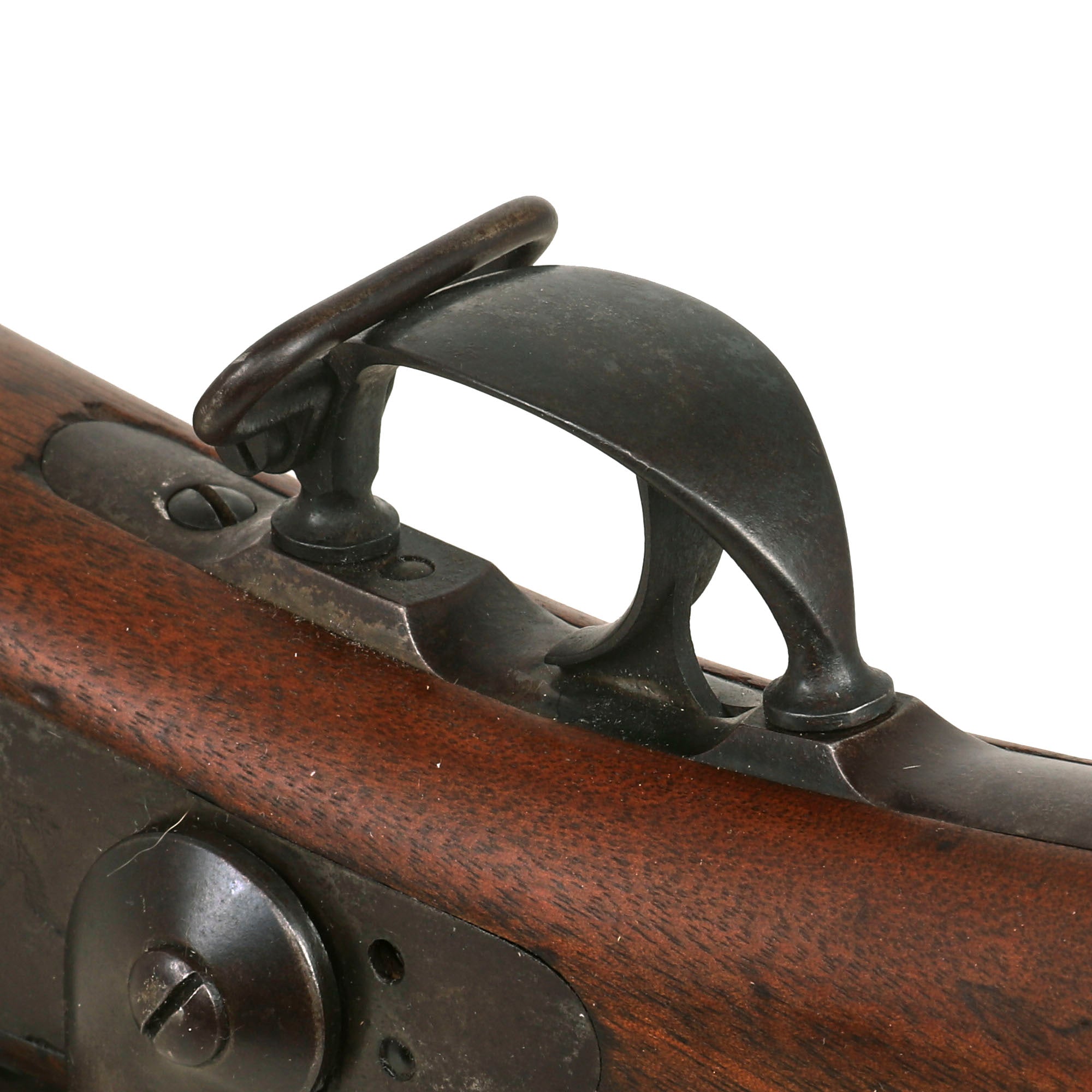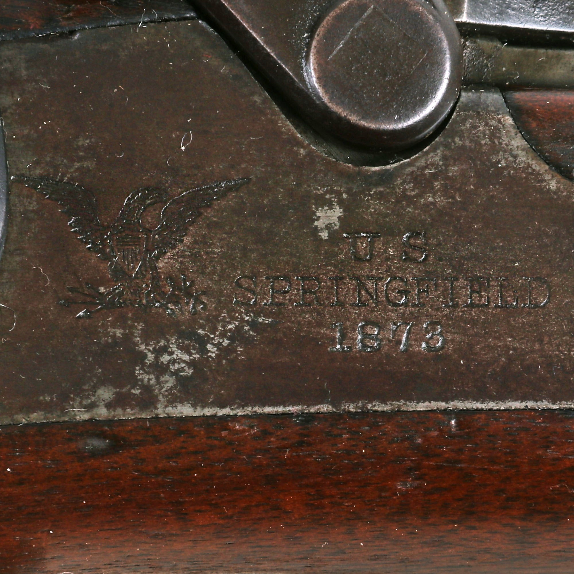 The butt plate is marked U.S. and both barrel bands are U marked. The metal finish is just lovely, showing the original bluing faded to a lovely worn plum patina. The receiver and breech block show a bit of the original case hardening, with the rest faded to a mottled patina. Center fire breechloader, .45 cal., two bands, two sling swivels with stacking swivel, standard model 1879 sliding sight, and standard ramrod. Lock is marked with a Federal Eagle and U.S. / SPRINGFIELD, indicating that it was manufactured at the United States Armory and Arsenal at Springfield, in Springfield, Massachusetts.