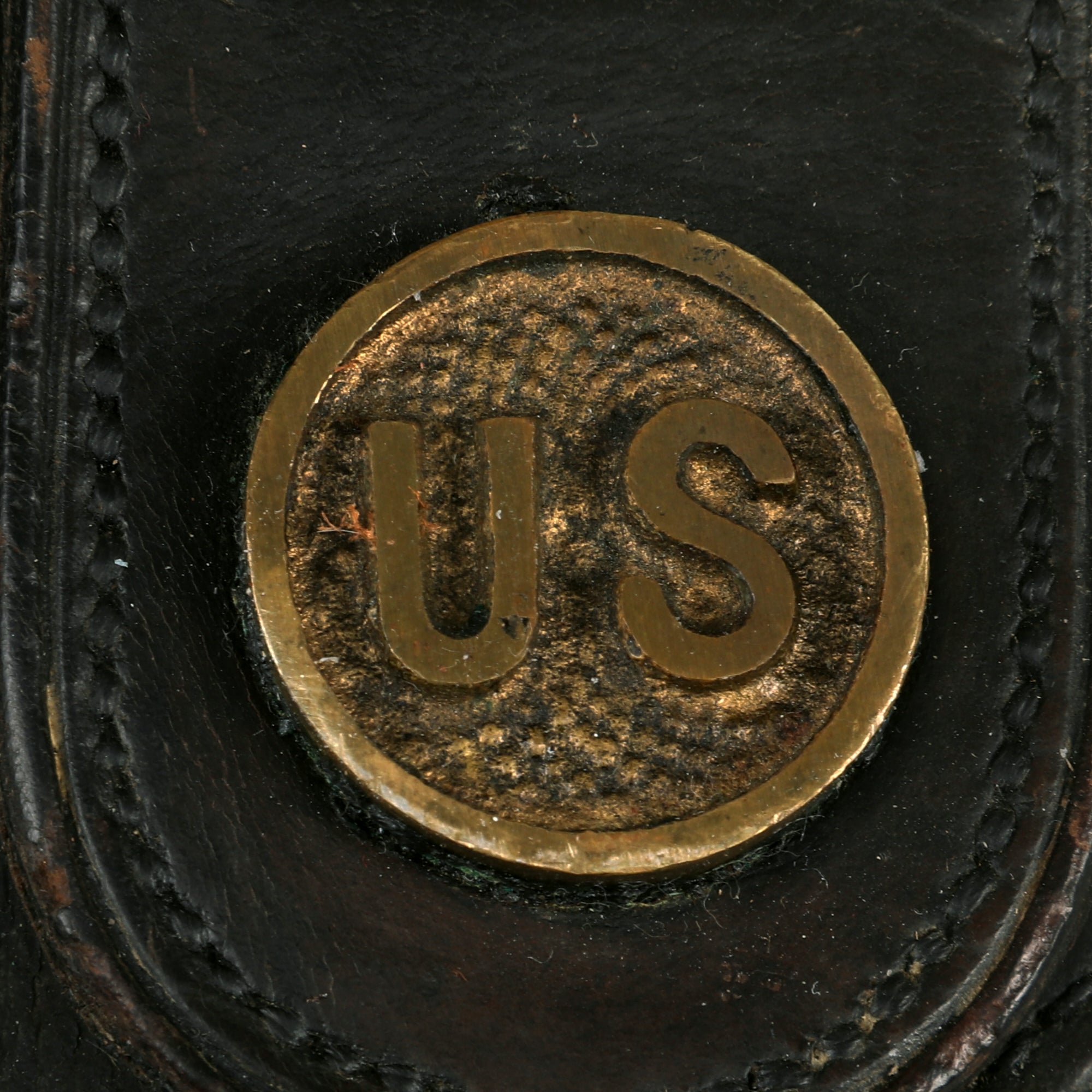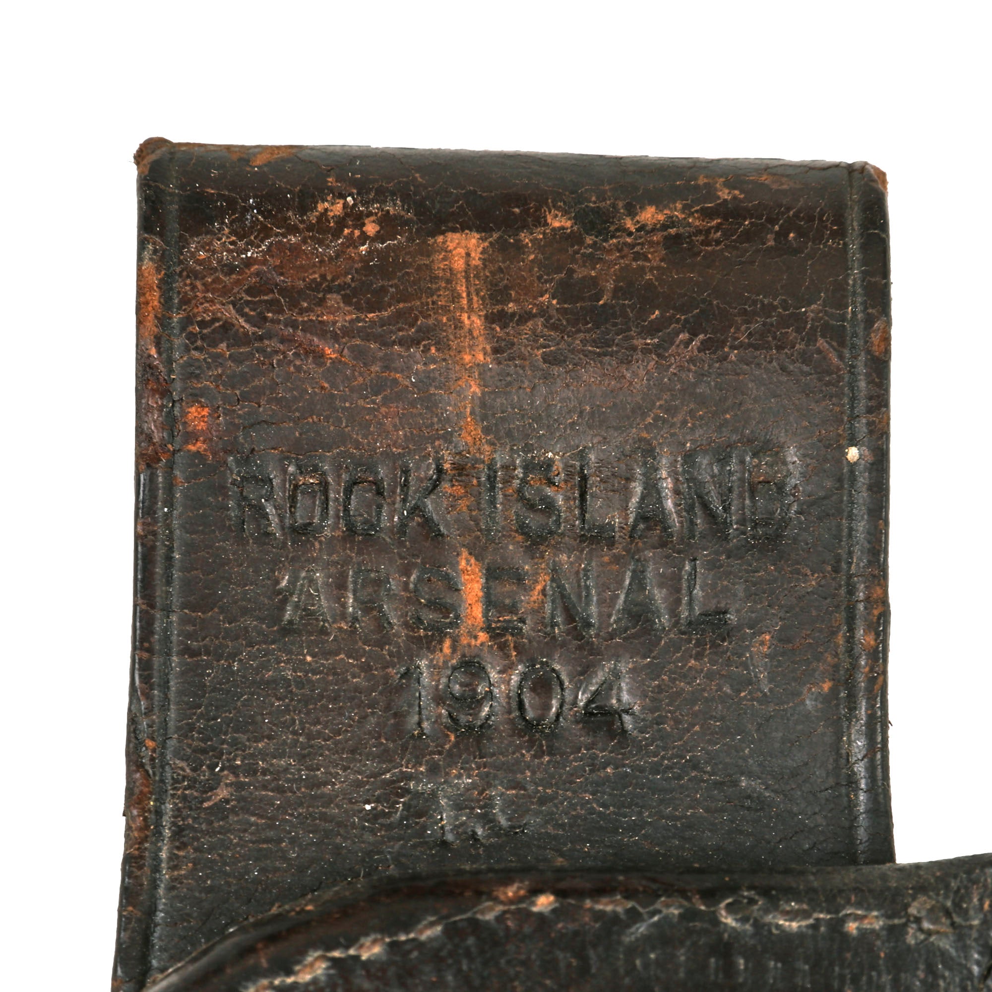 The included bayonet is the classic 1873 style triangular socket bayonet marked U.S., which is in excellent condition, with virtually all of the original finish retained. It comes in its original steel scabbard, also in excellent condition, which has a later pattern leather frog and swivel belt loop, with the rosette marked U.S.. It is marked on the back with ROCK ISLAND / ARSENAL / 1904, and overall the leather is in great shape. The metal portion of the scabbard shows the original blued finish well, with just a bit of light oxidation.