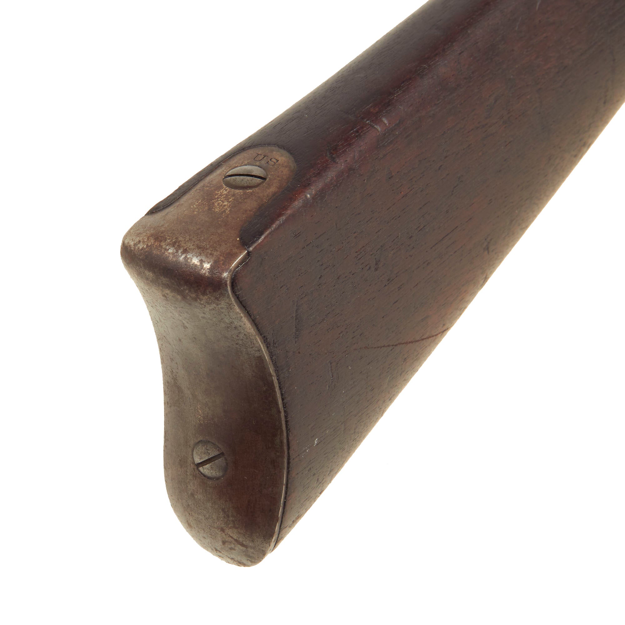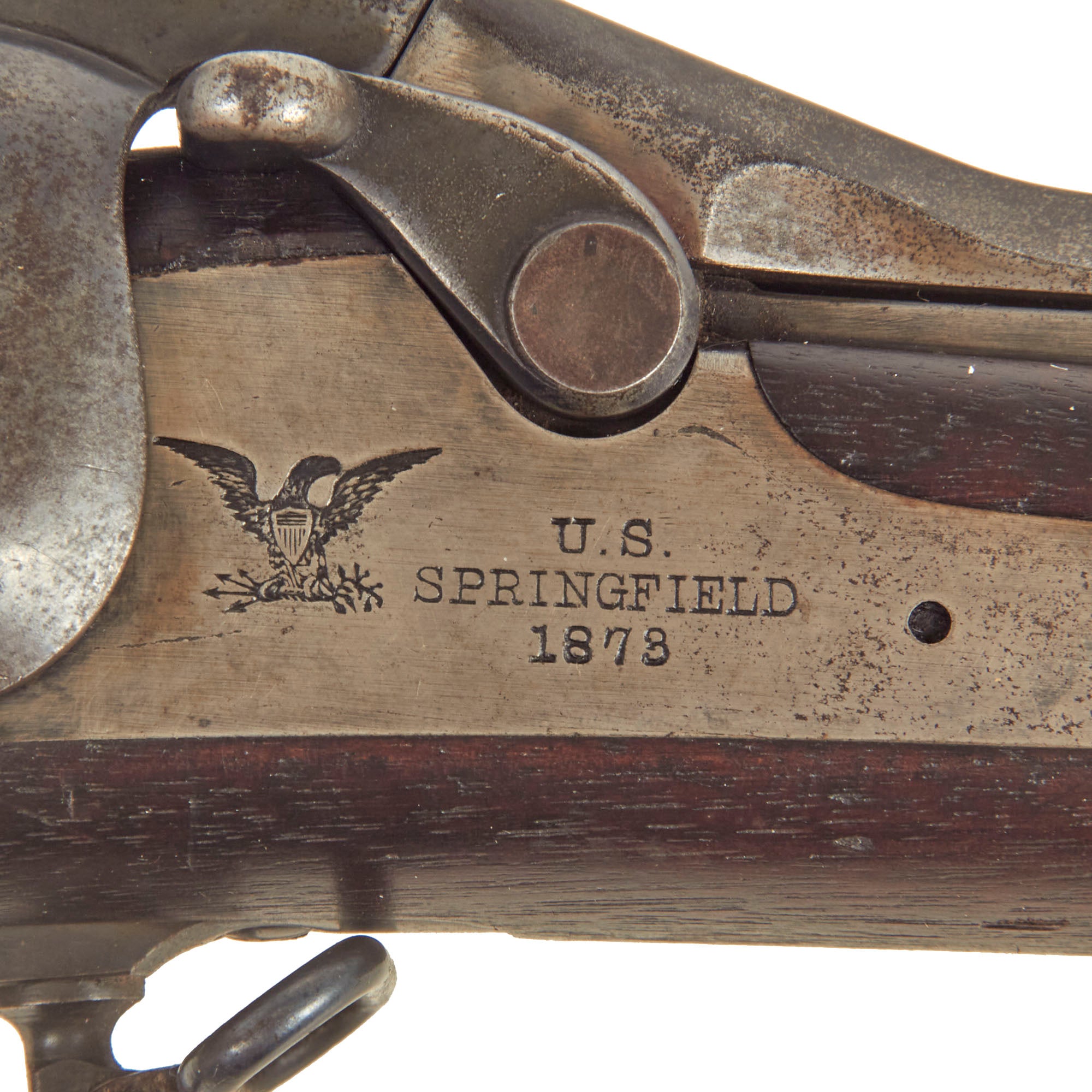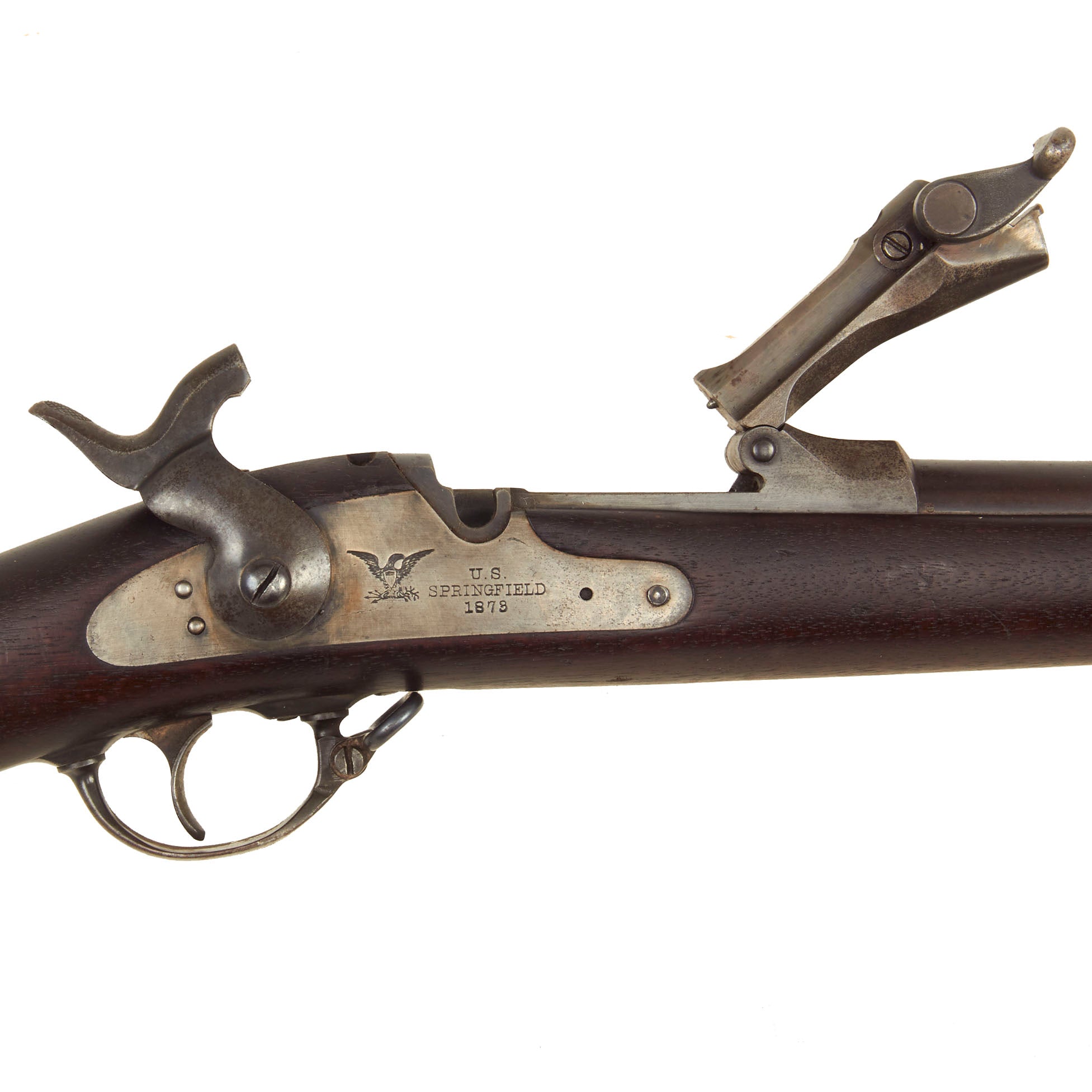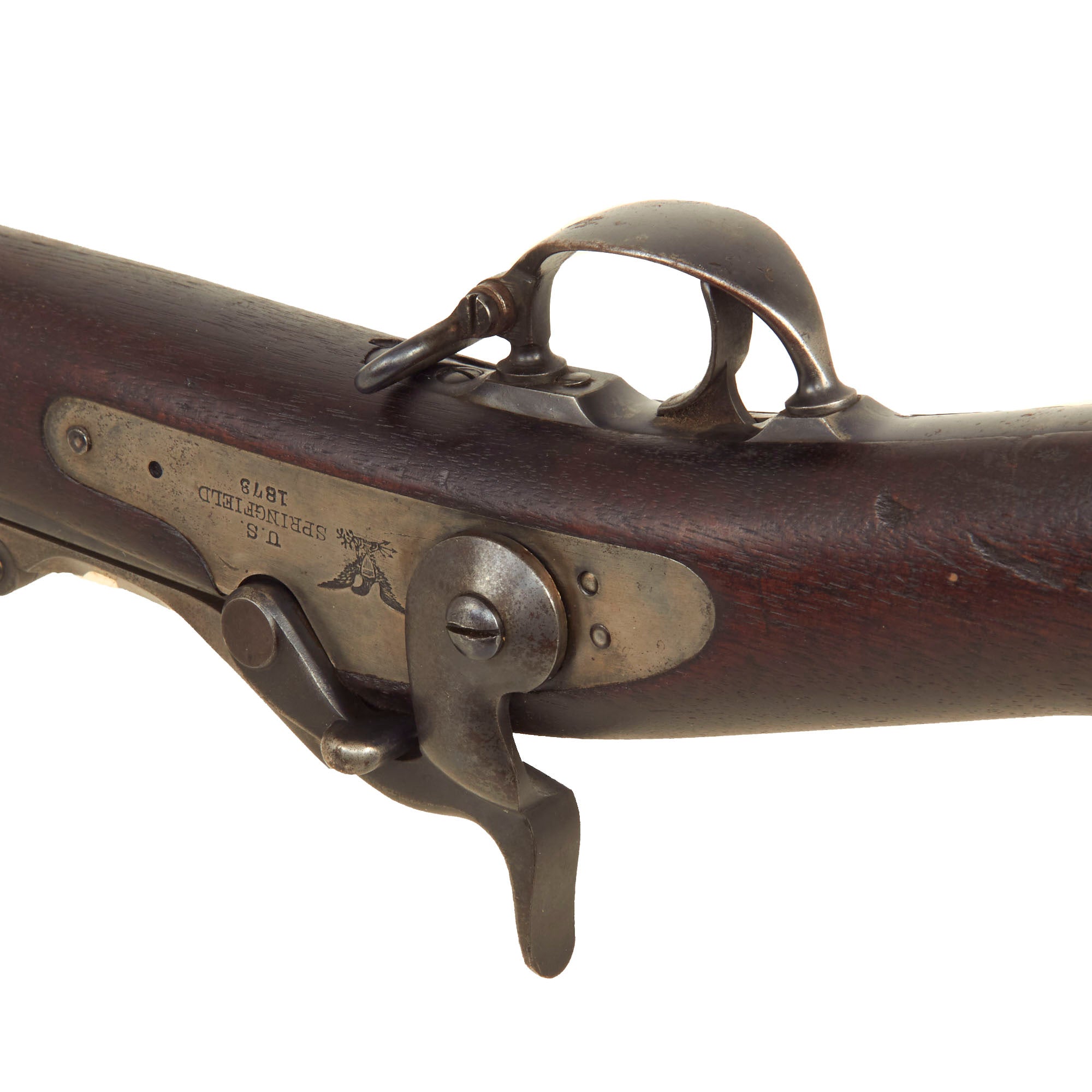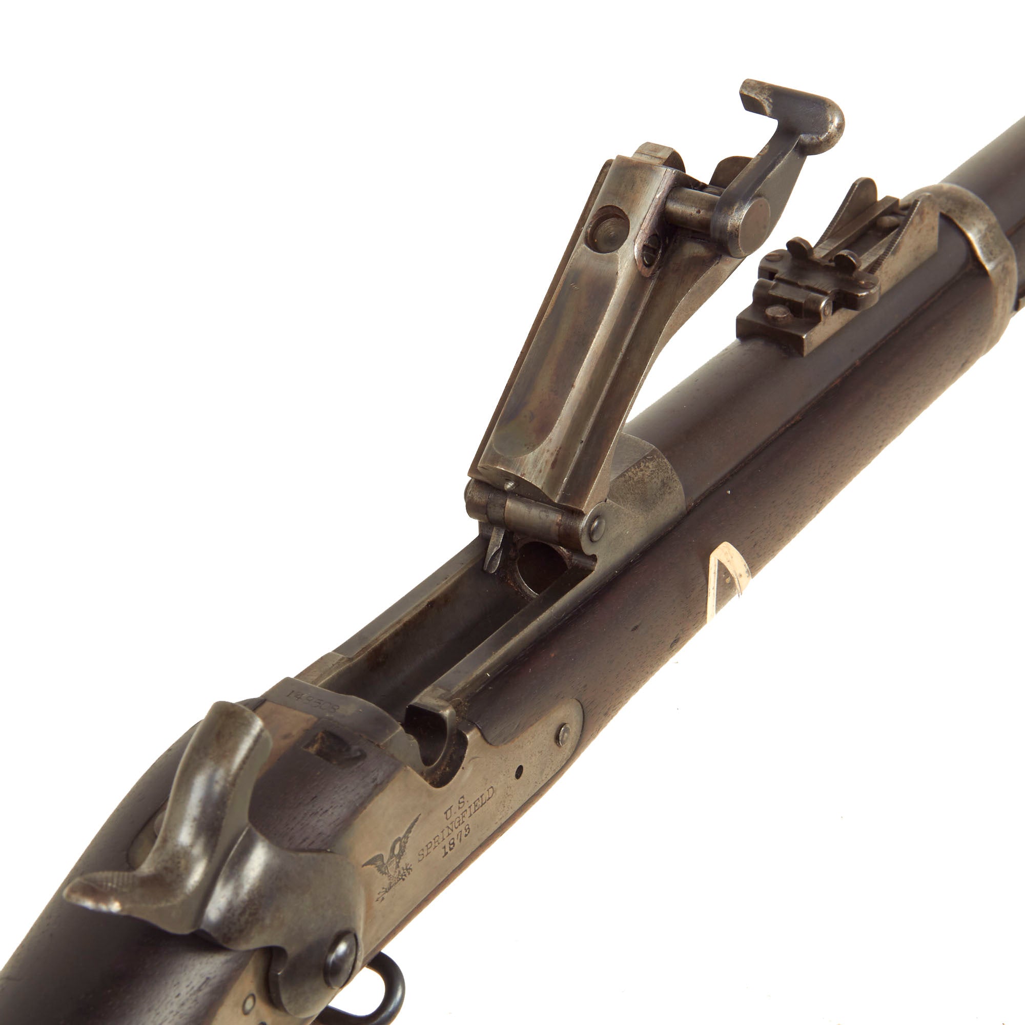 The butt plate is marked U.S. and both barrel bands are U marked. The overall metal finish still shows some of the original bluing, with the balance mostly showing a dark gray oxidized patina. Center fire breechloader, .45 cal., two bands, two sling swivels with stacking swivel, standard model 1879 sliding sight, and an early model 1873 "Enfield Style" ramrod. Lock is marked with a Federal Eagle and U.S. / SPRINGFIELD / 1873, indicating that it was manufactured at the United States Armory and Arsenal at Springfield, in Springfield, Massachusetts. This is an early pattern lock plate, but it has the correct three notch tumbler, and was most likely fit onto this rifle as an arsenal replacement along with the cleaning rod.