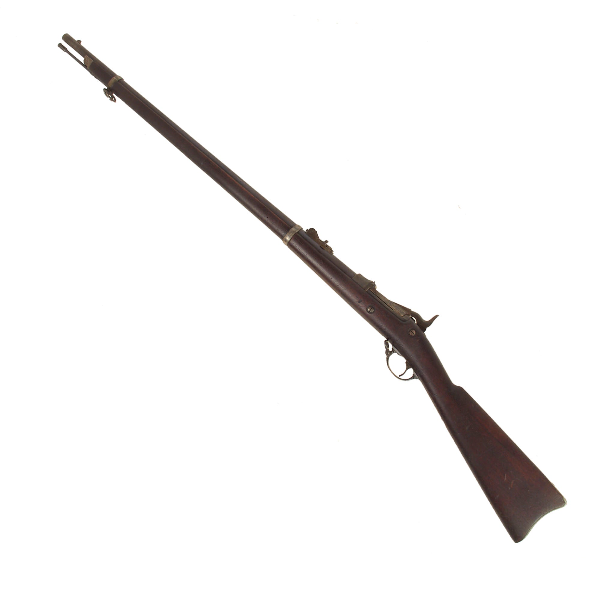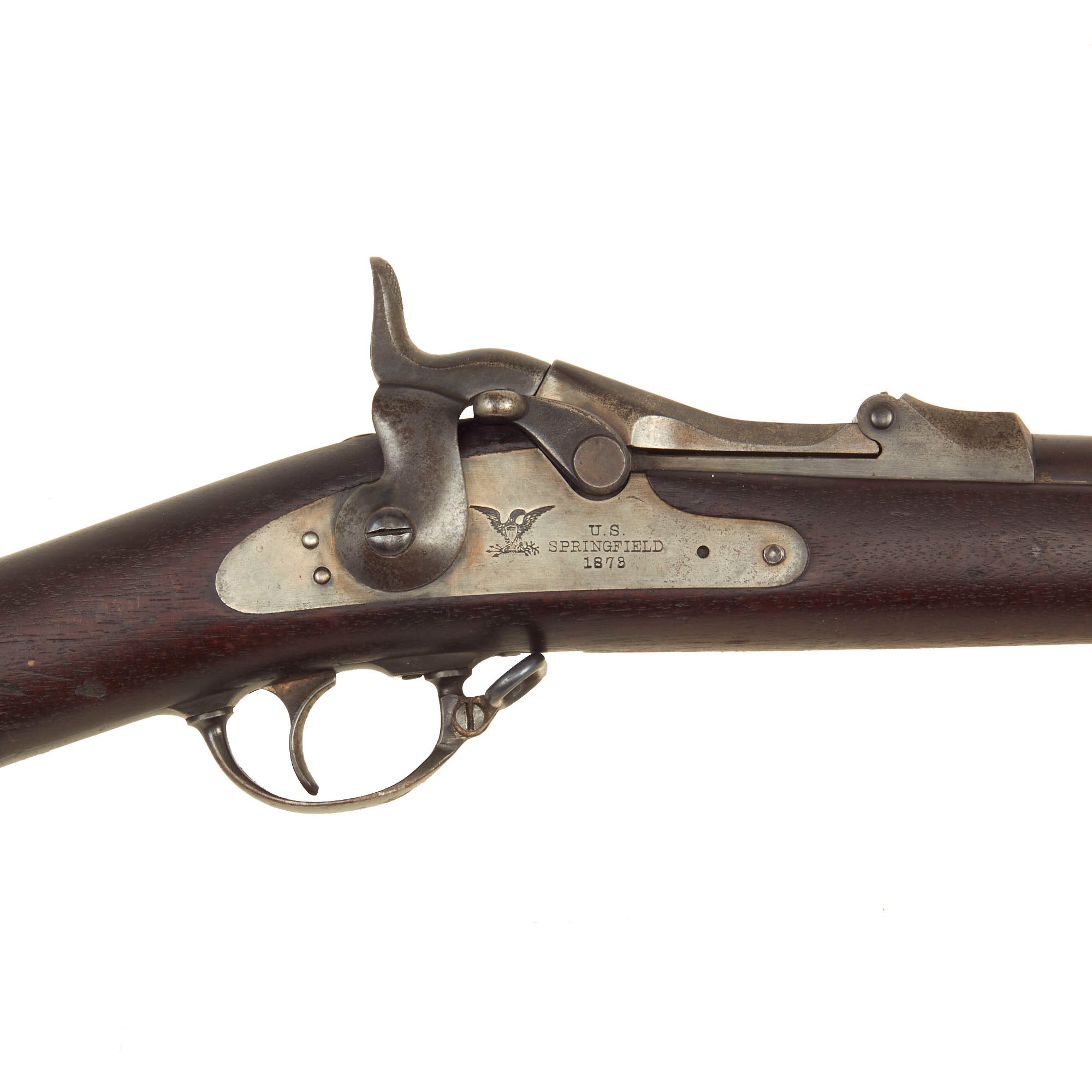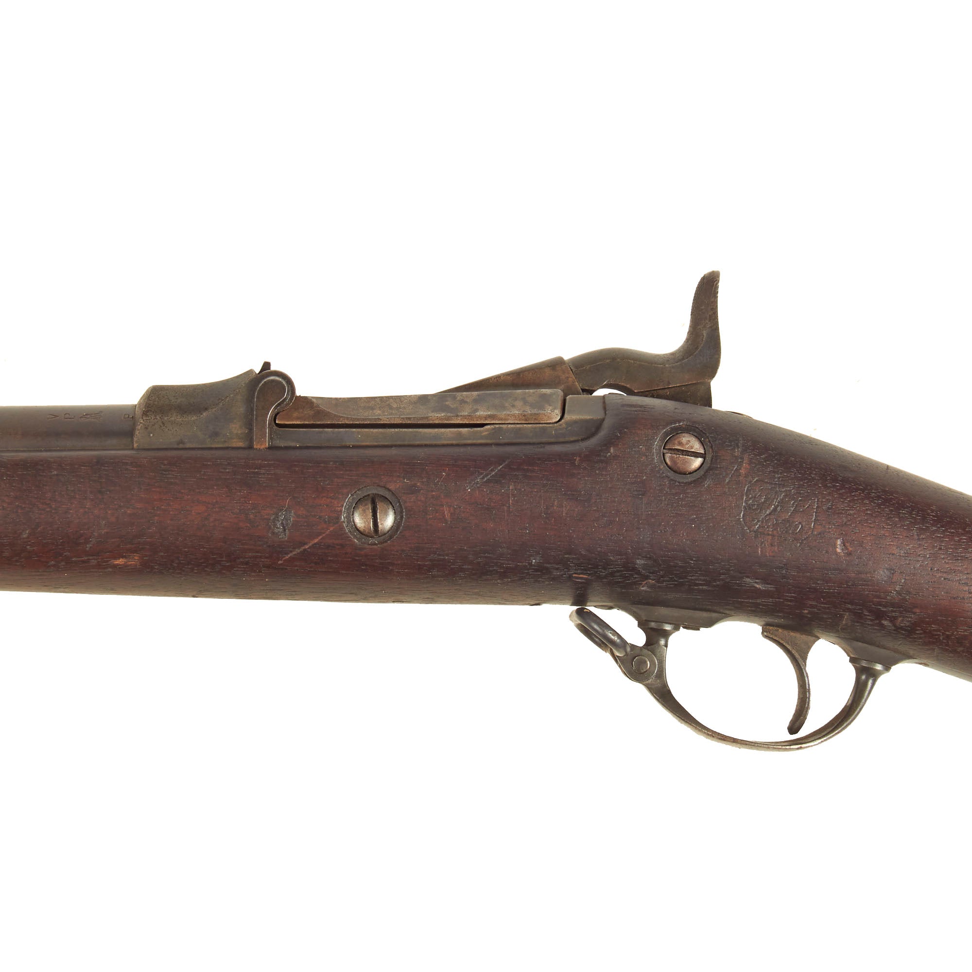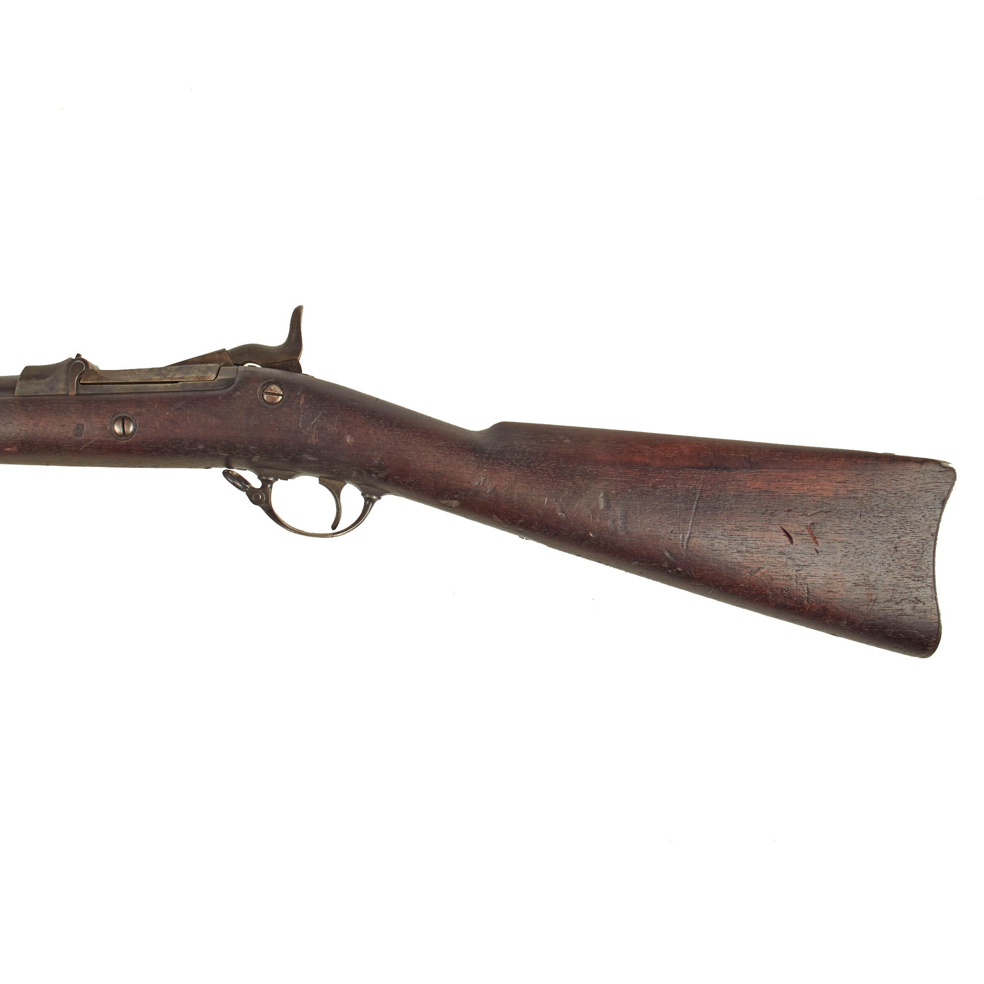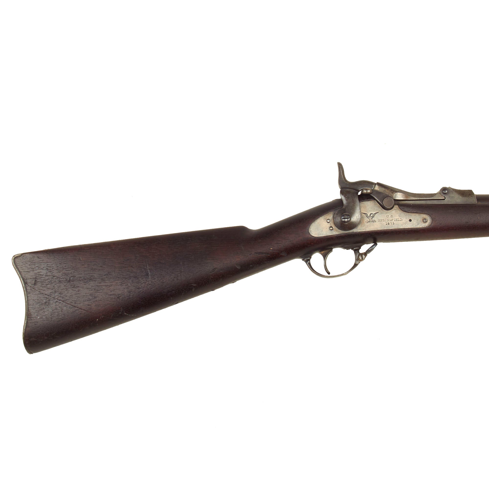 The butt plate is marked U.S. and both barrel bands are U marked. The overall metal finish still shows some of the original bluing, with the balance mostly showing a dark gray oxidized patina. Center fire breechloader, .45 cal., two bands, two sling swivels with stacking swivel, standard model 1879 sliding sight, and an early model 1873 "Enfield Style" ramrod. Lock is marked with a Federal Eagle and U.S. / SPRINGFIELD / 1873, indicating that it was manufactured at the United States Armory and Arsenal at Springfield, in Springfield, Massachusetts. This is an early pattern lock plate, but it has the correct three notch tumbler, and was most likely fit onto this rifle as an arsenal replacement along with the cleaning rod.