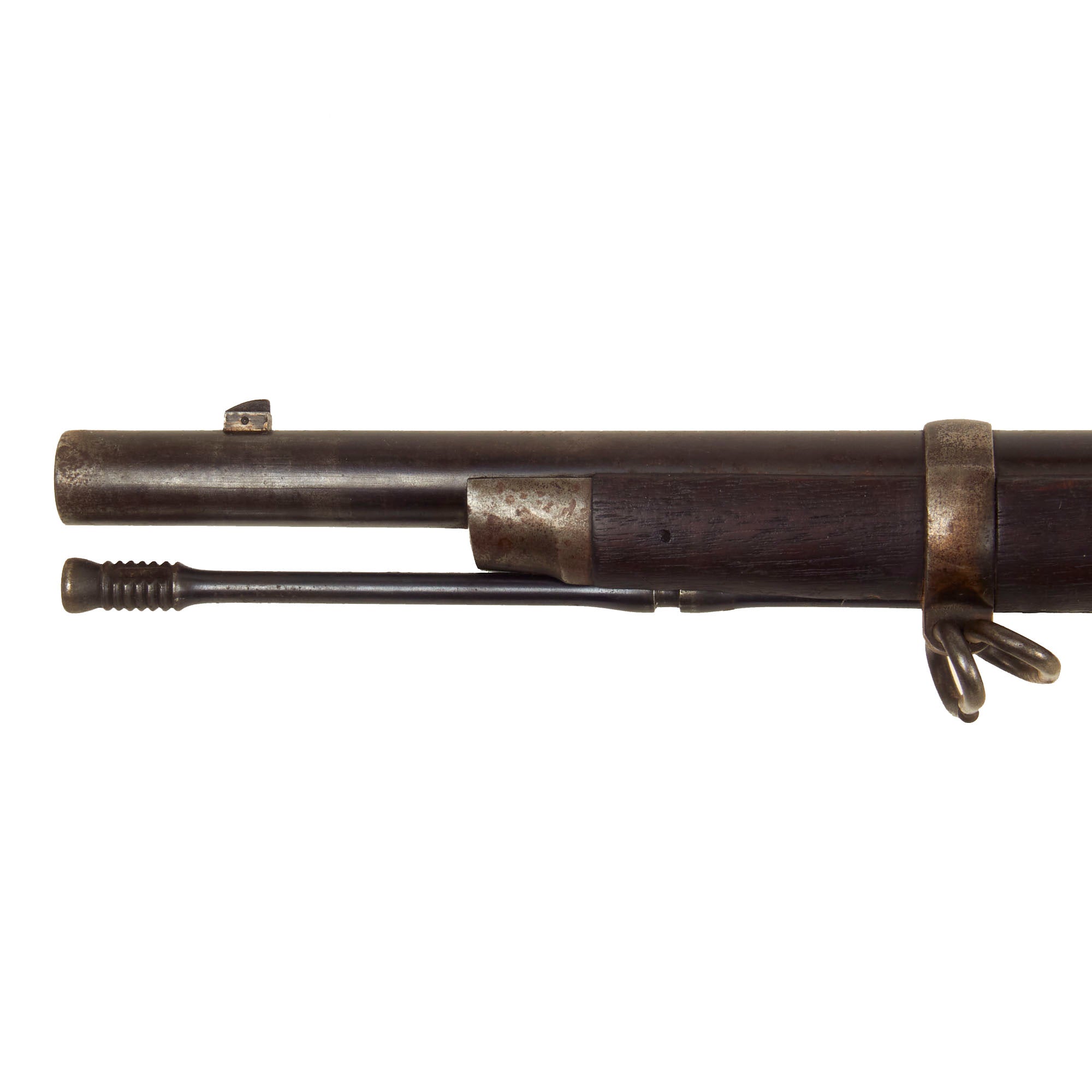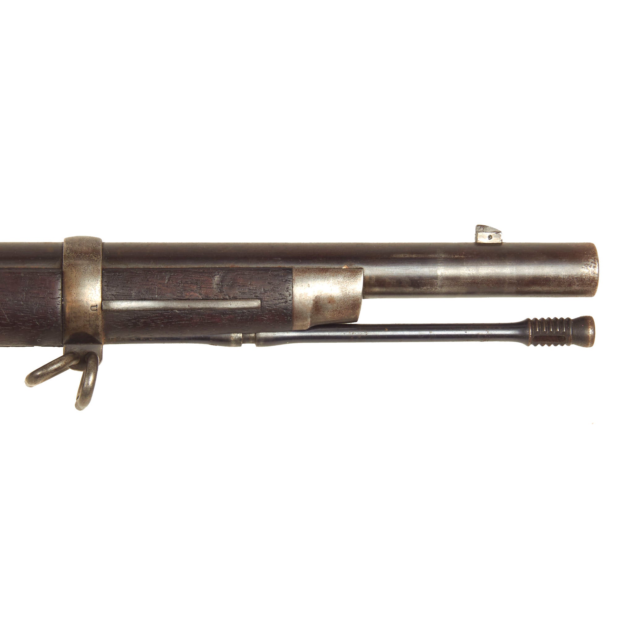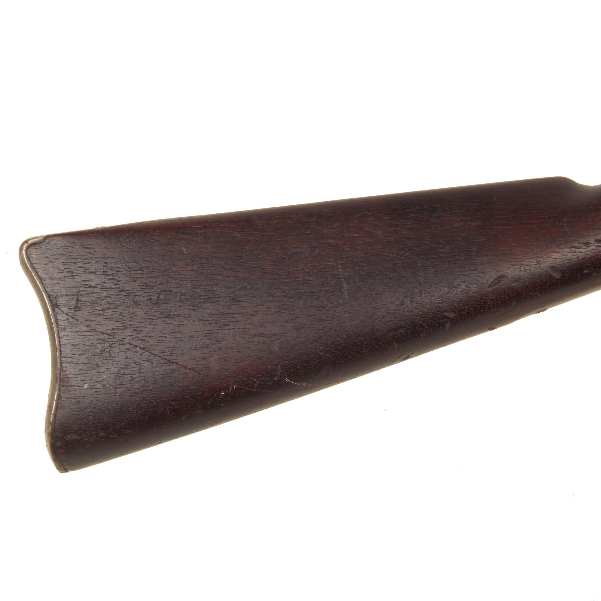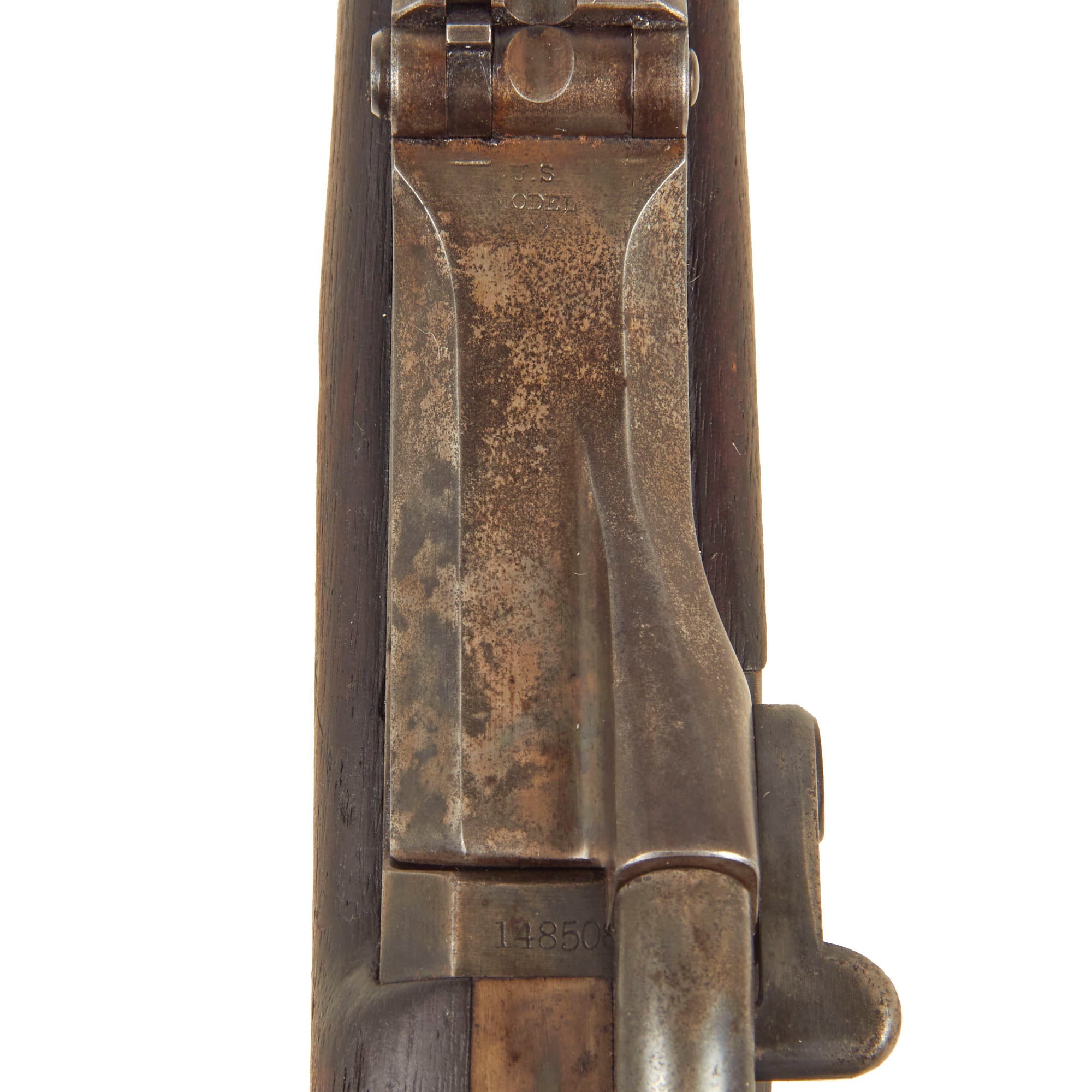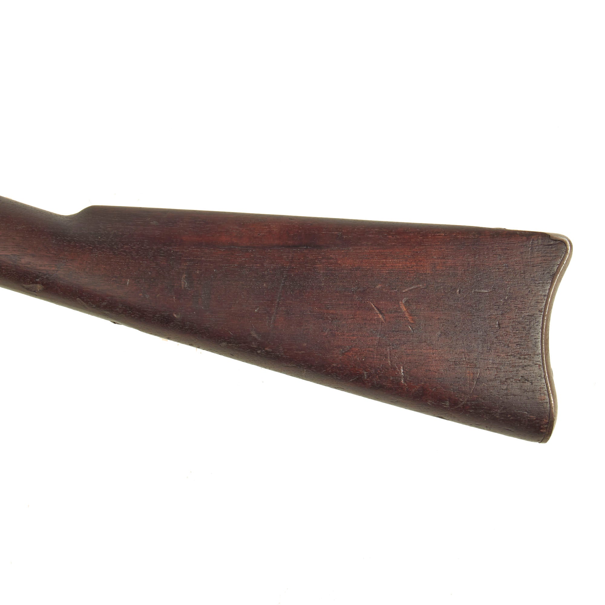 The butt plate is marked U.S. and both barrel bands are U marked. The overall metal finish still shows some of the original bluing, with the balance mostly showing a dark gray oxidized patina. Center fire breechloader, .45 cal., two bands, two sling swivels with stacking swivel, standard model 1879 sliding sight, and an early model 1873 "Enfield Style" ramrod. Lock is marked with a Federal Eagle and U.S. / SPRINGFIELD / 1873, indicating that it was manufactured at the United States Armory and Arsenal at Springfield, in Springfield, Massachusetts. This is an early pattern lock plate, but it has the correct three notch tumbler, and was most likely fit onto this rifle as an arsenal replacement along with the cleaning rod.