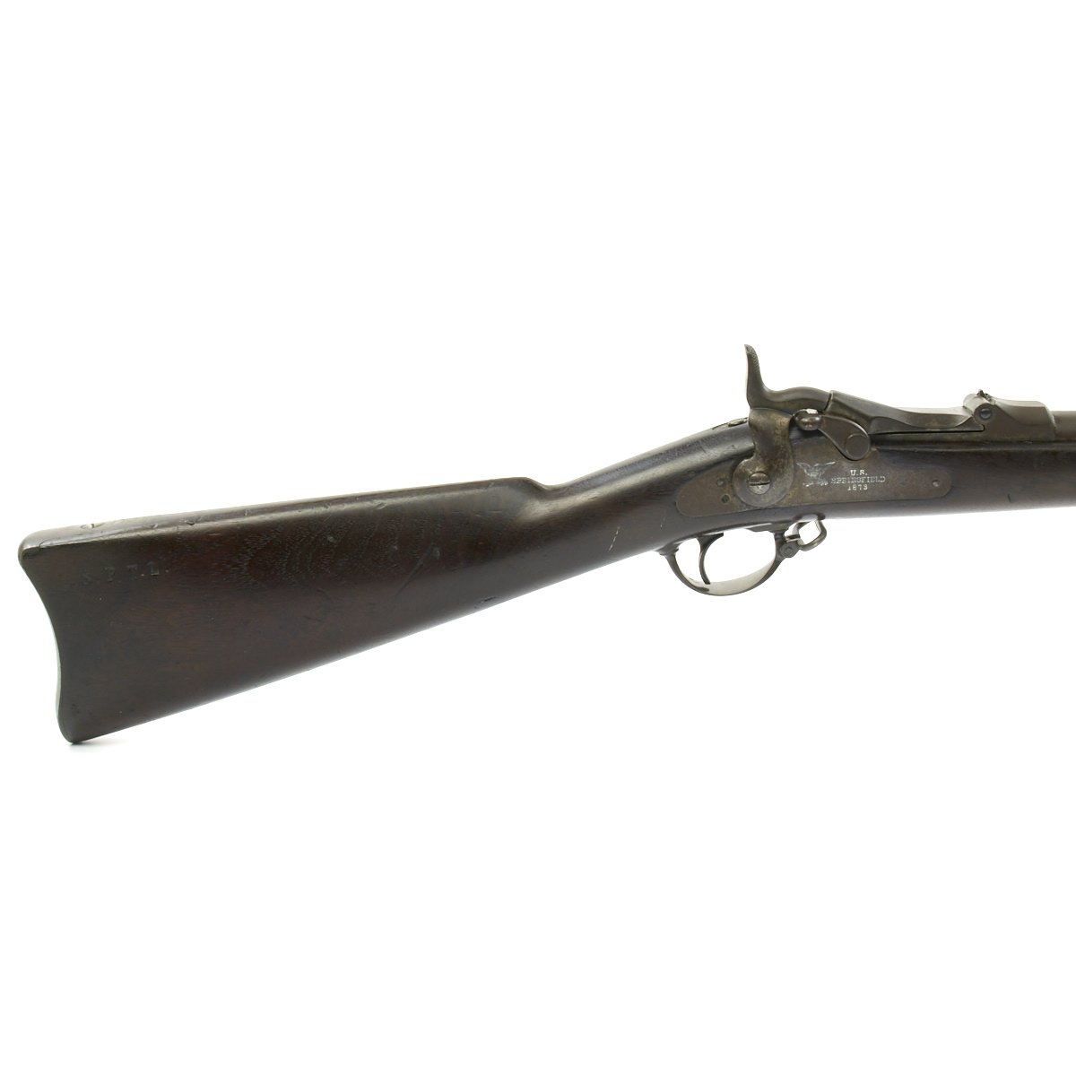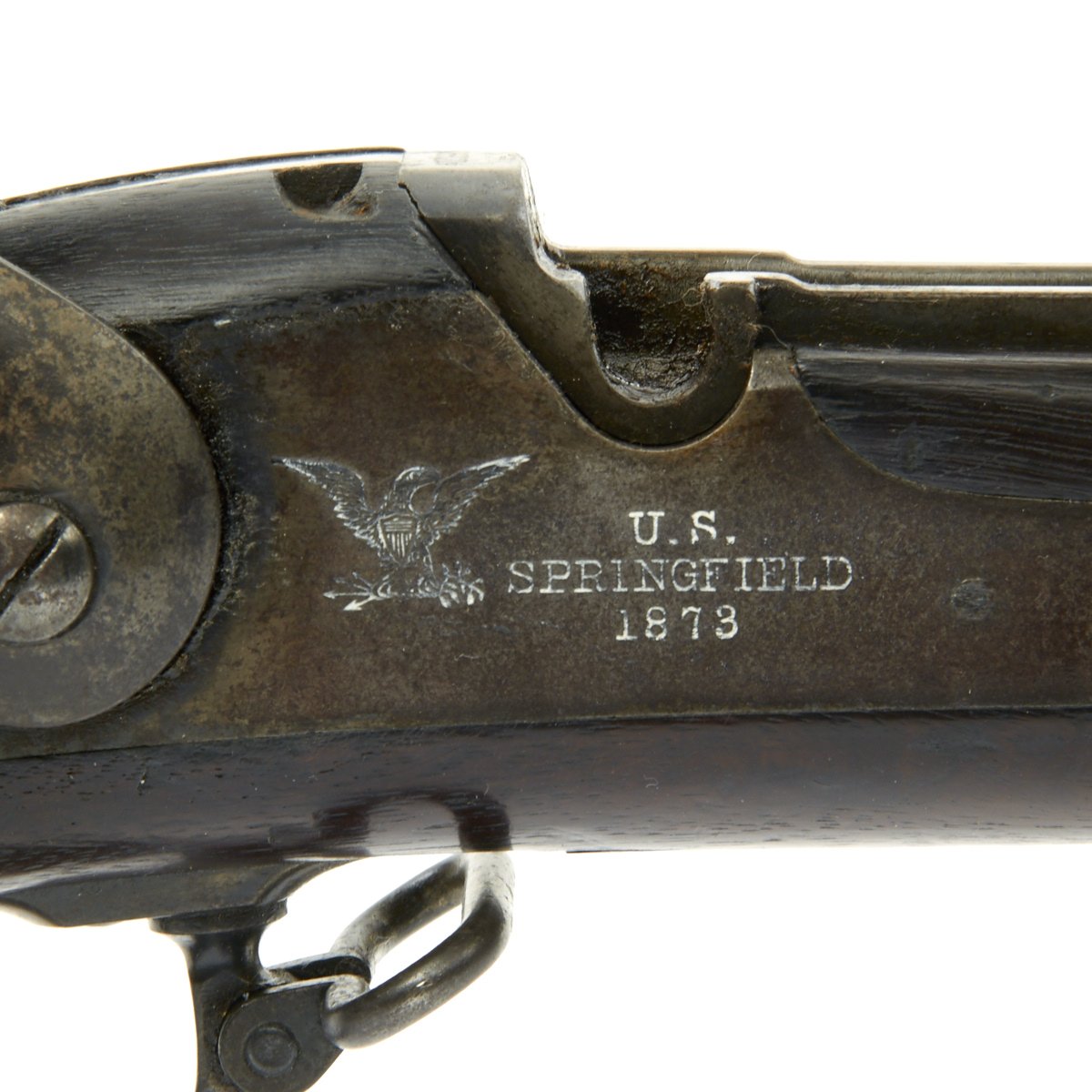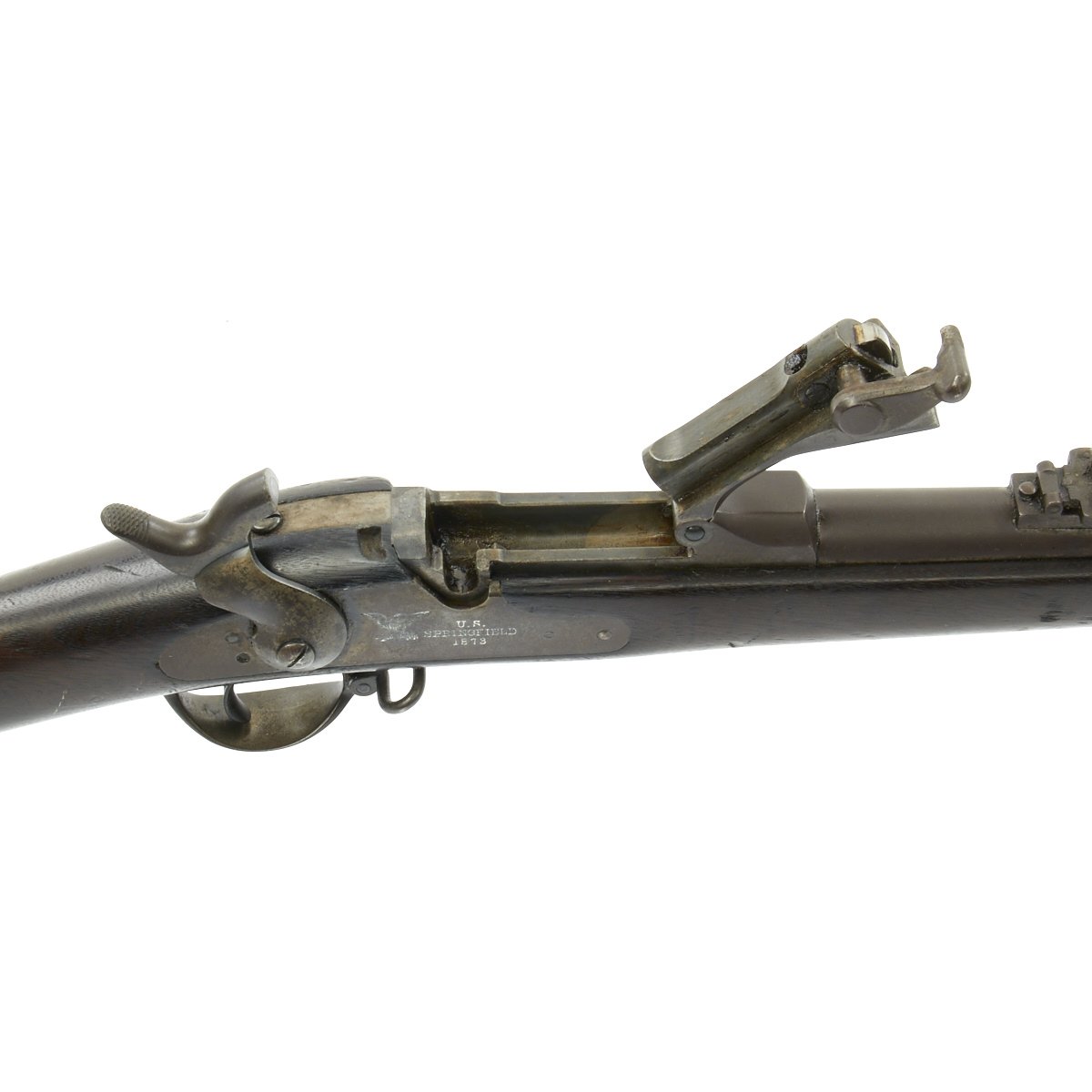 The bore is in very good condition, with a bright finish and crisp lands and grooves, and some light oxidation in places. Probably a 9 out of 10. The butt plate is marked U.S. and both barrel bands are U marked. Metal finish is a nice lightly worn gray color, with a bit of peppering in places. Center fire breechloader, .45 cal., two bands, two sling swivels with stacking swivel, standard sliding sight, and standard ramrod. Lock is marked with an eagle and U.S. / SPRINGFIELD / 1873, manufactured by Springfield Armory, Springfield Massachusetts.
