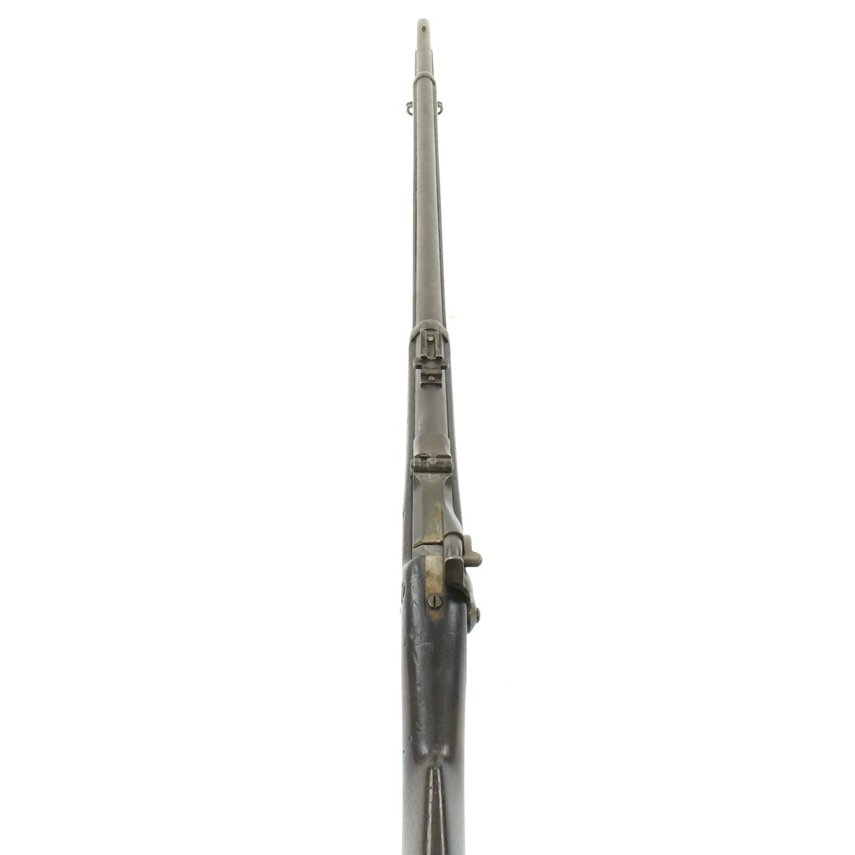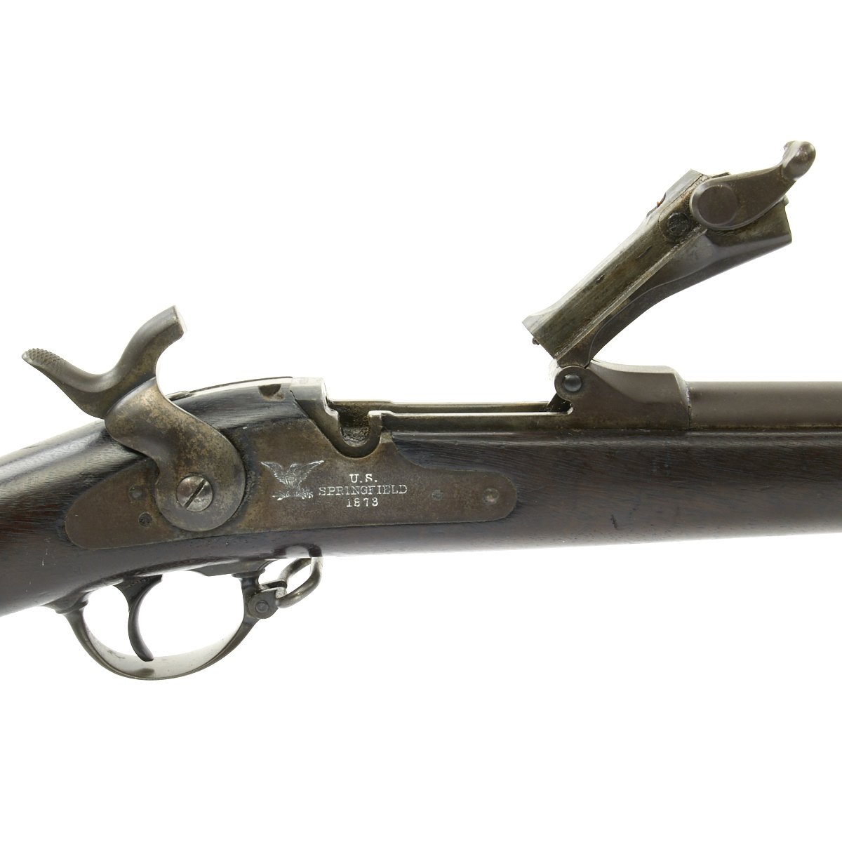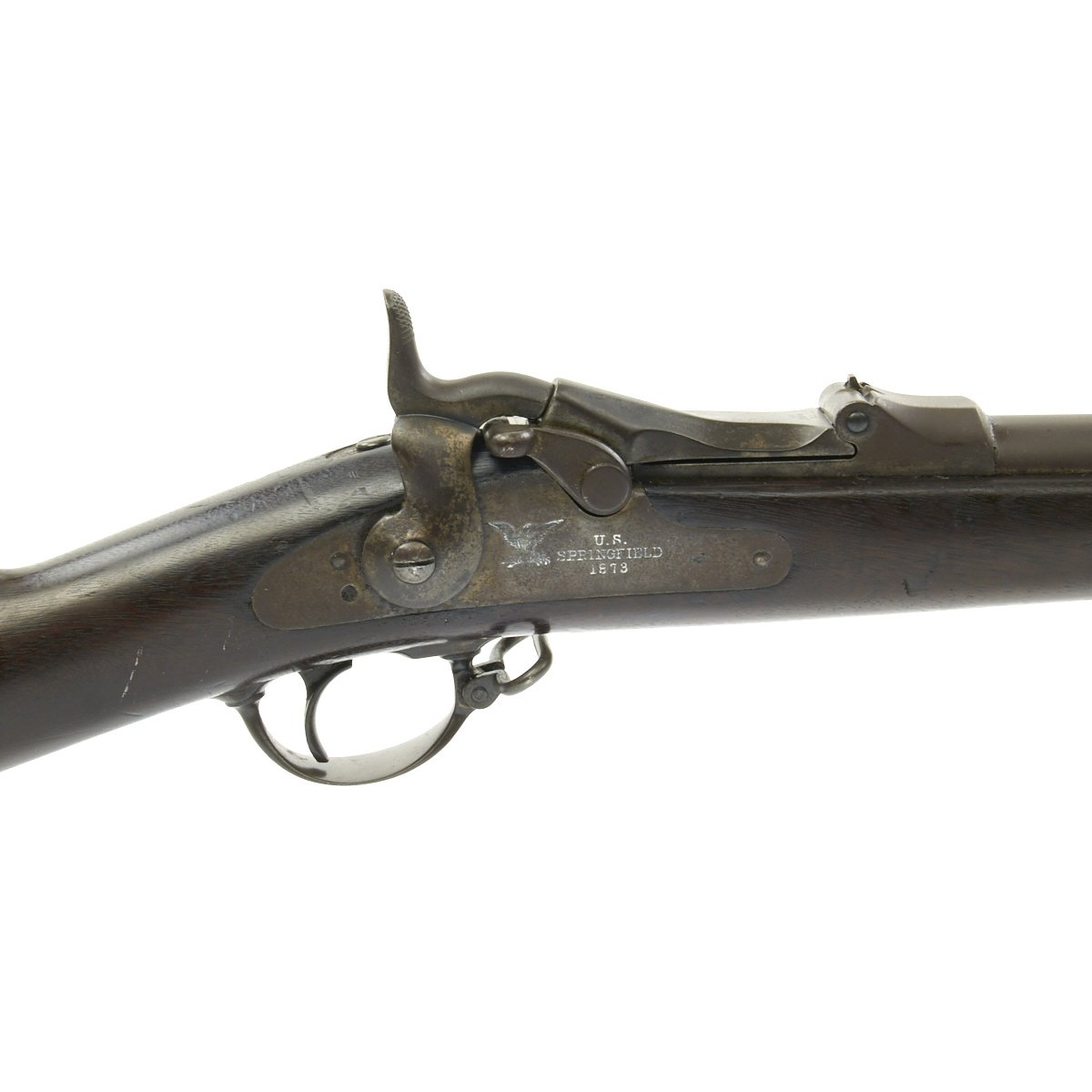 The bore is in very good condition, with a bright finish and crisp lands and grooves, and some light oxidation in places. Probably a 9 out of 10. The butt plate is marked U.S. and both barrel bands are U marked. Metal finish is a nice lightly worn gray color, with a bit of peppering in places. Center fire breechloader, .45 cal., two bands, two sling swivels with stacking swivel, standard sliding sight, and standard ramrod. Lock is marked with an eagle and U.S. / SPRINGFIELD / 1873, manufactured by Springfield Armory, Springfield Massachusetts.