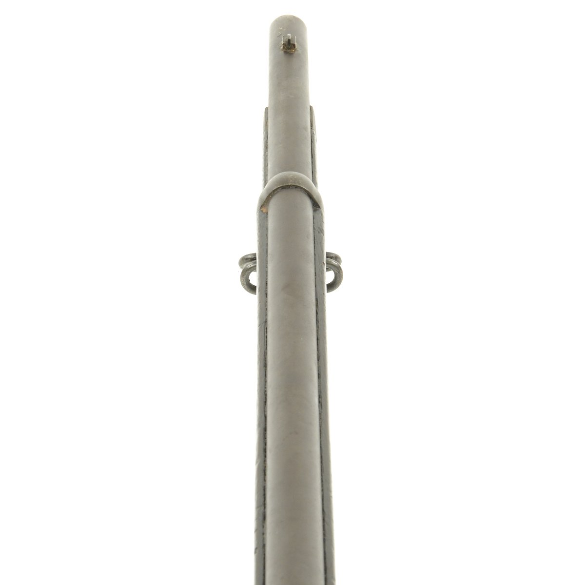 The elegant script SWP belongs to Samuel W. Porter, who was the Master Armorer and Chief Inspector of Springfield Armory from 15 September 1879 to 18 June 1894. A stylized P in a circle under the wrist of the stock indicates that the rifle passed all of its overpressure proof testing. Additional marks of interest include inspectors' and proof marks around the breech end of the barrel: a V over a P over an eagle's head over another P on the left side just above the stock. The upper right corner of the standard sliding sight leaf and the left side of the ramp are marked R to indicate that the sight graduations are for a rifle and not a carbine.
