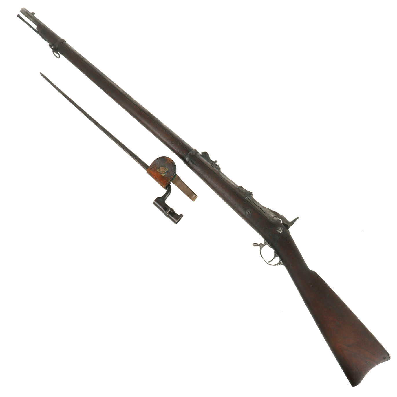 Original Item: Only One available. This is a lovely honest used example of the classic Springfield trapdoor rifle, complete with an original bayonet and 2nd pattern U.S. scabbard with a brass hook frog. This was the weapon used, in its carbine form, by the troopers of the 7th Cavalry that met their fate at the Battle of Little Big Horn in 1876. The breech block is marked:
