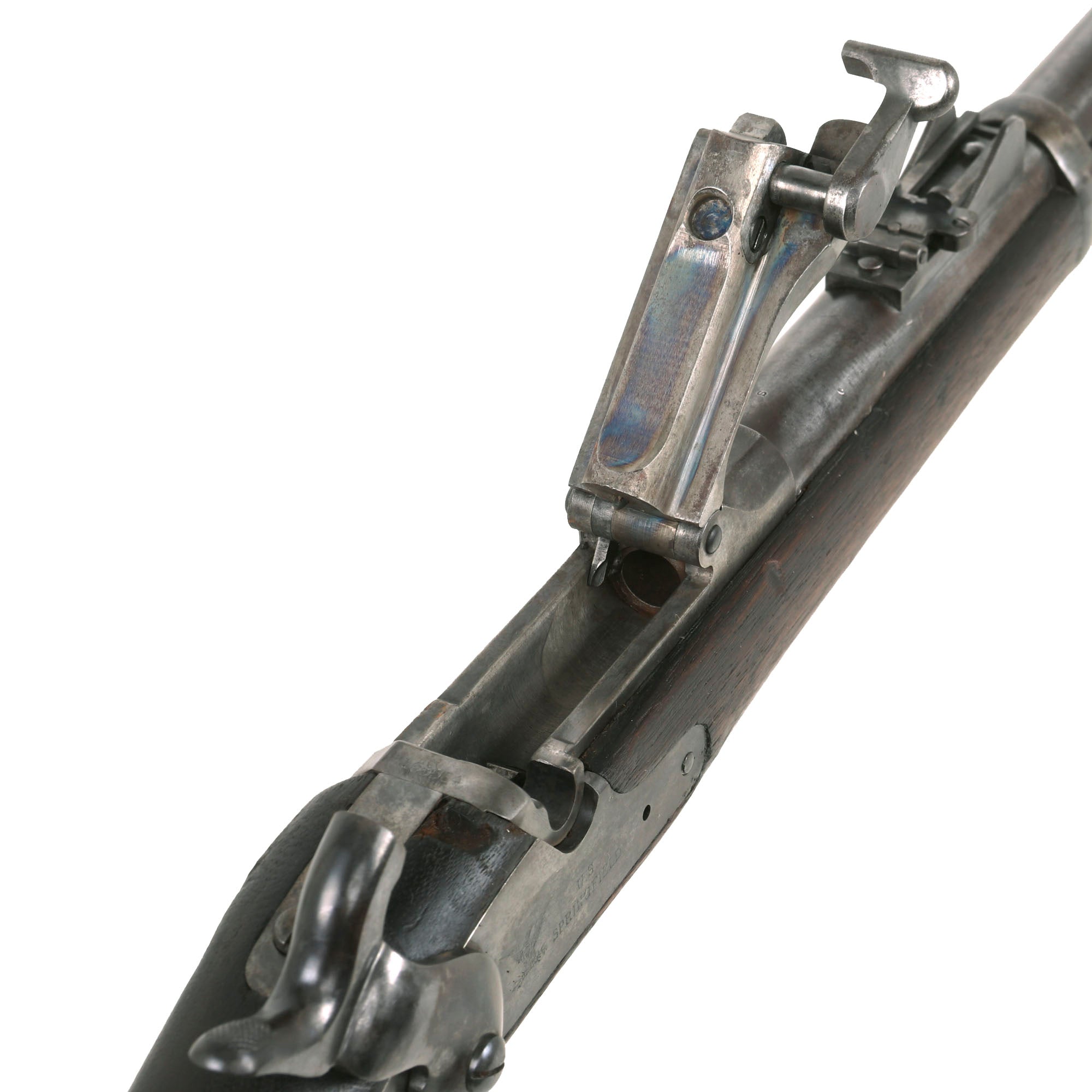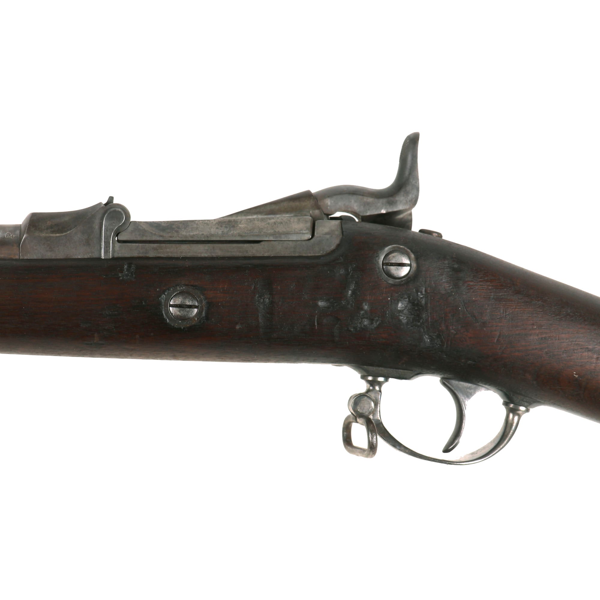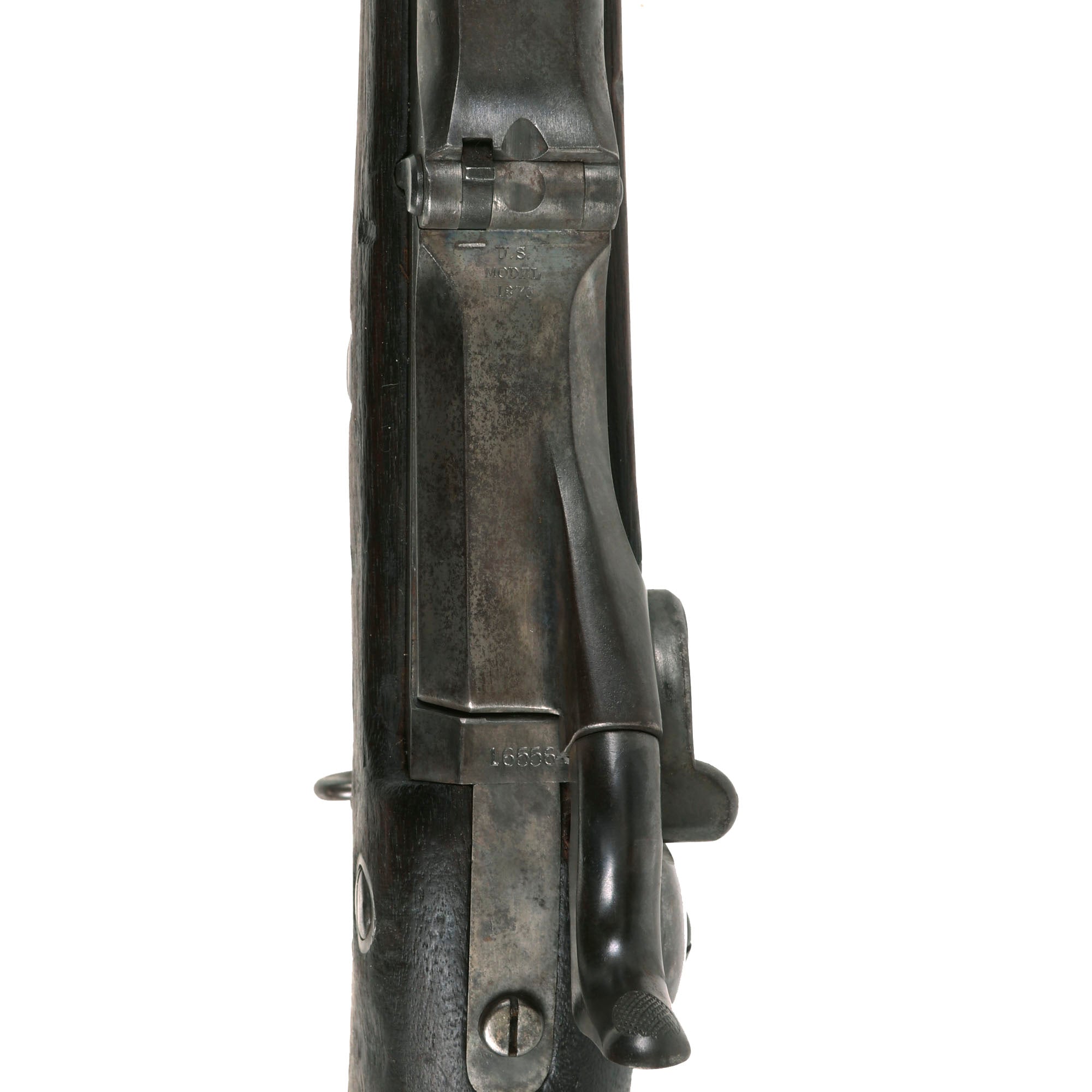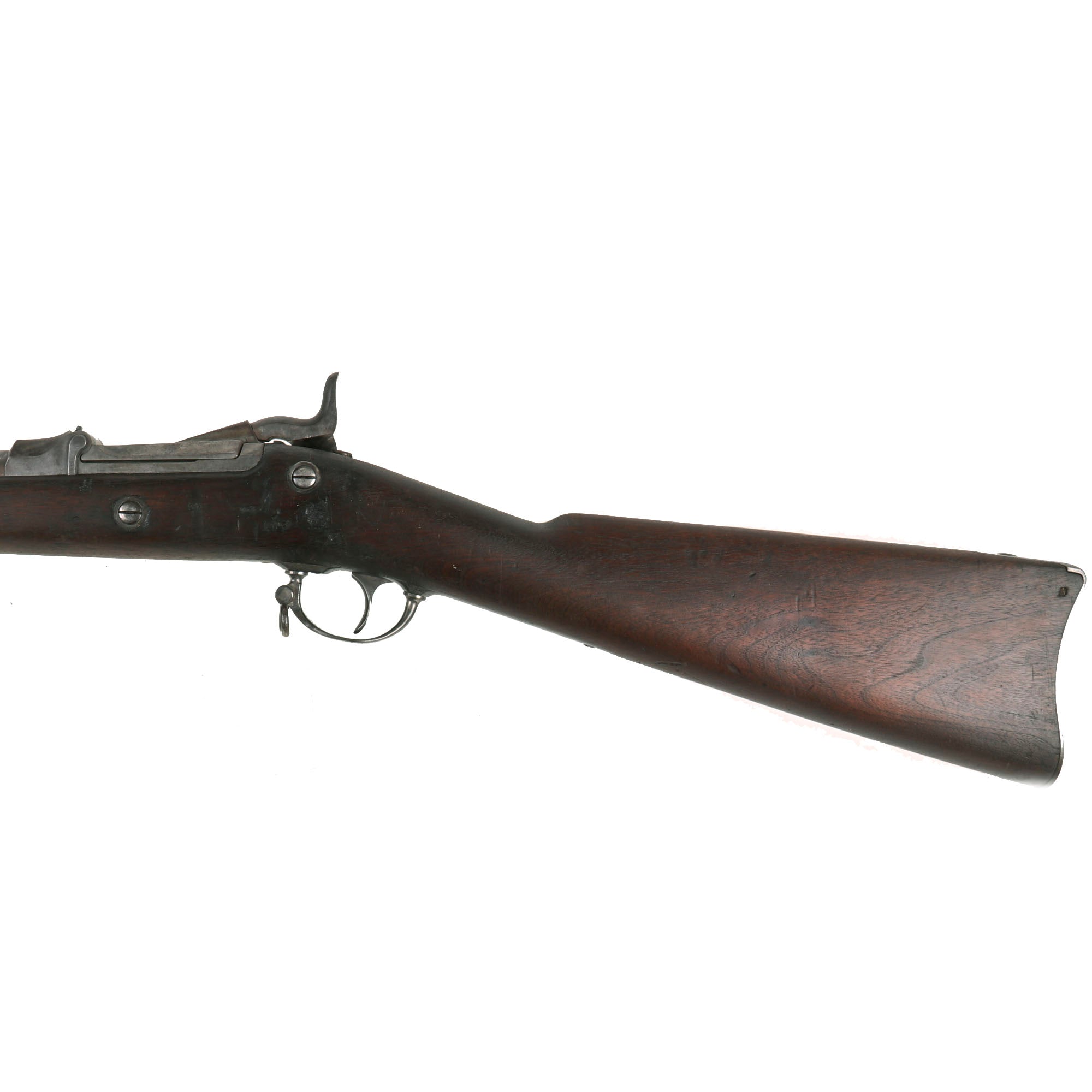 The butt plate is marked U.S. and both barrel bands are U marked. The metal finish is just lovely, showing the original bluing faded to a lovely worn plum patina. The breech block actually still shows lots of the original case hardened finish on the interior, a real rarity, with the exterior having worn to a lovely mottled patina. Center fire breechloader, .45 cal., two bands, two sling swivels with stacking swivel, standard model 1879 sliding sight, and standard ramrod. Lock is marked with a Federal Eagle and U.S. / SPRINGFIELD, indicating that it was manufactured at the United States Armory and Arsenal at Springfield, in Springfield, Massachusetts.