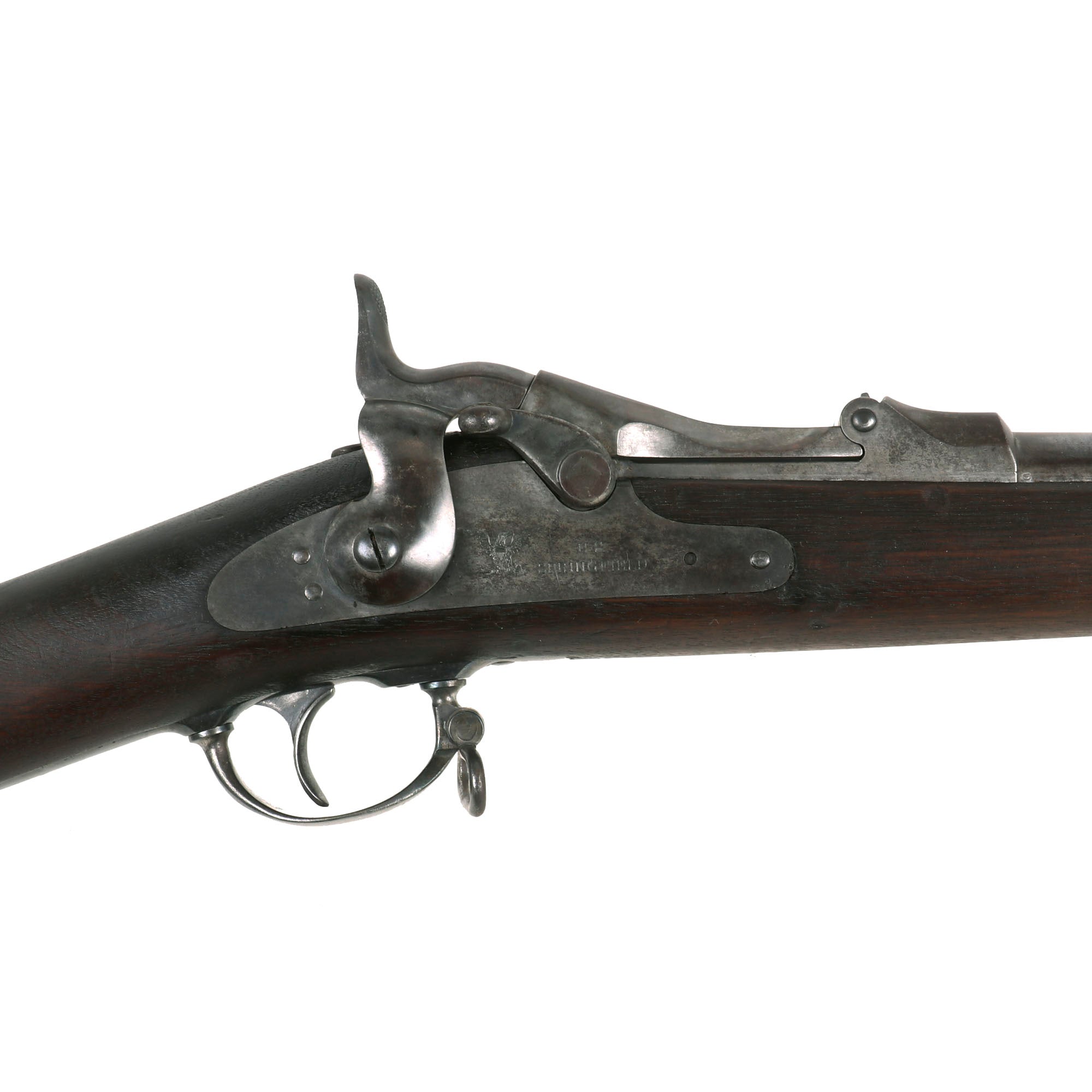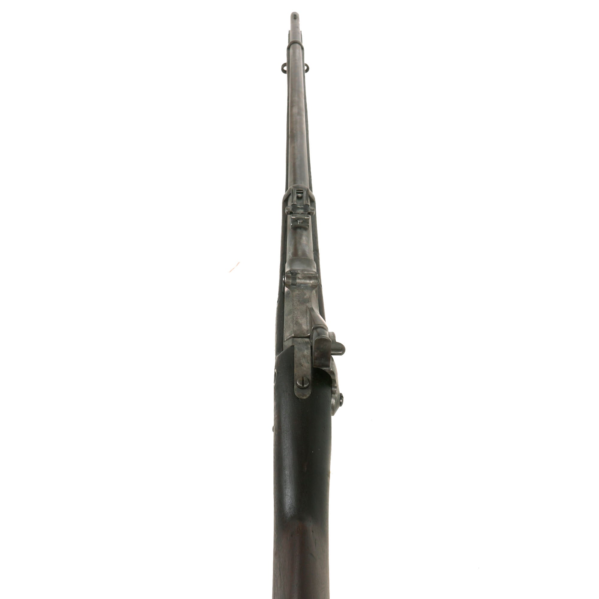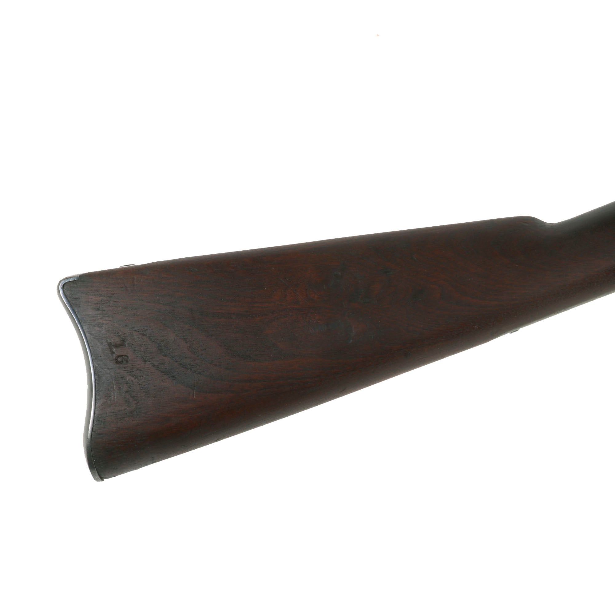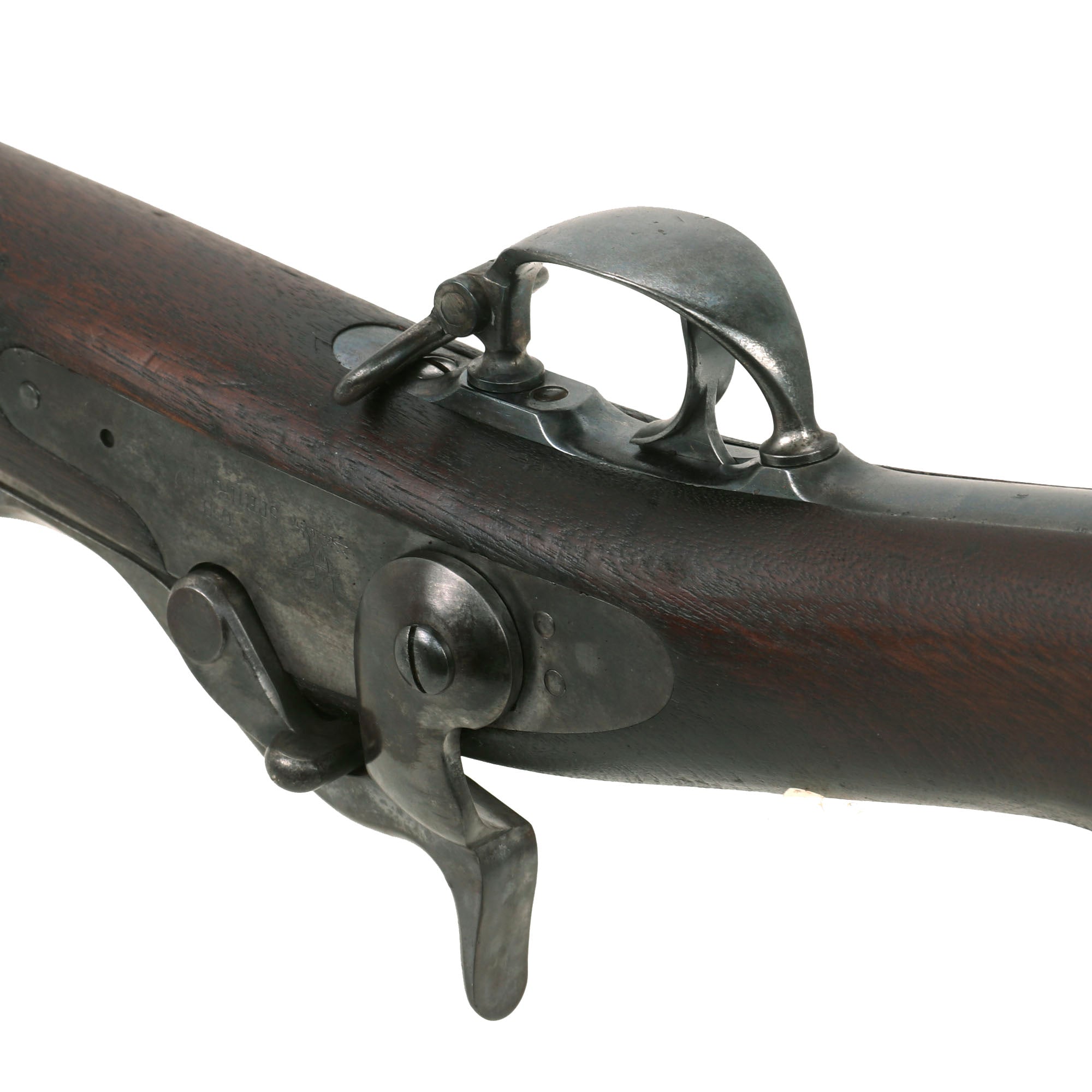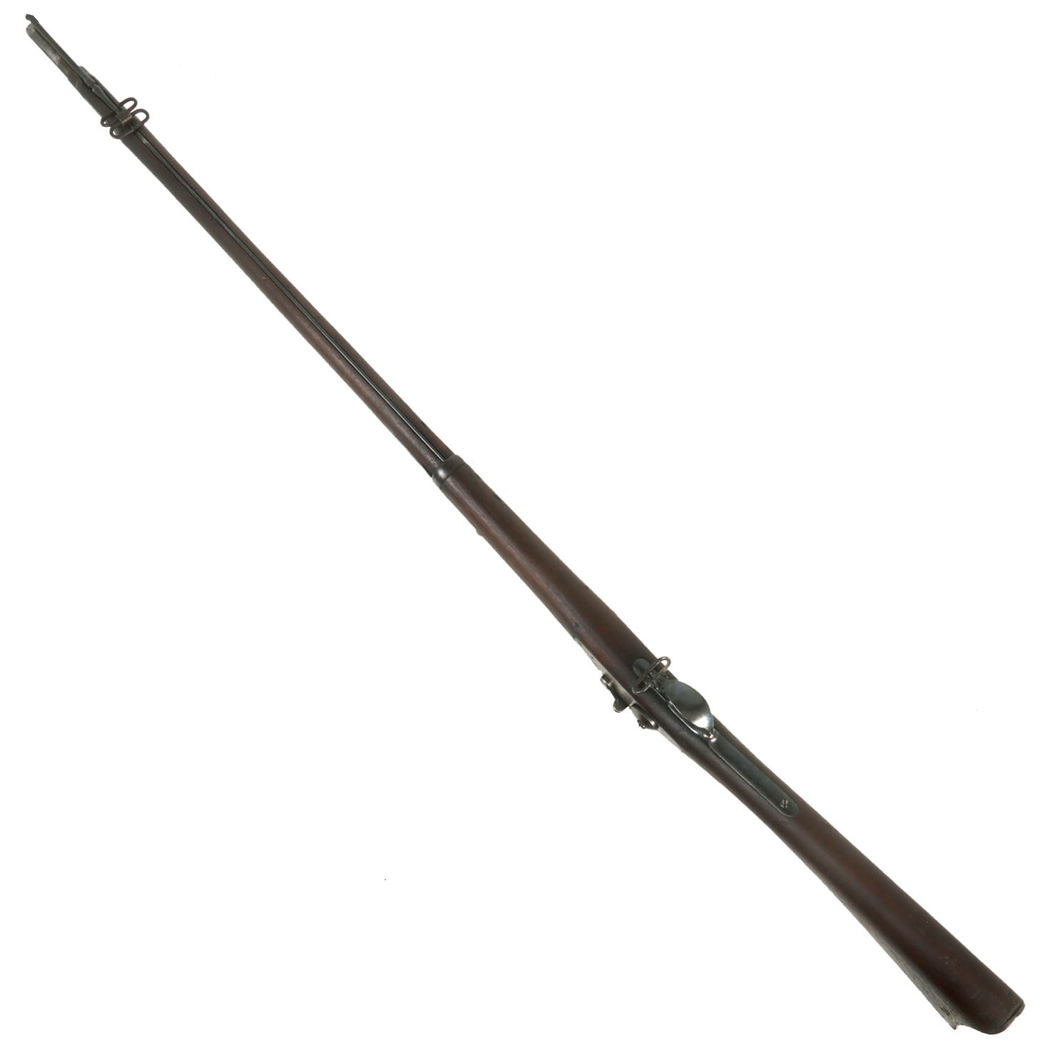 The butt plate is marked U.S. and both barrel bands are U marked. The metal finish is just lovely, showing the original bluing faded to a lovely worn plum patina. The breech block actually still shows lots of the original case hardened finish on the interior, a real rarity, with the exterior having worn to a lovely mottled patina. Center fire breechloader, .45 cal., two bands, two sling swivels with stacking swivel, standard model 1879 sliding sight, and standard ramrod. Lock is marked with a Federal Eagle and U.S. / SPRINGFIELD, indicating that it was manufactured at the United States Armory and Arsenal at Springfield, in Springfield, Massachusetts.