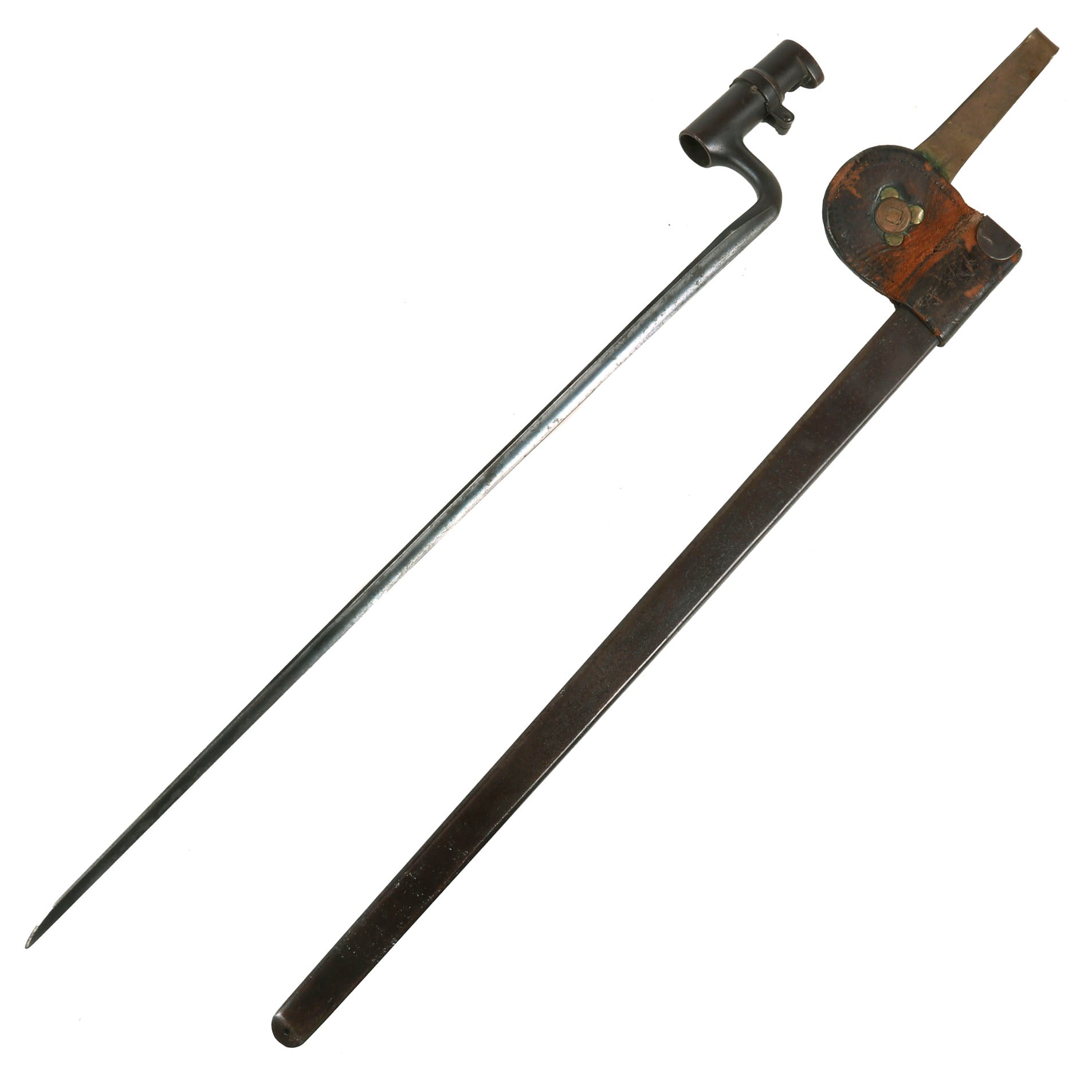 The included bayonet is the classic 1873 style triangular socket bayonet marked U.S., and has retained the original blue finish quite nicely. It is also numbered 175441 on the spine of the blade. There is some wear and finish loss towards the end of the blade, and a few small areas of rust. It comes in its original steel scabbard, complete with a 2nd pattern leather frog and swivel brass hook, with the rosette marked U.S.. Condition of the scabbard is very good, with no major dents or bends, and the frog has a lovely aged look. The brass hook is a bit bent, and the swivel is currently stiff.