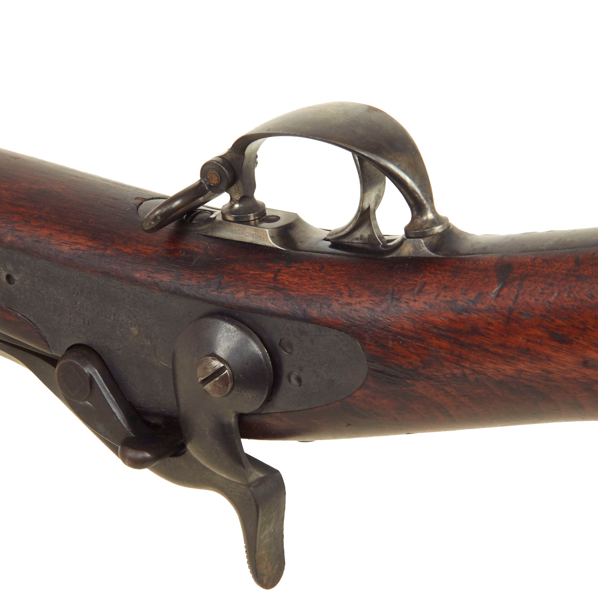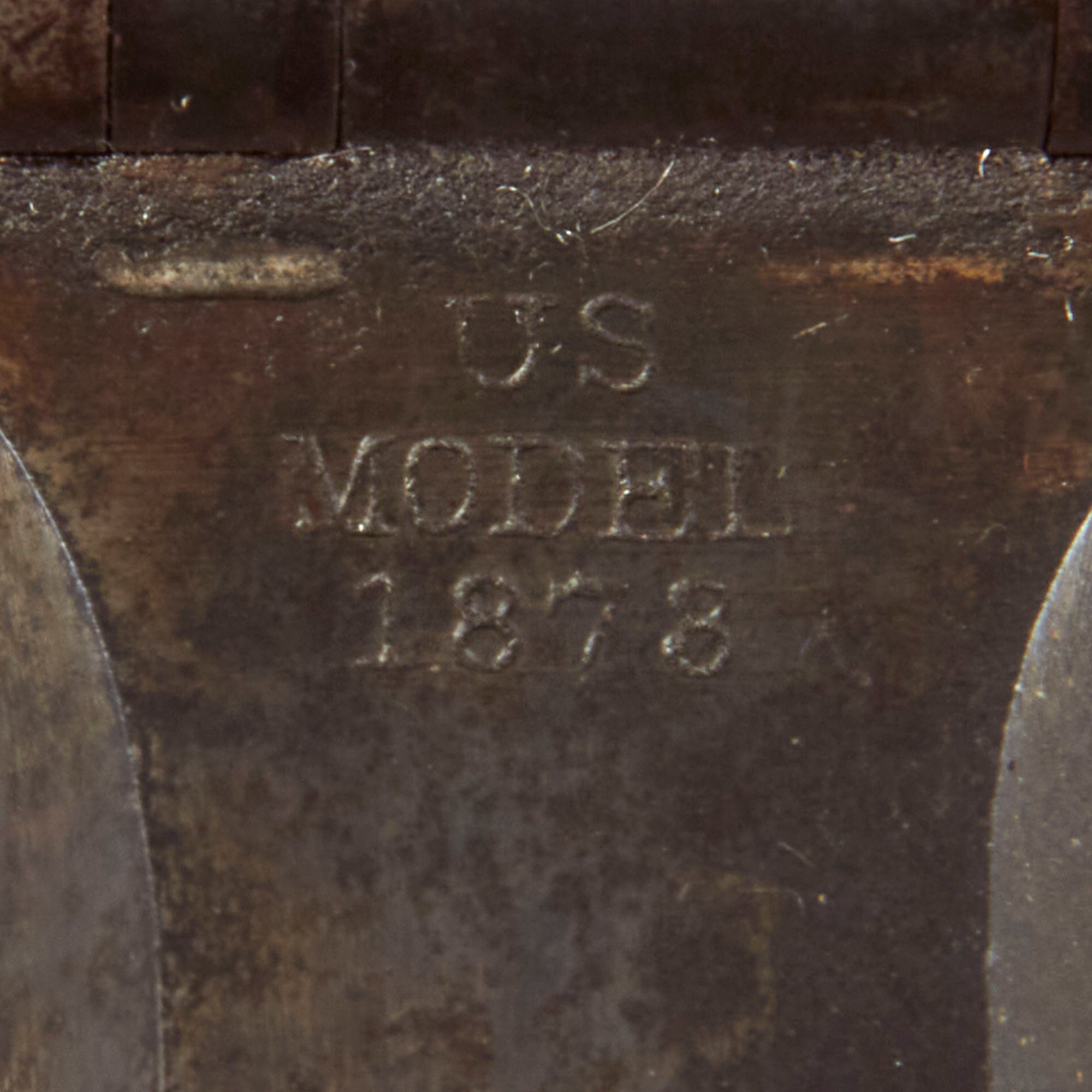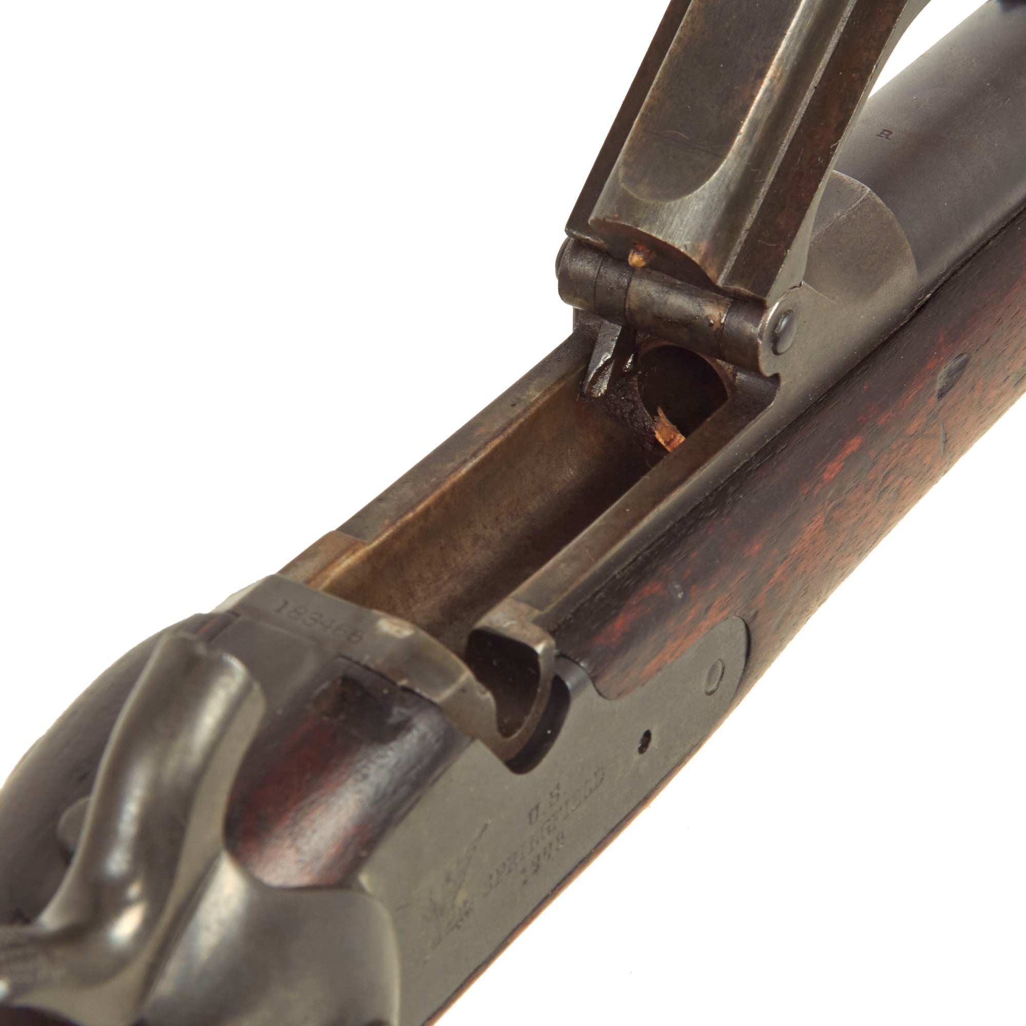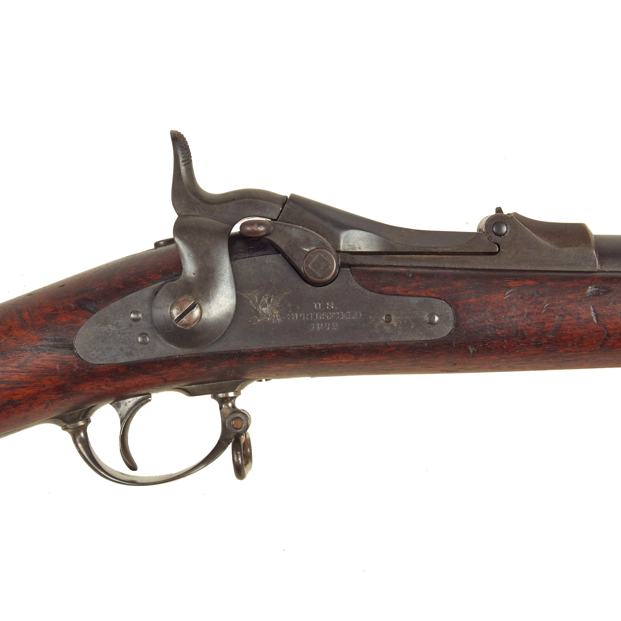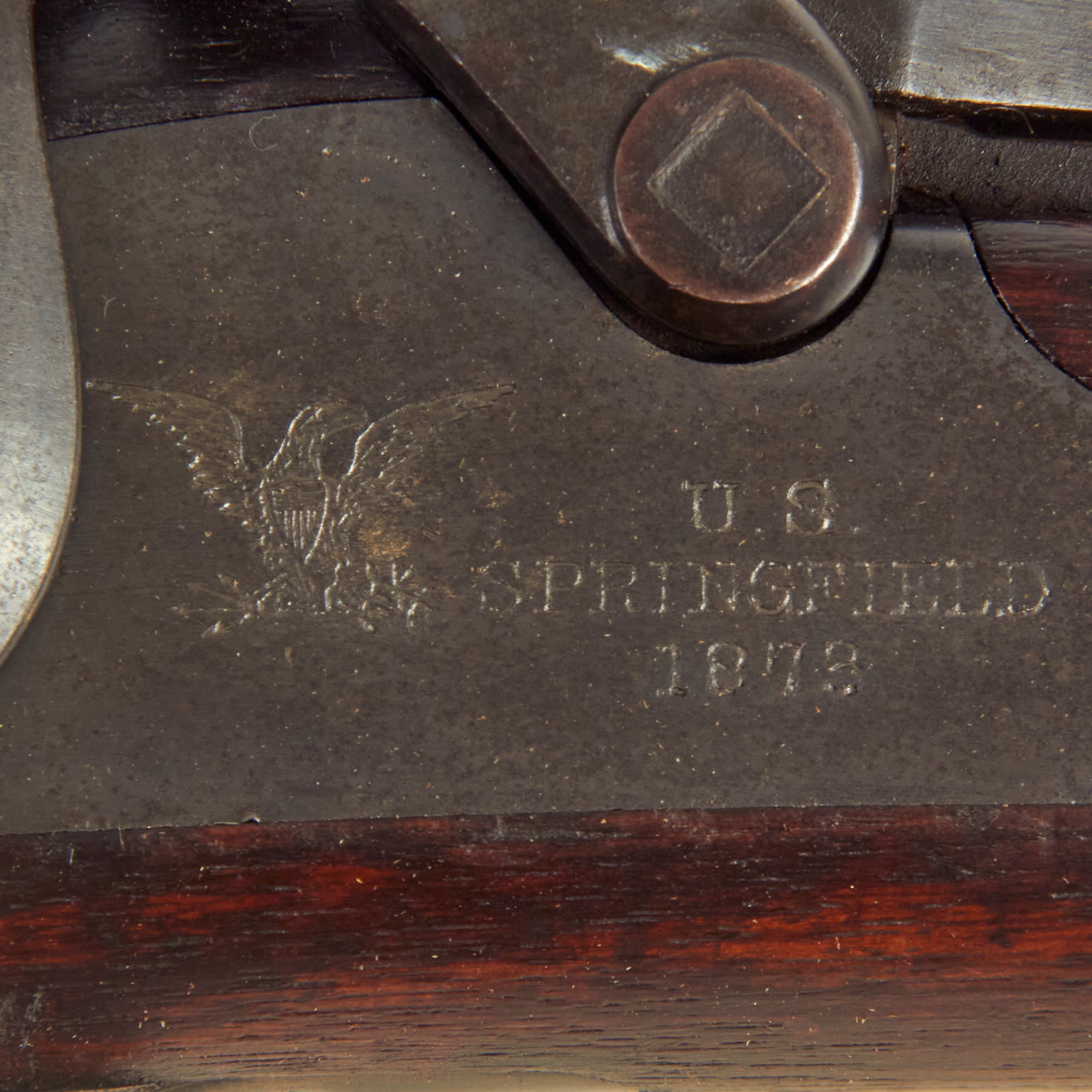 The butt plate is marked U.S. and both barrel bands are U marked. The overall metal finish still shows some of the original bluing, with the balance mostly showing a dark gray oxidized patina. Center fire breechloader, .45 cal., two bands, two sling swivels with stacking swivel, standard model 1879 sliding sight, and standard ramrod. Lock is marked with a Federal Eagle and U.S. / SPRINGFIELD / 1873, indicating that it was manufactured at the United States Armory and Arsenal at Springfield, in Springfield, Massachusetts. This is an early pattern lock plate, but it has the correct three notch tumbler, and was most likely fit onto this rifle as an arsenal replacement.